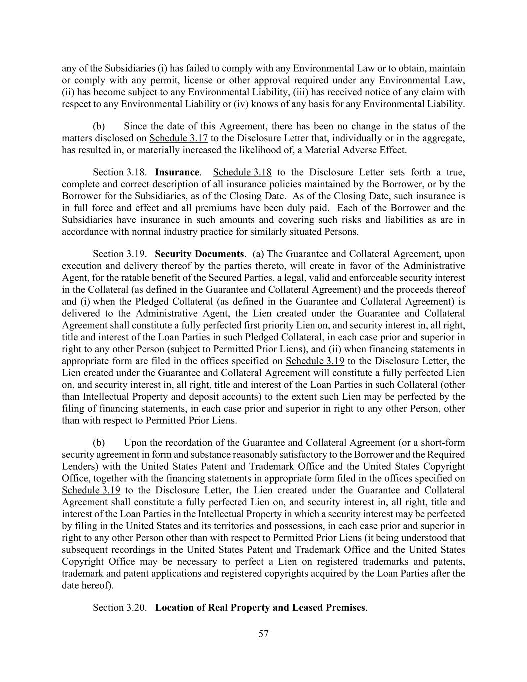 57 any of the Subsidiaries (i) has failed to comply with any Environmental Law or to obtain, maintain or comply with any permit, license or other approval required under any Environmental Law, (ii) has become subject to any Environmental Liability, (iii) has received notice of any claim with respect to any Environmental Liability or (iv) knows of any basis for any Environmental Liability. (b) Since the date of this Agreement, there has been no change in the status of the matters disclosed on Schedule 3.17 to the Disclosure Letter that, individually or in the aggregate, has resulted in, or materially increased the likelihood of, a Material Adverse Effect. Section 3.18. Insurance. Schedule 3.18 to the Disclosure Letter sets forth a true, complete and correct description of all insurance policies maintained by the Borrower, or by the Borrower for the Subsidiaries, as of the Closing Date. As of the Closing Date, such insurance is in full force and effect and all premiums have been duly paid. Each of the Borrower and the Subsidiaries have insurance in such amounts and covering such risks and liabilities as are in accordance with normal industry practice for similarly situated Persons. Section 3.19. Security Documents. (a) The Guarantee and Collateral Agreement, upon execution and delivery thereof by the parties thereto, will create in favor of the Administrative Agent, for the ratable benefit of the Secured Parties, a legal, valid and enforceable security interest in the Collateral (as defined in the Guarantee and Collateral Agreement) and the proceeds thereof and (i) when the Pledged Collateral (as defined in the Guarantee and Collateral Agreement) is delivered to the Administrative Agent, the Lien created under the Guarantee and Collateral Agreement shall constitute a fully perfected first priority Lien on, and security interest in, all right, title and interest of the Loan Parties in such Pledged Collateral, in each case prior and superior in right to any other Person (subject to Permitted Prior Liens), and (ii) when financing statements in appropriate form are filed in the offices specified on Schedule 3.19 to the Disclosure Letter, the Lien created under the Guarantee and Collateral Agreement will constitute a fully perfected Lien on, and security interest in, all right, title and interest of the Loan Parties in such Collateral (other than Intellectual Property and deposit accounts) to the extent such Lien may be perfected by the filing of financing statements, in each case prior and superior in right to any other Person, other than with respect to Permitted Prior Liens. (b) Upon the recordation of the Guarantee and Collateral Agreement (or a short-form security agreement in form and substance reasonably satisfactory to the Borrower and the Required Lenders) with the United States Patent and Trademark Office and the United States Copyright Office, together with the financing statements in appropriate form filed in the offices specified on Schedule 3.19 to the Disclosure Letter, the Lien created under the Guarantee and Collateral Agreement shall constitute a fully perfected Lien on, and security interest in, all right, title and interest of the Loan Parties in the Intellectual Property in which a security interest may be perfected by filing in the United States and its territories and possessions, in each case prior and superior in right to any other Person other than with respect to Permitted Prior Liens (it being understood that subsequent recordings in the United States Patent and Trademark Office and the United States Copyright Office may be necessary to perfect a Lien on registered trademarks and patents, trademark and patent applications and registered copyrights acquired by the Loan Parties after the date hereof). Section 3.20. Location of Real Property and Leased Premises.