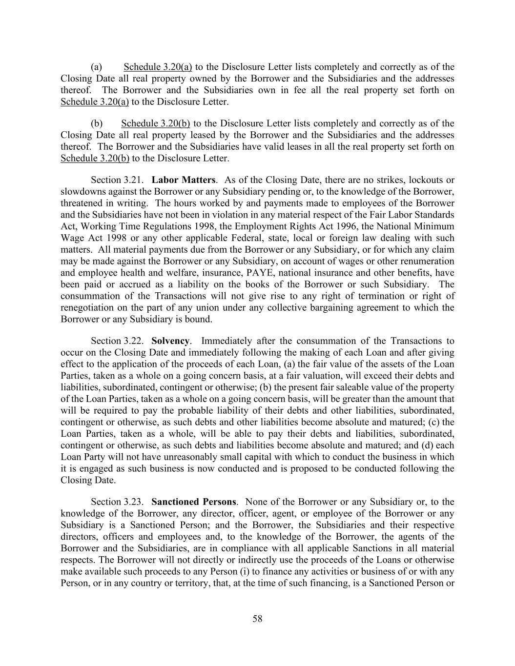 58 (a) Schedule 3.20(a) to the Disclosure Letter lists completely and correctly as of the Closing Date all real property owned by the Borrower and the Subsidiaries and the addresses thereof. The Borrower and the Subsidiaries own in fee all the real property set forth on Schedule 3.20(a) to the Disclosure Letter. (b) Schedule 3.20(b) to the Disclosure Letter lists completely and correctly as of the Closing Date all real property leased by the Borrower and the Subsidiaries and the addresses thereof. The Borrower and the Subsidiaries have valid leases in all the real property set forth on Schedule 3.20(b) to the Disclosure Letter. Section 3.21. Labor Matters. As of the Closing Date, there are no strikes, lockouts or slowdowns against the Borrower or any Subsidiary pending or, to the knowledge of the Borrower, threatened in writing. The hours worked by and payments made to employees of the Borrower and the Subsidiaries have not been in violation in any material respect of the Fair Labor Standards Act, Working Time Regulations 1998, the Employment Rights Act 1996, the National Minimum Wage Act 1998 or any other applicable Federal, state, local or foreign law dealing with such matters. All material payments due from the Borrower or any Subsidiary, or for which any claim may be made against the Borrower or any Subsidiary, on account of wages or other renumeration and employee health and welfare, insurance, PAYE, national insurance and other benefits, have been paid or accrued as a liability on the books of the Borrower or such Subsidiary. The consummation of the Transactions will not give rise to any right of termination or right of renegotiation on the part of any union under any collective bargaining agreement to which the Borrower or any Subsidiary is bound. Section 3.22. Solvency. Immediately after the consummation of the Transactions to occur on the Closing Date and immediately following the making of each Loan and after giving effect to the application of the proceeds of each Loan, (a) the fair value of the assets of the Loan Parties, taken as a whole on a going concern basis, at a fair valuation, will exceed their debts and liabilities, subordinated, contingent or otherwise; (b) the present fair saleable value of the property of the Loan Parties, taken as a whole on a going concern basis, will be greater than the amount that will be required to pay the probable liability of their debts and other liabilities, subordinated, contingent or otherwise, as such debts and other liabilities become absolute and matured; (c) the Loan Parties, taken as a whole, will be able to pay their debts and liabilities, subordinated, contingent or otherwise, as such debts and liabilities become absolute and matured; and (d) each Loan Party will not have unreasonably small capital with which to conduct the business in which it is engaged as such business is now conducted and is proposed to be conducted following the Closing Date. Section 3.23. Sanctioned Persons. None of the Borrower or any Subsidiary or, to the knowledge of the Borrower, any director, officer, agent, or employee of the Borrower or any Subsidiary is a Sanctioned Person; and the Borrower, the Subsidiaries and their respective directors, officers and employees and, to the knowledge of the Borrower, the agents of the Borrower and the Subsidiaries, are in compliance with all applicable Sanctions in all material respects. The Borrower will not directly or indirectly use the proceeds of the Loans or otherwise make available such proceeds to any Person (i) to finance any activities or business of or with any Person, or in any country or territory, that, at the time of such financing, is a Sanctioned Person or