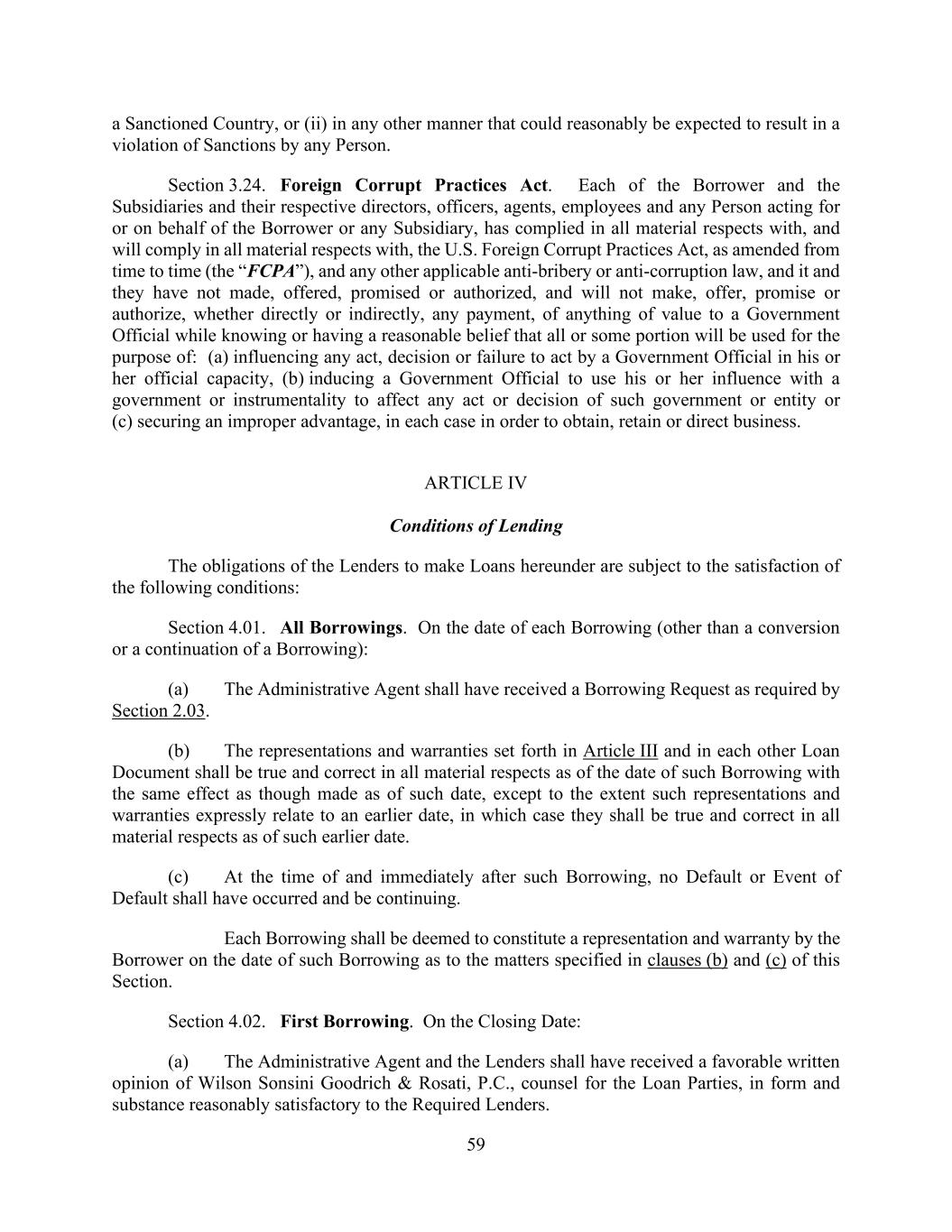 59 a Sanctioned Country, or (ii) in any other manner that could reasonably be expected to result in a violation of Sanctions by any Person. Section 3.24. Foreign Corrupt Practices Act. Each of the Borrower and the Subsidiaries and their respective directors, officers, agents, employees and any Person acting for or on behalf of the Borrower or any Subsidiary, has complied in all material respects with, and will comply in all material respects with, the U.S. Foreign Corrupt Practices Act, as amended from time to time (the “FCPA”), and any other applicable anti-bribery or anti-corruption law, and it and they have not made, offered, promised or authorized, and will not make, offer, promise or authorize, whether directly or indirectly, any payment, of anything of value to a Government Official while knowing or having a reasonable belief that all or some portion will be used for the purpose of: (a) influencing any act, decision or failure to act by a Government Official in his or her official capacity, (b) inducing a Government Official to use his or her influence with a government or instrumentality to affect any act or decision of such government or entity or (c) securing an improper advantage, in each case in order to obtain, retain or direct business. ARTICLE IV Conditions of Lending The obligations of the Lenders to make Loans hereunder are subject to the satisfaction of the following conditions: Section 4.01. All Borrowings. On the date of each Borrowing (other than a conversion or a continuation of a Borrowing): (a) The Administrative Agent shall have received a Borrowing Request as required by Section 2.03. (b) The representations and warranties set forth in Article III and in each other Loan Document shall be true and correct in all material respects as of the date of such Borrowing with the same effect as though made as of such date, except to the extent such representations and warranties expressly relate to an earlier date, in which case they shall be true and correct in all material respects as of such earlier date. (c) At the time of and immediately after such Borrowing, no Default or Event of Default shall have occurred and be continuing. Each Borrowing shall be deemed to constitute a representation and warranty by the Borrower on the date of such Borrowing as to the matters specified in clauses (b) and (c) of this Section. Section 4.02. First Borrowing. On the Closing Date: (a) The Administrative Agent and the Lenders shall have received a favorable written opinion of Wilson Sonsini Goodrich & Rosati, P.C., counsel for the Loan Parties, in form and substance reasonably satisfactory to the Required Lenders.