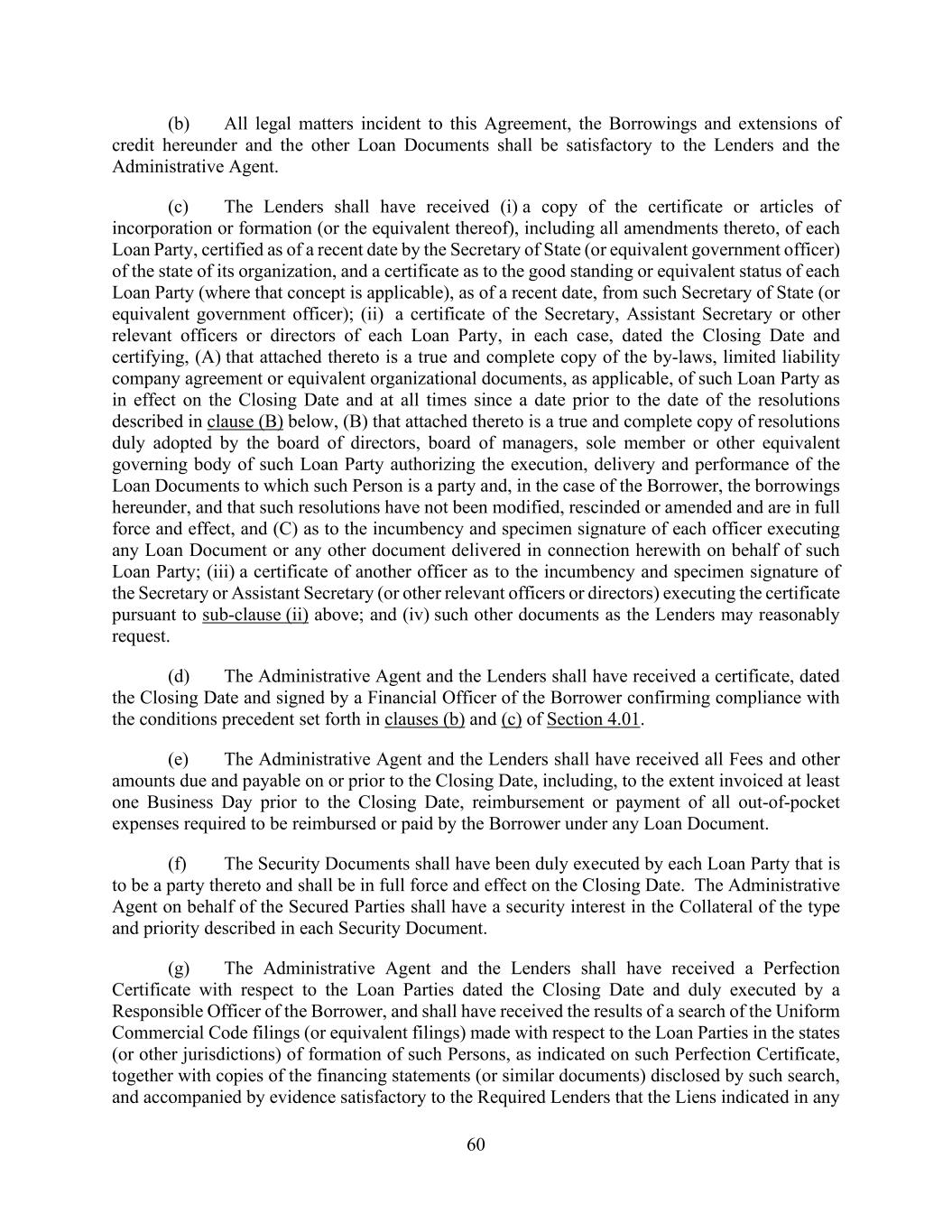 60 (b) All legal matters incident to this Agreement, the Borrowings and extensions of credit hereunder and the other Loan Documents shall be satisfactory to the Lenders and the Administrative Agent. (c) The Lenders shall have received (i) a copy of the certificate or articles of incorporation or formation (or the equivalent thereof), including all amendments thereto, of each Loan Party, certified as of a recent date by the Secretary of State (or equivalent government officer) of the state of its organization, and a certificate as to the good standing or equivalent status of each Loan Party (where that concept is applicable), as of a recent date, from such Secretary of State (or equivalent government officer); (ii) a certificate of the Secretary, Assistant Secretary or other relevant officers or directors of each Loan Party, in each case, dated the Closing Date and certifying, (A) that attached thereto is a true and complete copy of the by-laws, limited liability company agreement or equivalent organizational documents, as applicable, of such Loan Party as in effect on the Closing Date and at all times since a date prior to the date of the resolutions described in clause (B) below, (B) that attached thereto is a true and complete copy of resolutions duly adopted by the board of directors, board of managers, sole member or other equivalent governing body of such Loan Party authorizing the execution, delivery and performance of the Loan Documents to which such Person is a party and, in the case of the Borrower, the borrowings hereunder, and that such resolutions have not been modified, rescinded or amended and are in full force and effect, and (C) as to the incumbency and specimen signature of each officer executing any Loan Document or any other document delivered in connection herewith on behalf of such Loan Party; (iii) a certificate of another officer as to the incumbency and specimen signature of the Secretary or Assistant Secretary (or other relevant officers or directors) executing the certificate pursuant to sub-clause (ii) above; and (iv) such other documents as the Lenders may reasonably request. (d) The Administrative Agent and the Lenders shall have received a certificate, dated the Closing Date and signed by a Financial Officer of the Borrower confirming compliance with the conditions precedent set forth in clauses (b) and (c) of Section 4.01. (e) The Administrative Agent and the Lenders shall have received all Fees and other amounts due and payable on or prior to the Closing Date, including, to the extent invoiced at least one Business Day prior to the Closing Date, reimbursement or payment of all out-of-pocket expenses required to be reimbursed or paid by the Borrower under any Loan Document. (f) The Security Documents shall have been duly executed by each Loan Party that is to be a party thereto and shall be in full force and effect on the Closing Date. The Administrative Agent on behalf of the Secured Parties shall have a security interest in the Collateral of the type and priority described in each Security Document. (g) The Administrative Agent and the Lenders shall have received a Perfection Certificate with respect to the Loan Parties dated the Closing Date and duly executed by a Responsible Officer of the Borrower, and shall have received the results of a search of the Uniform Commercial Code filings (or equivalent filings) made with respect to the Loan Parties in the states (or other jurisdictions) of formation of such Persons, as indicated on such Perfection Certificate, together with copies of the financing statements (or similar documents) disclosed by such search, and accompanied by evidence satisfactory to the Required Lenders that the Liens indicated in any