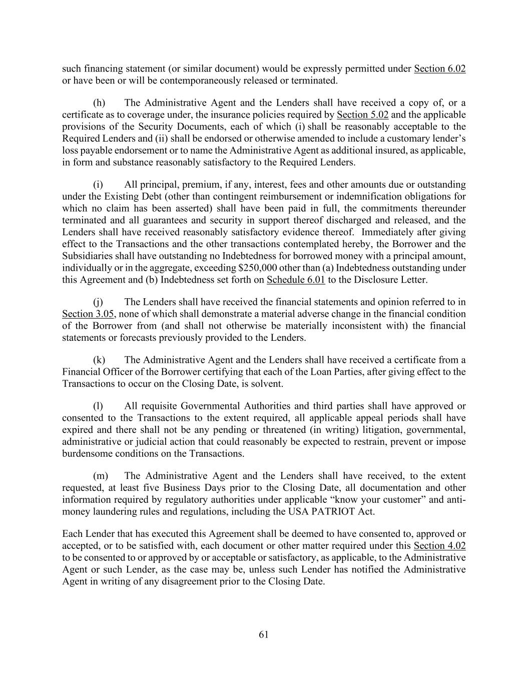 61 such financing statement (or similar document) would be expressly permitted under Section 6.02 or have been or will be contemporaneously released or terminated. (h) The Administrative Agent and the Lenders shall have received a copy of, or a certificate as to coverage under, the insurance policies required by Section 5.02 and the applicable provisions of the Security Documents, each of which (i) shall be reasonably acceptable to the Required Lenders and (ii) shall be endorsed or otherwise amended to include a customary lender’s loss payable endorsement or to name the Administrative Agent as additional insured, as applicable, in form and substance reasonably satisfactory to the Required Lenders. (i) All principal, premium, if any, interest, fees and other amounts due or outstanding under the Existing Debt (other than contingent reimbursement or indemnification obligations for which no claim has been asserted) shall have been paid in full, the commitments thereunder terminated and all guarantees and security in support thereof discharged and released, and the Lenders shall have received reasonably satisfactory evidence thereof. Immediately after giving effect to the Transactions and the other transactions contemplated hereby, the Borrower and the Subsidiaries shall have outstanding no Indebtedness for borrowed money with a principal amount, individually or in the aggregate, exceeding $250,000 other than (a) Indebtedness outstanding under this Agreement and (b) Indebtedness set forth on Schedule 6.01 to the Disclosure Letter. (j) The Lenders shall have received the financial statements and opinion referred to in Section 3.05, none of which shall demonstrate a material adverse change in the financial condition of the Borrower from (and shall not otherwise be materially inconsistent with) the financial statements or forecasts previously provided to the Lenders. (k) The Administrative Agent and the Lenders shall have received a certificate from a Financial Officer of the Borrower certifying that each of the Loan Parties, after giving effect to the Transactions to occur on the Closing Date, is solvent. (l) All requisite Governmental Authorities and third parties shall have approved or consented to the Transactions to the extent required, all applicable appeal periods shall have expired and there shall not be any pending or threatened (in writing) litigation, governmental, administrative or judicial action that could reasonably be expected to restrain, prevent or impose burdensome conditions on the Transactions. (m) The Administrative Agent and the Lenders shall have received, to the extent requested, at least five Business Days prior to the Closing Date, all documentation and other information required by regulatory authorities under applicable “know your customer” and anti- money laundering rules and regulations, including the USA PATRIOT Act. Each Lender that has executed this Agreement shall be deemed to have consented to, approved or accepted, or to be satisfied with, each document or other matter required under this Section 4.02 to be consented to or approved by or acceptable or satisfactory, as applicable, to the Administrative Agent or such Lender, as the case may be, unless such Lender has notified the Administrative Agent in writing of any disagreement prior to the Closing Date.