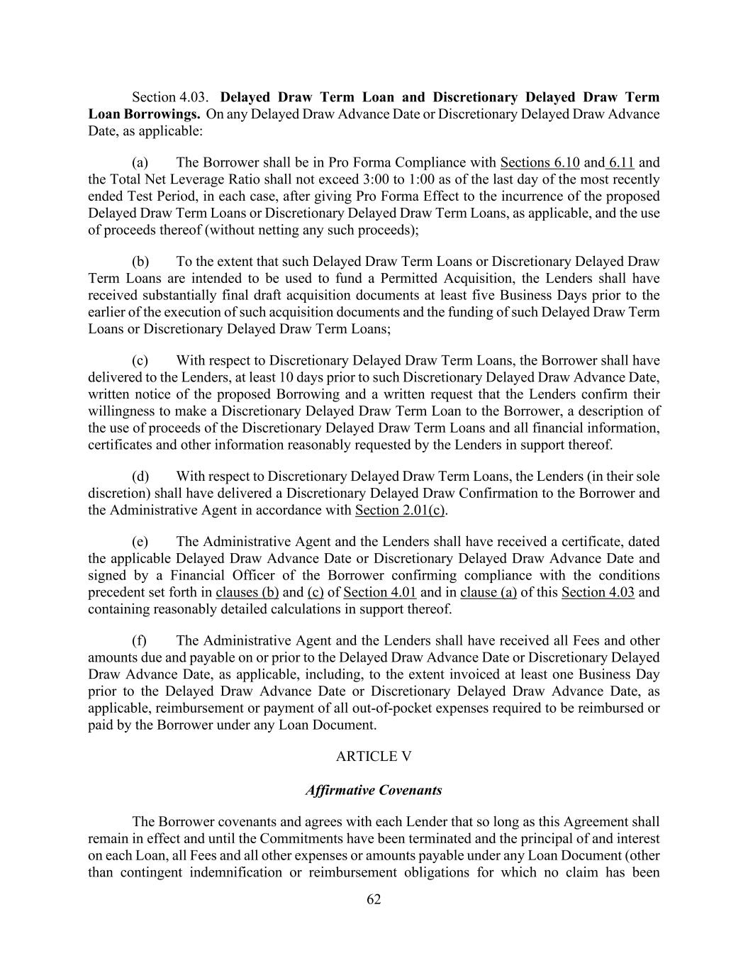 62 Section 4.03. Delayed Draw Term Loan and Discretionary Delayed Draw Term Loan Borrowings. On any Delayed Draw Advance Date or Discretionary Delayed Draw Advance Date, as applicable: (a) The Borrower shall be in Pro Forma Compliance with Sections 6.10 and 6.11 and the Total Net Leverage Ratio shall not exceed 3:00 to 1:00 as of the last day of the most recently ended Test Period, in each case, after giving Pro Forma Effect to the incurrence of the proposed Delayed Draw Term Loans or Discretionary Delayed Draw Term Loans, as applicable, and the use of proceeds thereof (without netting any such proceeds); (b) To the extent that such Delayed Draw Term Loans or Discretionary Delayed Draw Term Loans are intended to be used to fund a Permitted Acquisition, the Lenders shall have received substantially final draft acquisition documents at least five Business Days prior to the earlier of the execution of such acquisition documents and the funding of such Delayed Draw Term Loans or Discretionary Delayed Draw Term Loans; (c) With respect to Discretionary Delayed Draw Term Loans, the Borrower shall have delivered to the Lenders, at least 10 days prior to such Discretionary Delayed Draw Advance Date, written notice of the proposed Borrowing and a written request that the Lenders confirm their willingness to make a Discretionary Delayed Draw Term Loan to the Borrower, a description of the use of proceeds of the Discretionary Delayed Draw Term Loans and all financial information, certificates and other information reasonably requested by the Lenders in support thereof. (d) With respect to Discretionary Delayed Draw Term Loans, the Lenders (in their sole discretion) shall have delivered a Discretionary Delayed Draw Confirmation to the Borrower and the Administrative Agent in accordance with Section 2.01(c). (e) The Administrative Agent and the Lenders shall have received a certificate, dated the applicable Delayed Draw Advance Date or Discretionary Delayed Draw Advance Date and signed by a Financial Officer of the Borrower confirming compliance with the conditions precedent set forth in clauses (b) and (c) of Section 4.01 and in clause (a) of this Section 4.03 and containing reasonably detailed calculations in support thereof. (f) The Administrative Agent and the Lenders shall have received all Fees and other amounts due and payable on or prior to the Delayed Draw Advance Date or Discretionary Delayed Draw Advance Date, as applicable, including, to the extent invoiced at least one Business Day prior to the Delayed Draw Advance Date or Discretionary Delayed Draw Advance Date, as applicable, reimbursement or payment of all out-of-pocket expenses required to be reimbursed or paid by the Borrower under any Loan Document. ARTICLE V Affirmative Covenants The Borrower covenants and agrees with each Lender that so long as this Agreement shall remain in effect and until the Commitments have been terminated and the principal of and interest on each Loan, all Fees and all other expenses or amounts payable under any Loan Document (other than contingent indemnification or reimbursement obligations for which no claim has been