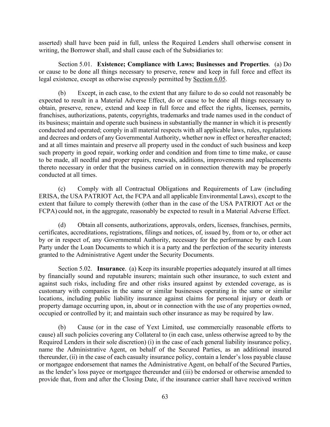 63 asserted) shall have been paid in full, unless the Required Lenders shall otherwise consent in writing, the Borrower shall, and shall cause each of the Subsidiaries to: Section 5.01. Existence; Compliance with Laws; Businesses and Properties. (a) Do or cause to be done all things necessary to preserve, renew and keep in full force and effect its legal existence, except as otherwise expressly permitted by Section 6.05. (b) Except, in each case, to the extent that any failure to do so could not reasonably be expected to result in a Material Adverse Effect, do or cause to be done all things necessary to obtain, preserve, renew, extend and keep in full force and effect the rights, licenses, permits, franchises, authorizations, patents, copyrights, trademarks and trade names used in the conduct of its business; maintain and operate such business in substantially the manner in which it is presently conducted and operated; comply in all material respects with all applicable laws, rules, regulations and decrees and orders of any Governmental Authority, whether now in effect or hereafter enacted; and at all times maintain and preserve all property used in the conduct of such business and keep such property in good repair, working order and condition and from time to time make, or cause to be made, all needful and proper repairs, renewals, additions, improvements and replacements thereto necessary in order that the business carried on in connection therewith may be properly conducted at all times. (c) Comply with all Contractual Obligations and Requirements of Law (including ERISA, the USA PATRIOT Act, the FCPA and all applicable Environmental Laws), except to the extent that failure to comply therewith (other than in the case of the USA PATRIOT Act or the FCPA) could not, in the aggregate, reasonably be expected to result in a Material Adverse Effect. (d) Obtain all consents, authorizations, approvals, orders, licenses, franchises, permits, certificates, accreditations, registrations, filings and notices, of, issued by, from or to, or other act by or in respect of, any Governmental Authority, necessary for the performance by each Loan Party under the Loan Documents to which it is a party and the perfection of the security interests granted to the Administrative Agent under the Security Documents. Section 5.02. Insurance. (a) Keep its insurable properties adequately insured at all times by financially sound and reputable insurers; maintain such other insurance, to such extent and against such risks, including fire and other risks insured against by extended coverage, as is customary with companies in the same or similar businesses operating in the same or similar locations, including public liability insurance against claims for personal injury or death or property damage occurring upon, in, about or in connection with the use of any properties owned, occupied or controlled by it; and maintain such other insurance as may be required by law. (b) Cause (or in the case of Yext Limited, use commercially reasonable efforts to cause) all such policies covering any Collateral to (in each case, unless otherwise agreed to by the Required Lenders in their sole discretion) (i) in the case of each general liability insurance policy, name the Administrative Agent, on behalf of the Secured Parties, as an additional insured thereunder, (ii) in the case of each casualty insurance policy, contain a lender’s loss payable clause or mortgagee endorsement that names the Administrative Agent, on behalf of the Secured Parties, as the lender’s loss payee or mortgagee thereunder and (iii) be endorsed or otherwise amended to provide that, from and after the Closing Date, if the insurance carrier shall have received written