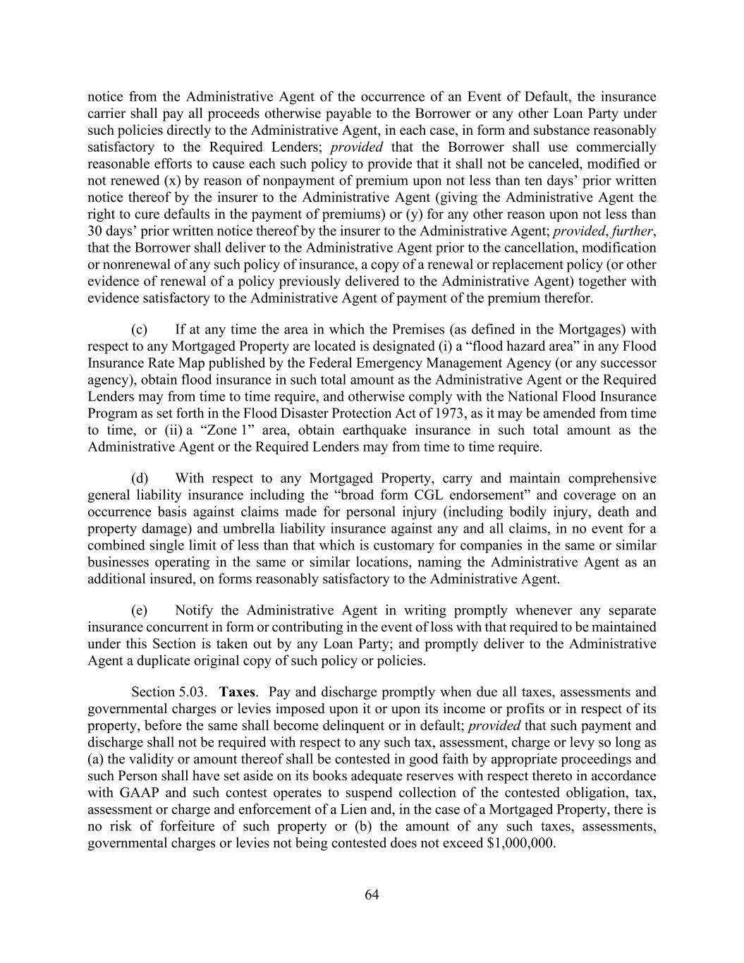 64 notice from the Administrative Agent of the occurrence of an Event of Default, the insurance carrier shall pay all proceeds otherwise payable to the Borrower or any other Loan Party under such policies directly to the Administrative Agent, in each case, in form and substance reasonably satisfactory to the Required Lenders; provided that the Borrower shall use commercially reasonable efforts to cause each such policy to provide that it shall not be canceled, modified or not renewed (x) by reason of nonpayment of premium upon not less than ten days’ prior written notice thereof by the insurer to the Administrative Agent (giving the Administrative Agent the right to cure defaults in the payment of premiums) or (y) for any other reason upon not less than 30 days’ prior written notice thereof by the insurer to the Administrative Agent; provided, further, that the Borrower shall deliver to the Administrative Agent prior to the cancellation, modification or nonrenewal of any such policy of insurance, a copy of a renewal or replacement policy (or other evidence of renewal of a policy previously delivered to the Administrative Agent) together with evidence satisfactory to the Administrative Agent of payment of the premium therefor. (c) If at any time the area in which the Premises (as defined in the Mortgages) with respect to any Mortgaged Property are located is designated (i) a “flood hazard area” in any Flood Insurance Rate Map published by the Federal Emergency Management Agency (or any successor agency), obtain flood insurance in such total amount as the Administrative Agent or the Required Lenders may from time to time require, and otherwise comply with the National Flood Insurance Program as set forth in the Flood Disaster Protection Act of 1973, as it may be amended from time to time, or (ii) a “Zone 1” area, obtain earthquake insurance in such total amount as the Administrative Agent or the Required Lenders may from time to time require. (d) With respect to any Mortgaged Property, carry and maintain comprehensive general liability insurance including the “broad form CGL endorsement” and coverage on an occurrence basis against claims made for personal injury (including bodily injury, death and property damage) and umbrella liability insurance against any and all claims, in no event for a combined single limit of less than that which is customary for companies in the same or similar businesses operating in the same or similar locations, naming the Administrative Agent as an additional insured, on forms reasonably satisfactory to the Administrative Agent. (e) Notify the Administrative Agent in writing promptly whenever any separate insurance concurrent in form or contributing in the event of loss with that required to be maintained under this Section is taken out by any Loan Party; and promptly deliver to the Administrative Agent a duplicate original copy of such policy or policies. Section 5.03. Taxes. Pay and discharge promptly when due all taxes, assessments and governmental charges or levies imposed upon it or upon its income or profits or in respect of its property, before the same shall become delinquent or in default; provided that such payment and discharge shall not be required with respect to any such tax, assessment, charge or levy so long as (a) the validity or amount thereof shall be contested in good faith by appropriate proceedings and such Person shall have set aside on its books adequate reserves with respect thereto in accordance with GAAP and such contest operates to suspend collection of the contested obligation, tax, assessment or charge and enforcement of a Lien and, in the case of a Mortgaged Property, there is no risk of forfeiture of such property or (b) the amount of any such taxes, assessments, governmental charges or levies not being contested does not exceed $1,000,000.