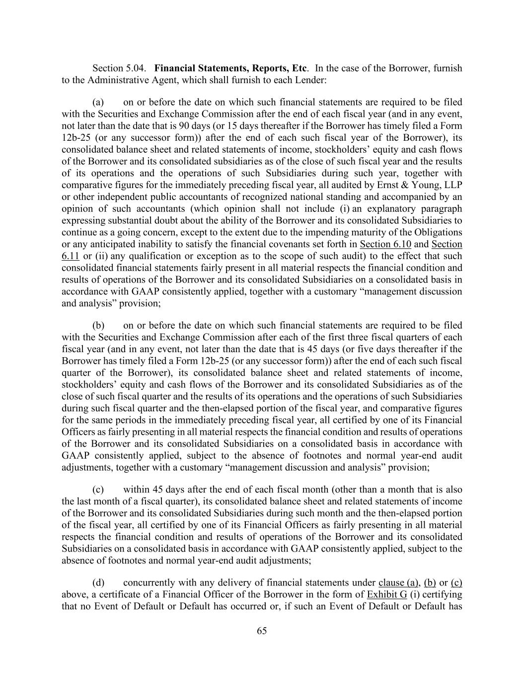 65 Section 5.04. Financial Statements, Reports, Etc. In the case of the Borrower, furnish to the Administrative Agent, which shall furnish to each Lender: (a) on or before the date on which such financial statements are required to be filed with the Securities and Exchange Commission after the end of each fiscal year (and in any event, not later than the date that is 90 days (or 15 days thereafter if the Borrower has timely filed a Form 12b-25 (or any successor form)) after the end of each such fiscal year of the Borrower), its consolidated balance sheet and related statements of income, stockholders’ equity and cash flows of the Borrower and its consolidated subsidiaries as of the close of such fiscal year and the results of its operations and the operations of such Subsidiaries during such year, together with comparative figures for the immediately preceding fiscal year, all audited by Ernst & Young, LLP or other independent public accountants of recognized national standing and accompanied by an opinion of such accountants (which opinion shall not include (i) an explanatory paragraph expressing substantial doubt about the ability of the Borrower and its consolidated Subsidiaries to continue as a going concern, except to the extent due to the impending maturity of the Obligations or any anticipated inability to satisfy the financial covenants set forth in Section 6.10 and Section 6.11 or (ii) any qualification or exception as to the scope of such audit) to the effect that such consolidated financial statements fairly present in all material respects the financial condition and results of operations of the Borrower and its consolidated Subsidiaries on a consolidated basis in accordance with GAAP consistently applied, together with a customary “management discussion and analysis” provision; (b) on or before the date on which such financial statements are required to be filed with the Securities and Exchange Commission after each of the first three fiscal quarters of each fiscal year (and in any event, not later than the date that is 45 days (or five days thereafter if the Borrower has timely filed a Form 12b-25 (or any successor form)) after the end of each such fiscal quarter of the Borrower), its consolidated balance sheet and related statements of income, stockholders’ equity and cash flows of the Borrower and its consolidated Subsidiaries as of the close of such fiscal quarter and the results of its operations and the operations of such Subsidiaries during such fiscal quarter and the then-elapsed portion of the fiscal year, and comparative figures for the same periods in the immediately preceding fiscal year, all certified by one of its Financial Officers as fairly presenting in all material respects the financial condition and results of operations of the Borrower and its consolidated Subsidiaries on a consolidated basis in accordance with GAAP consistently applied, subject to the absence of footnotes and normal year-end audit adjustments, together with a customary “management discussion and analysis” provision; (c) within 45 days after the end of each fiscal month (other than a month that is also the last month of a fiscal quarter), its consolidated balance sheet and related statements of income of the Borrower and its consolidated Subsidiaries during such month and the then-elapsed portion of the fiscal year, all certified by one of its Financial Officers as fairly presenting in all material respects the financial condition and results of operations of the Borrower and its consolidated Subsidiaries on a consolidated basis in accordance with GAAP consistently applied, subject to the absence of footnotes and normal year-end audit adjustments; (d) concurrently with any delivery of financial statements under clause (a), (b) or (c) above, a certificate of a Financial Officer of the Borrower in the form of Exhibit G (i) certifying that no Event of Default or Default has occurred or, if such an Event of Default or Default has