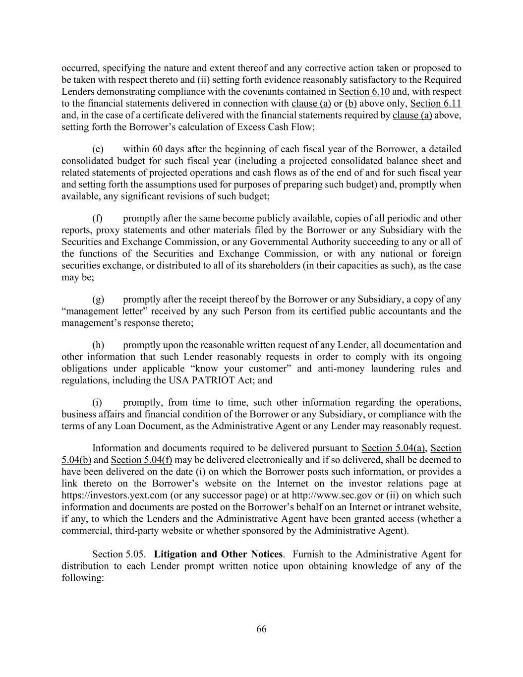 66 occurred, specifying the nature and extent thereof and any corrective action taken or proposed to be taken with respect thereto and (ii) setting forth evidence reasonably satisfactory to the Required Lenders demonstrating compliance with the covenants contained in Section 6.10 and, with respect to the financial statements delivered in connection with clause (a) or (b) above only, Section 6.11 and, in the case of a certificate delivered with the financial statements required by clause (a) above, setting forth the Borrower’s calculation of Excess Cash Flow; (e) within 60 days after the beginning of each fiscal year of the Borrower, a detailed consolidated budget for such fiscal year (including a projected consolidated balance sheet and related statements of projected operations and cash flows as of the end of and for such fiscal year and setting forth the assumptions used for purposes of preparing such budget) and, promptly when available, any significant revisions of such budget; (f) promptly after the same become publicly available, copies of all periodic and other reports, proxy statements and other materials filed by the Borrower or any Subsidiary with the Securities and Exchange Commission, or any Governmental Authority succeeding to any or all of the functions of the Securities and Exchange Commission, or with any national or foreign securities exchange, or distributed to all of its shareholders (in their capacities as such), as the case may be; (g) promptly after the receipt thereof by the Borrower or any Subsidiary, a copy of any “management letter” received by any such Person from its certified public accountants and the management’s response thereto; (h) promptly upon the reasonable written request of any Lender, all documentation and other information that such Lender reasonably requests in order to comply with its ongoing obligations under applicable “know your customer” and anti-money laundering rules and regulations, including the USA PATRIOT Act; and (i) promptly, from time to time, such other information regarding the operations, business affairs and financial condition of the Borrower or any Subsidiary, or compliance with the terms of any Loan Document, as the Administrative Agent or any Lender may reasonably request. Information and documents required to be delivered pursuant to Section 5.04(a), Section 5.04(b) and Section 5.04(f) may be delivered electronically and if so delivered, shall be deemed to have been delivered on the date (i) on which the Borrower posts such information, or provides a link thereto on the Borrower’s website on the Internet on the investor relations page at https://investors.yext.com (or any successor page) or at http://www.sec.gov or (ii) on which such information and documents are posted on the Borrower’s behalf on an Internet or intranet website, if any, to which the Lenders and the Administrative Agent have been granted access (whether a commercial, third-party website or whether sponsored by the Administrative Agent). Section 5.05. Litigation and Other Notices. Furnish to the Administrative Agent for distribution to each Lender prompt written notice upon obtaining knowledge of any of the following: