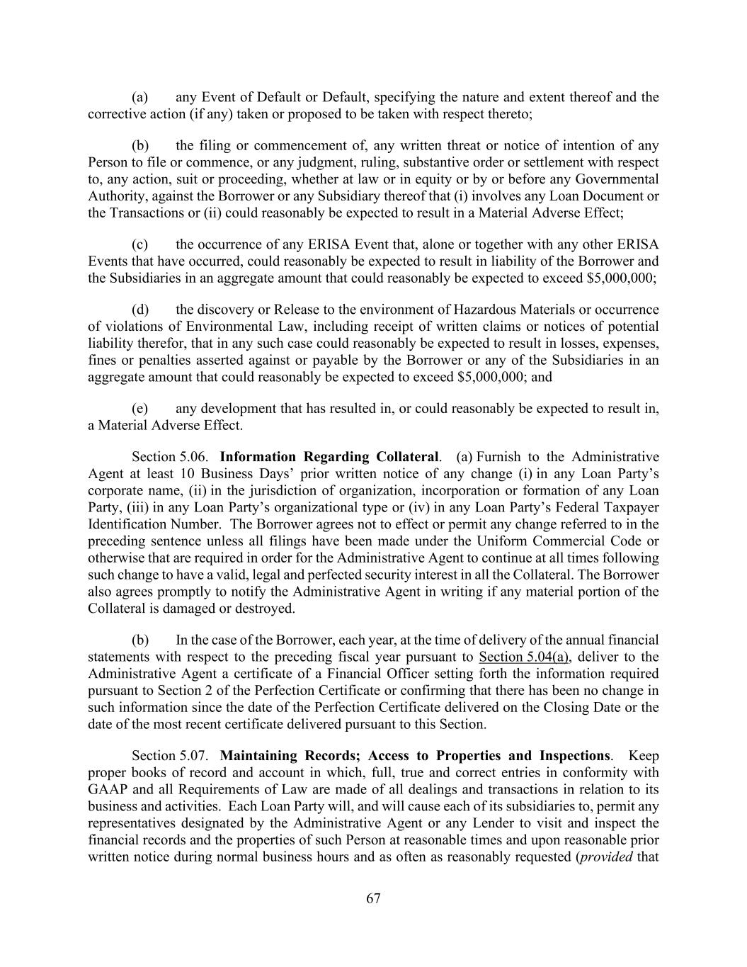 67 (a) any Event of Default or Default, specifying the nature and extent thereof and the corrective action (if any) taken or proposed to be taken with respect thereto; (b) the filing or commencement of, any written threat or notice of intention of any Person to file or commence, or any judgment, ruling, substantive order or settlement with respect to, any action, suit or proceeding, whether at law or in equity or by or before any Governmental Authority, against the Borrower or any Subsidiary thereof that (i) involves any Loan Document or the Transactions or (ii) could reasonably be expected to result in a Material Adverse Effect; (c) the occurrence of any ERISA Event that, alone or together with any other ERISA Events that have occurred, could reasonably be expected to result in liability of the Borrower and the Subsidiaries in an aggregate amount that could reasonably be expected to exceed $5,000,000; (d) the discovery or Release to the environment of Hazardous Materials or occurrence of violations of Environmental Law, including receipt of written claims or notices of potential liability therefor, that in any such case could reasonably be expected to result in losses, expenses, fines or penalties asserted against or payable by the Borrower or any of the Subsidiaries in an aggregate amount that could reasonably be expected to exceed $5,000,000; and (e) any development that has resulted in, or could reasonably be expected to result in, a Material Adverse Effect. Section 5.06. Information Regarding Collateral. (a) Furnish to the Administrative Agent at least 10 Business Days’ prior written notice of any change (i) in any Loan Party’s corporate name, (ii) in the jurisdiction of organization, incorporation or formation of any Loan Party, (iii) in any Loan Party’s organizational type or (iv) in any Loan Party’s Federal Taxpayer Identification Number. The Borrower agrees not to effect or permit any change referred to in the preceding sentence unless all filings have been made under the Uniform Commercial Code or otherwise that are required in order for the Administrative Agent to continue at all times following such change to have a valid, legal and perfected security interest in all the Collateral. The Borrower also agrees promptly to notify the Administrative Agent in writing if any material portion of the Collateral is damaged or destroyed. (b) In the case of the Borrower, each year, at the time of delivery of the annual financial statements with respect to the preceding fiscal year pursuant to Section 5.04(a), deliver to the Administrative Agent a certificate of a Financial Officer setting forth the information required pursuant to Section 2 of the Perfection Certificate or confirming that there has been no change in such information since the date of the Perfection Certificate delivered on the Closing Date or the date of the most recent certificate delivered pursuant to this Section. Section 5.07. Maintaining Records; Access to Properties and Inspections. Keep proper books of record and account in which, full, true and correct entries in conformity with GAAP and all Requirements of Law are made of all dealings and transactions in relation to its business and activities. Each Loan Party will, and will cause each of its subsidiaries to, permit any representatives designated by the Administrative Agent or any Lender to visit and inspect the financial records and the properties of such Person at reasonable times and upon reasonable prior written notice during normal business hours and as often as reasonably requested (provided that