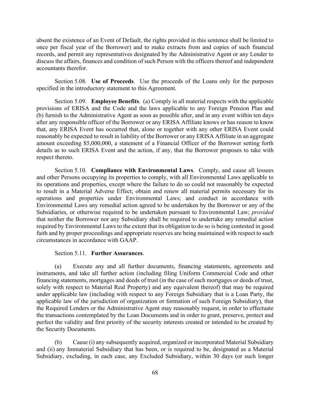 68 absent the existence of an Event of Default, the rights provided in this sentence shall be limited to once per fiscal year of the Borrower) and to make extracts from and copies of such financial records, and permit any representatives designated by the Administrative Agent or any Lender to discuss the affairs, finances and condition of such Person with the officers thereof and independent accountants therefor. Section 5.08. Use of Proceeds. Use the proceeds of the Loans only for the purposes specified in the introductory statement to this Agreement. Section 5.09. Employee Benefits. (a) Comply in all material respects with the applicable provisions of ERISA and the Code and the laws applicable to any Foreign Pension Plan and (b) furnish to the Administrative Agent as soon as possible after, and in any event within ten days after any responsible officer of the Borrower or any ERISA Affiliate knows or has reason to know that, any ERISA Event has occurred that, alone or together with any other ERISA Event could reasonably be expected to result in liability of the Borrower or any ERISA Affiliate in an aggregate amount exceeding $5,000,000, a statement of a Financial Officer of the Borrower setting forth details as to such ERISA Event and the action, if any, that the Borrower proposes to take with respect thereto. Section 5.10. Compliance with Environmental Laws. Comply, and cause all lessees and other Persons occupying its properties to comply, with all Environmental Laws applicable to its operations and properties, except where the failure to do so could not reasonably be expected to result in a Material Adverse Effect; obtain and renew all material permits necessary for its operations and properties under Environmental Laws; and conduct in accordance with Environmental Laws any remedial action agreed to be undertaken by the Borrower or any of the Subsidiaries, or otherwise required to be undertaken pursuant to Environmental Law; provided that neither the Borrower nor any Subsidiary shall be required to undertake any remedial action required by Environmental Laws to the extent that its obligation to do so is being contested in good faith and by proper proceedings and appropriate reserves are being maintained with respect to such circumstances in accordance with GAAP. Section 5.11. Further Assurances. (a) Execute any and all further documents, financing statements, agreements and instruments, and take all further action (including filing Uniform Commercial Code and other financing statements, mortgages and deeds of trust (in the case of such mortgages or deeds of trust, solely with respect to Material Real Property) and any equivalent thereof) that may be required under applicable law (including with respect to any Foreign Subsidiary that is a Loan Party, the applicable law of the jurisdiction of organization or formation of such Foreign Subsidiary), that the Required Lenders or the Administrative Agent may reasonably request, in order to effectuate the transactions contemplated by the Loan Documents and in order to grant, preserve, protect and perfect the validity and first priority of the security interests created or intended to be created by the Security Documents. (b) Cause (i) any subsequently acquired, organized or incorporated Material Subsidiary and (ii) any Immaterial Subsidiary that has been, or is required to be, designated as a Material Subsidiary, excluding, in each case, any Excluded Subsidiary, within 30 days (or such longer