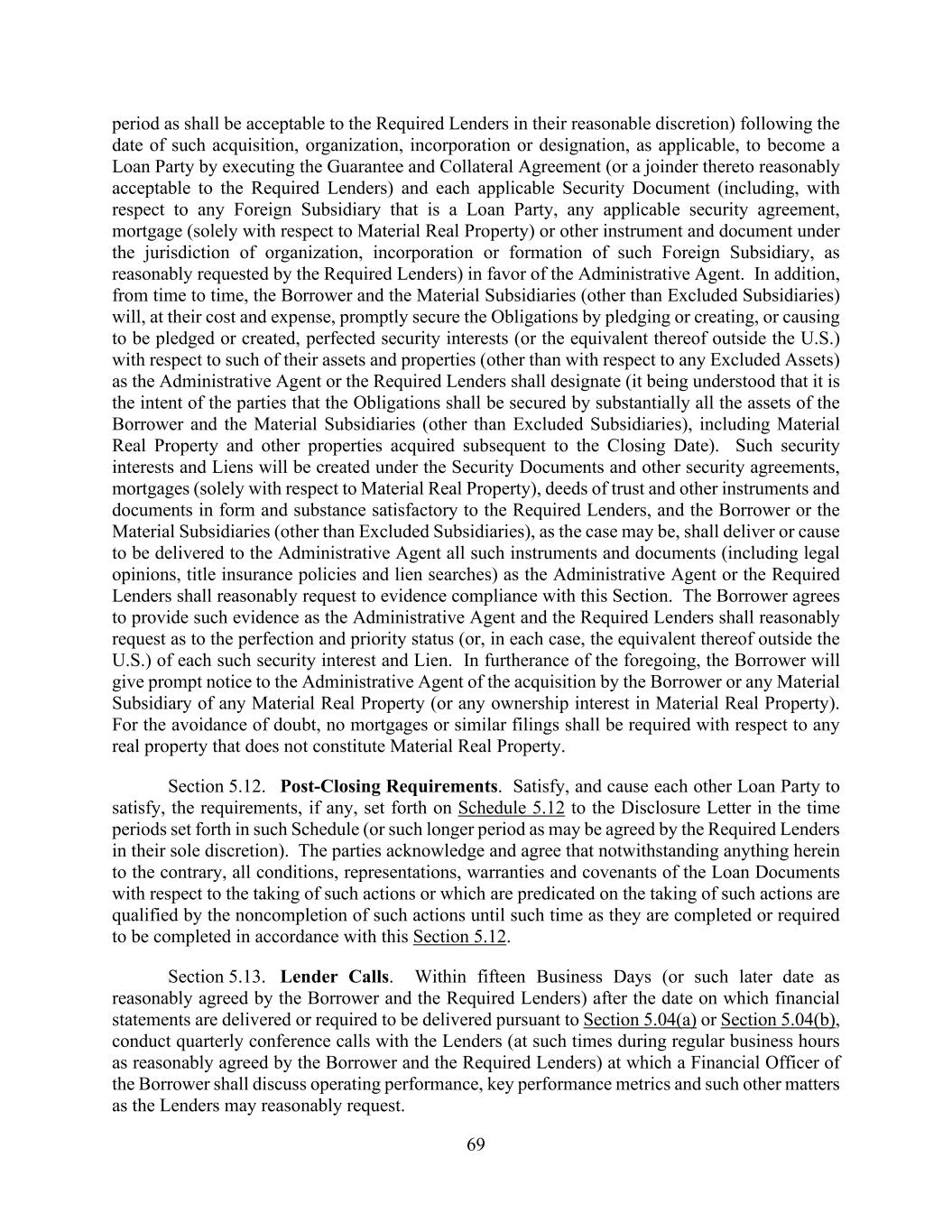 69 period as shall be acceptable to the Required Lenders in their reasonable discretion) following the date of such acquisition, organization, incorporation or designation, as applicable, to become a Loan Party by executing the Guarantee and Collateral Agreement (or a joinder thereto reasonably acceptable to the Required Lenders) and each applicable Security Document (including, with respect to any Foreign Subsidiary that is a Loan Party, any applicable security agreement, mortgage (solely with respect to Material Real Property) or other instrument and document under the jurisdiction of organization, incorporation or formation of such Foreign Subsidiary, as reasonably requested by the Required Lenders) in favor of the Administrative Agent. In addition, from time to time, the Borrower and the Material Subsidiaries (other than Excluded Subsidiaries) will, at their cost and expense, promptly secure the Obligations by pledging or creating, or causing to be pledged or created, perfected security interests (or the equivalent thereof outside the U.S.) with respect to such of their assets and properties (other than with respect to any Excluded Assets) as the Administrative Agent or the Required Lenders shall designate (it being understood that it is the intent of the parties that the Obligations shall be secured by substantially all the assets of the Borrower and the Material Subsidiaries (other than Excluded Subsidiaries), including Material Real Property and other properties acquired subsequent to the Closing Date). Such security interests and Liens will be created under the Security Documents and other security agreements, mortgages (solely with respect to Material Real Property), deeds of trust and other instruments and documents in form and substance satisfactory to the Required Lenders, and the Borrower or the Material Subsidiaries (other than Excluded Subsidiaries), as the case may be, shall deliver or cause to be delivered to the Administrative Agent all such instruments and documents (including legal opinions, title insurance policies and lien searches) as the Administrative Agent or the Required Lenders shall reasonably request to evidence compliance with this Section. The Borrower agrees to provide such evidence as the Administrative Agent and the Required Lenders shall reasonably request as to the perfection and priority status (or, in each case, the equivalent thereof outside the U.S.) of each such security interest and Lien. In furtherance of the foregoing, the Borrower will give prompt notice to the Administrative Agent of the acquisition by the Borrower or any Material Subsidiary of any Material Real Property (or any ownership interest in Material Real Property). For the avoidance of doubt, no mortgages or similar filings shall be required with respect to any real property that does not constitute Material Real Property. Section 5.12. Post-Closing Requirements. Satisfy, and cause each other Loan Party to satisfy, the requirements, if any, set forth on Schedule 5.12 to the Disclosure Letter in the time periods set forth in such Schedule (or such longer period as may be agreed by the Required Lenders in their sole discretion). The parties acknowledge and agree that notwithstanding anything herein to the contrary, all conditions, representations, warranties and covenants of the Loan Documents with respect to the taking of such actions or which are predicated on the taking of such actions are qualified by the noncompletion of such actions until such time as they are completed or required to be completed in accordance with this Section 5.12. Section 5.13. Lender Calls. Within fifteen Business Days (or such later date as reasonably agreed by the Borrower and the Required Lenders) after the date on which financial statements are delivered or required to be delivered pursuant to Section 5.04(a) or Section 5.04(b), conduct quarterly conference calls with the Lenders (at such times during regular business hours as reasonably agreed by the Borrower and the Required Lenders) at which a Financial Officer of the Borrower shall discuss operating performance, key performance metrics and such other matters as the Lenders may reasonably request.