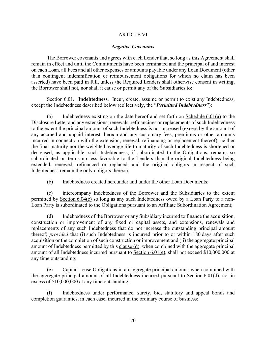 70 ARTICLE VI Negative Covenants The Borrower covenants and agrees with each Lender that, so long as this Agreement shall remain in effect and until the Commitments have been terminated and the principal of and interest on each Loan, all Fees and all other expenses or amounts payable under any Loan Document (other than contingent indemnification or reimbursement obligations for which no claim has been asserted) have been paid in full, unless the Required Lenders shall otherwise consent in writing, the Borrower shall not, nor shall it cause or permit any of the Subsidiaries to: Section 6.01. Indebtedness. Incur, create, assume or permit to exist any Indebtedness, except the Indebtedness described below (collectively, the “Permitted Indebtedness”): (a) Indebtedness existing on the date hereof and set forth on Schedule 6.01(a) to the Disclosure Letter and any extensions, renewals, refinancings or replacements of such Indebtedness to the extent the principal amount of such Indebtedness is not increased (except by the amount of any accrued and unpaid interest thereon and any customary fees, premiums or other amounts incurred in connection with the extension, renewal, refinancing or replacement thereof), neither the final maturity nor the weighted average life to maturity of such Indebtedness is shortened or decreased, as applicable, such Indebtedness, if subordinated to the Obligations, remains so subordinated on terms no less favorable to the Lenders than the original Indebtedness being extended, renewed, refinanced or replaced, and the original obligors in respect of such Indebtedness remain the only obligors thereon; (b) Indebtedness created hereunder and under the other Loan Documents; (c) intercompany Indebtedness of the Borrower and the Subsidiaries to the extent permitted by Section 6.04(c) so long as any such Indebtedness owed by a Loan Party to a non- Loan Party is subordinated to the Obligations pursuant to an Affiliate Subordination Agreement; (d) Indebtedness of the Borrower or any Subsidiary incurred to finance the acquisition, construction or improvement of any fixed or capital assets, and extensions, renewals and replacements of any such Indebtedness that do not increase the outstanding principal amount thereof; provided that (i) such Indebtedness is incurred prior to or within 180 days after such acquisition or the completion of such construction or improvement and (ii) the aggregate principal amount of Indebtedness permitted by this clause (d), when combined with the aggregate principal amount of all Indebtedness incurred pursuant to Section 6.01(e), shall not exceed $10,000,000 at any time outstanding; (e) Capital Lease Obligations in an aggregate principal amount, when combined with the aggregate principal amount of all Indebtedness incurred pursuant to Section 6.01(d), not in excess of $10,000,000 at any time outstanding; (f) Indebtedness under performance, surety, bid, statutory and appeal bonds and completion guaranties, in each case, incurred in the ordinary course of business;