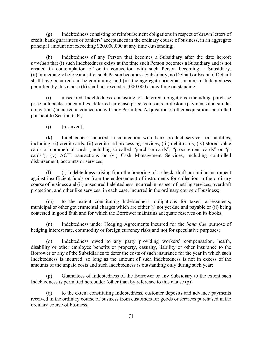 71 (g) Indebtedness consisting of reimbursement obligations in respect of drawn letters of credit, bank guarantees or bankers’ acceptances in the ordinary course of business, in an aggregate principal amount not exceeding $20,000,000 at any time outstanding; (h) Indebtedness of any Person that becomes a Subsidiary after the date hereof; provided that (i) such Indebtedness exists at the time such Person becomes a Subsidiary and is not created in contemplation of or in connection with such Person becoming a Subsidiary, (ii) immediately before and after such Person becomes a Subsidiary, no Default or Event of Default shall have occurred and be continuing, and (iii) the aggregate principal amount of Indebtedness permitted by this clause (h) shall not exceed $5,000,000 at any time outstanding; (i) unsecured Indebtedness consisting of deferred obligations (including purchase price holdbacks, indemnities, deferred purchase price, earn-outs, milestone payments and similar obligations) incurred in connection with any Permitted Acquisition or other acquisitions permitted pursuant to Section 6.04; (j) [reserved]; (k) Indebtedness incurred in connection with bank product services or facilities, including: (i) credit cards, (ii) credit card processing services, (iii) debit cards, (iv) stored value cards or commercial cards (including so-called “purchase cards”, “procurement cards” or “p- cards”), (v) ACH transactions or (vi) Cash Management Services, including controlled disbursement, accounts or services; (l) (i) Indebtedness arising from the honoring of a check, draft or similar instrument against insufficient funds or from the endorsement of instruments for collection in the ordinary course of business and (ii) unsecured Indebtedness incurred in respect of netting services, overdraft protection, and other like services, in each case, incurred in the ordinary course of business; (m) to the extent constituting Indebtedness, obligations for taxes, assessments, municipal or other governmental charges which are either (i) not yet due and payable or (ii) being contested in good faith and for which the Borrower maintains adequate reserves on its books; (n) Indebtedness under Hedging Agreements incurred for the bona fide purpose of hedging interest rate, commodity or foreign currency risks and not for speculative purposes; (o) Indebtedness owed to any party providing workers’ compensation, health, disability or other employee benefits or property, casualty, liability or other insurance to the Borrower or any of the Subsidiaries to defer the costs of such insurance for the year in which such Indebtedness is incurred, so long as the amount of such Indebtedness is not in excess of the amounts of the unpaid costs and such Indebtedness is outstanding only during such year; (p) Guarantees of Indebtedness of the Borrower or any Subsidiary to the extent such Indebtedness is permitted hereunder (other than by reference to this clause (p)) (q) to the extent constituting Indebtedness, customer deposits and advance payments received in the ordinary course of business from customers for goods or services purchased in the ordinary course of business;