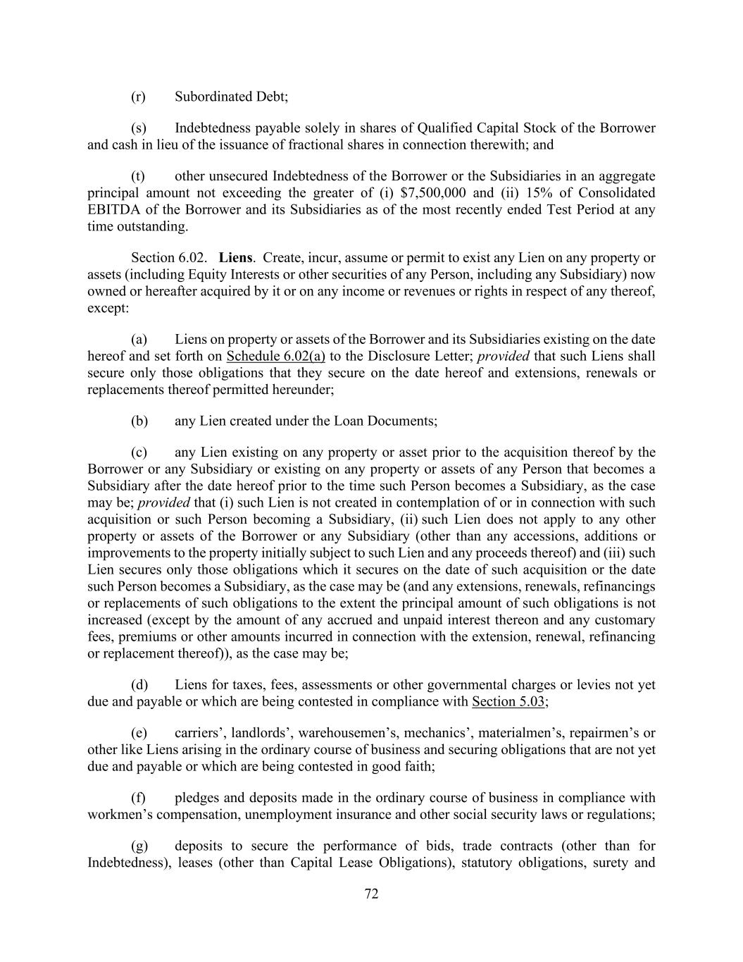 72 (r) Subordinated Debt; (s) Indebtedness payable solely in shares of Qualified Capital Stock of the Borrower and cash in lieu of the issuance of fractional shares in connection therewith; and (t) other unsecured Indebtedness of the Borrower or the Subsidiaries in an aggregate principal amount not exceeding the greater of (i) $7,500,000 and (ii) 15% of Consolidated EBITDA of the Borrower and its Subsidiaries as of the most recently ended Test Period at any time outstanding. Section 6.02. Liens. Create, incur, assume or permit to exist any Lien on any property or assets (including Equity Interests or other securities of any Person, including any Subsidiary) now owned or hereafter acquired by it or on any income or revenues or rights in respect of any thereof, except: (a) Liens on property or assets of the Borrower and its Subsidiaries existing on the date hereof and set forth on Schedule 6.02(a) to the Disclosure Letter; provided that such Liens shall secure only those obligations that they secure on the date hereof and extensions, renewals or replacements thereof permitted hereunder; (b) any Lien created under the Loan Documents; (c) any Lien existing on any property or asset prior to the acquisition thereof by the Borrower or any Subsidiary or existing on any property or assets of any Person that becomes a Subsidiary after the date hereof prior to the time such Person becomes a Subsidiary, as the case may be; provided that (i) such Lien is not created in contemplation of or in connection with such acquisition or such Person becoming a Subsidiary, (ii) such Lien does not apply to any other property or assets of the Borrower or any Subsidiary (other than any accessions, additions or improvements to the property initially subject to such Lien and any proceeds thereof) and (iii) such Lien secures only those obligations which it secures on the date of such acquisition or the date such Person becomes a Subsidiary, as the case may be (and any extensions, renewals, refinancings or replacements of such obligations to the extent the principal amount of such obligations is not increased (except by the amount of any accrued and unpaid interest thereon and any customary fees, premiums or other amounts incurred in connection with the extension, renewal, refinancing or replacement thereof)), as the case may be; (d) Liens for taxes, fees, assessments or other governmental charges or levies not yet due and payable or which are being contested in compliance with Section 5.03; (e) carriers’, landlords’, warehousemen’s, mechanics’, materialmen’s, repairmen’s or other like Liens arising in the ordinary course of business and securing obligations that are not yet due and payable or which are being contested in good faith; (f) pledges and deposits made in the ordinary course of business in compliance with workmen’s compensation, unemployment insurance and other social security laws or regulations; (g) deposits to secure the performance of bids, trade contracts (other than for Indebtedness), leases (other than Capital Lease Obligations), statutory obligations, surety and