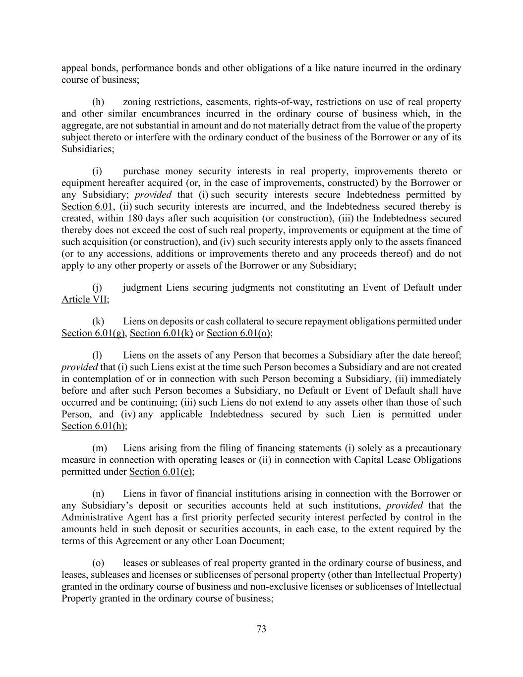 73 appeal bonds, performance bonds and other obligations of a like nature incurred in the ordinary course of business; (h) zoning restrictions, easements, rights-of-way, restrictions on use of real property and other similar encumbrances incurred in the ordinary course of business which, in the aggregate, are not substantial in amount and do not materially detract from the value of the property subject thereto or interfere with the ordinary conduct of the business of the Borrower or any of its Subsidiaries; (i) purchase money security interests in real property, improvements thereto or equipment hereafter acquired (or, in the case of improvements, constructed) by the Borrower or any Subsidiary; provided that (i) such security interests secure Indebtedness permitted by Section 6.01, (ii) such security interests are incurred, and the Indebtedness secured thereby is created, within 180 days after such acquisition (or construction), (iii) the Indebtedness secured thereby does not exceed the cost of such real property, improvements or equipment at the time of such acquisition (or construction), and (iv) such security interests apply only to the assets financed (or to any accessions, additions or improvements thereto and any proceeds thereof) and do not apply to any other property or assets of the Borrower or any Subsidiary; (j) judgment Liens securing judgments not constituting an Event of Default under Article VII; (k) Liens on deposits or cash collateral to secure repayment obligations permitted under Section 6.01(g), Section 6.01(k) or Section 6.01(o); (l) Liens on the assets of any Person that becomes a Subsidiary after the date hereof; provided that (i) such Liens exist at the time such Person becomes a Subsidiary and are not created in contemplation of or in connection with such Person becoming a Subsidiary, (ii) immediately before and after such Person becomes a Subsidiary, no Default or Event of Default shall have occurred and be continuing; (iii) such Liens do not extend to any assets other than those of such Person, and (iv) any applicable Indebtedness secured by such Lien is permitted under Section 6.01(h); (m) Liens arising from the filing of financing statements (i) solely as a precautionary measure in connection with operating leases or (ii) in connection with Capital Lease Obligations permitted under Section 6.01(e); (n) Liens in favor of financial institutions arising in connection with the Borrower or any Subsidiary’s deposit or securities accounts held at such institutions, provided that the Administrative Agent has a first priority perfected security interest perfected by control in the amounts held in such deposit or securities accounts, in each case, to the extent required by the terms of this Agreement or any other Loan Document; (o) leases or subleases of real property granted in the ordinary course of business, and leases, subleases and licenses or sublicenses of personal property (other than Intellectual Property) granted in the ordinary course of business and non-exclusive licenses or sublicenses of Intellectual Property granted in the ordinary course of business;