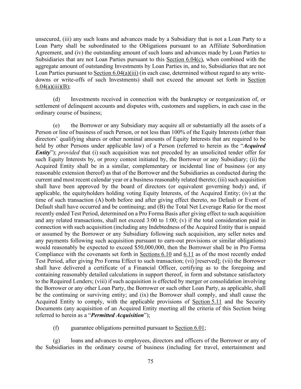 75 unsecured, (iii) any such loans and advances made by a Subsidiary that is not a Loan Party to a Loan Party shall be subordinated to the Obligations pursuant to an Affiliate Subordination Agreement, and (iv) the outstanding amount of such loans and advances made by Loan Parties to Subsidiaries that are not Loan Parties pursuant to this Section 6.04(c), when combined with the aggregate amount of outstanding Investments by Loan Parties in, and to, Subsidiaries that are not Loan Parties pursuant to Section 6.04(a)(iii) (in each case, determined without regard to any write- downs or write-offs of such Investments) shall not exceed the amount set forth in Section 6.04(a)(iii)(B); (d) Investments received in connection with the bankruptcy or reorganization of, or settlement of delinquent accounts and disputes with, customers and suppliers, in each case in the ordinary course of business; (e) the Borrower or any Subsidiary may acquire all or substantially all the assets of a Person or line of business of such Person, or not less than 100% of the Equity Interests (other than directors’ qualifying shares or other nominal amounts of Equity Interests that are required to be held by other Persons under applicable law) of a Person (referred to herein as the “Acquired Entity”); provided that (i) such acquisition was not preceded by an unsolicited tender offer for such Equity Interests by, or proxy contest initiated by, the Borrower or any Subsidiary; (ii) the Acquired Entity shall be in a similar, complementary or incidental line of business (or any reasonable extension thereof) as that of the Borrower and the Subsidiaries as conducted during the current and most recent calendar year or a business reasonably related thereto; (iii) such acquisition shall have been approved by the board of directors (or equivalent governing body) and, if applicable, the equityholders holding voting Equity Interests, of the Acquired Entity; (iv) at the time of such transaction (A) both before and after giving effect thereto, no Default or Event of Default shall have occurred and be continuing; and (B) the Total Net Leverage Ratio for the most recently ended Test Period, determined on a Pro Forma Basis after giving effect to such acquisition and any related transactions, shall not exceed 3:00 to 1:00; (v) if the total consideration paid in connection with such acquisition (including any Indebtedness of the Acquired Entity that is unpaid or assumed by the Borrower or any Subsidiary following such acquisition, any seller notes and any payments following such acquisition pursuant to earn-out provisions or similar obligations) would reasonably be expected to exceed $50,000,000, then the Borrower shall be in Pro Forma Compliance with the covenants set forth in Sections 6.10 and 6.11 as of the most recently ended Test Period, after giving Pro Forma Effect to such transaction; (vi) [reserved]; (vii) the Borrower shall have delivered a certificate of a Financial Officer, certifying as to the foregoing and containing reasonably detailed calculations in support thereof, in form and substance satisfactory to the Required Lenders; (viii) if such acquisition is effected by merger or consolidation involving the Borrower or any other Loan Party, the Borrower or such other Loan Party, as applicable, shall be the continuing or surviving entity; and (ix) the Borrower shall comply, and shall cause the Acquired Entity to comply, with the applicable provisions of Section 5.11 and the Security Documents (any acquisition of an Acquired Entity meeting all the criteria of this Section being referred to herein as a “Permitted Acquisition”); (f) guarantee obligations permitted pursuant to Section 6.01; (g) loans and advances to employees, directors and officers of the Borrower or any of the Subsidiaries in the ordinary course of business (including for travel, entertainment and