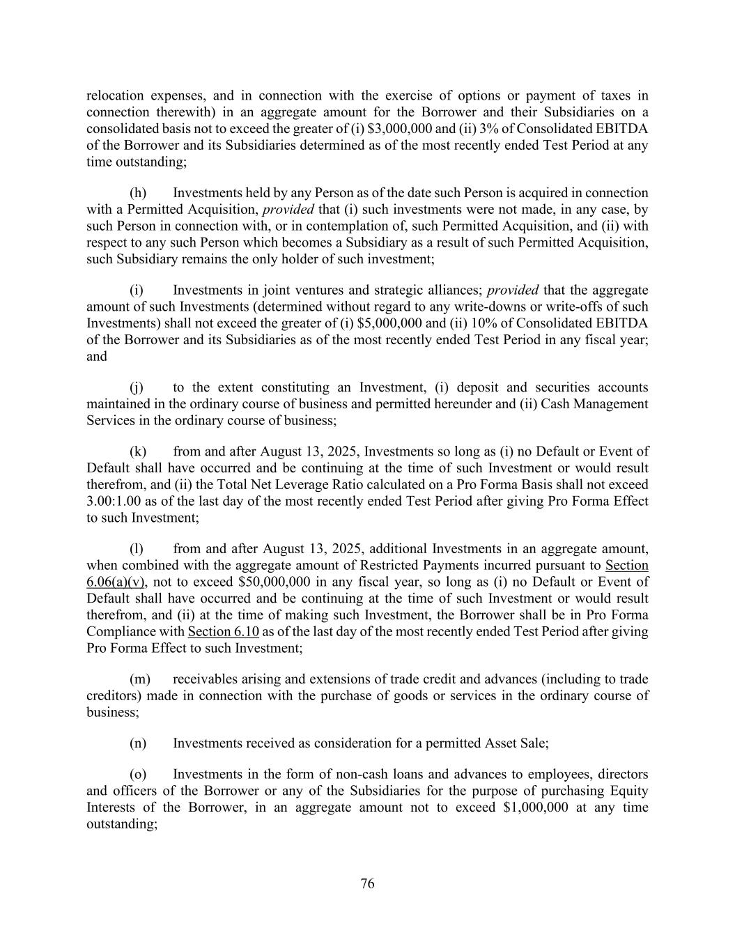 76 relocation expenses, and in connection with the exercise of options or payment of taxes in connection therewith) in an aggregate amount for the Borrower and their Subsidiaries on a consolidated basis not to exceed the greater of (i) $3,000,000 and (ii) 3% of Consolidated EBITDA of the Borrower and its Subsidiaries determined as of the most recently ended Test Period at any time outstanding; (h) Investments held by any Person as of the date such Person is acquired in connection with a Permitted Acquisition, provided that (i) such investments were not made, in any case, by such Person in connection with, or in contemplation of, such Permitted Acquisition, and (ii) with respect to any such Person which becomes a Subsidiary as a result of such Permitted Acquisition, such Subsidiary remains the only holder of such investment; (i) Investments in joint ventures and strategic alliances; provided that the aggregate amount of such Investments (determined without regard to any write-downs or write-offs of such Investments) shall not exceed the greater of (i) $5,000,000 and (ii) 10% of Consolidated EBITDA of the Borrower and its Subsidiaries as of the most recently ended Test Period in any fiscal year; and (j) to the extent constituting an Investment, (i) deposit and securities accounts maintained in the ordinary course of business and permitted hereunder and (ii) Cash Management Services in the ordinary course of business; (k) from and after August 13, 2025, Investments so long as (i) no Default or Event of Default shall have occurred and be continuing at the time of such Investment or would result therefrom, and (ii) the Total Net Leverage Ratio calculated on a Pro Forma Basis shall not exceed 3.00:1.00 as of the last day of the most recently ended Test Period after giving Pro Forma Effect to such Investment; (l) from and after August 13, 2025, additional Investments in an aggregate amount, when combined with the aggregate amount of Restricted Payments incurred pursuant to Section 6.06(a)(v), not to exceed $50,000,000 in any fiscal year, so long as (i) no Default or Event of Default shall have occurred and be continuing at the time of such Investment or would result therefrom, and (ii) at the time of making such Investment, the Borrower shall be in Pro Forma Compliance with Section 6.10 as of the last day of the most recently ended Test Period after giving Pro Forma Effect to such Investment; (m) receivables arising and extensions of trade credit and advances (including to trade creditors) made in connection with the purchase of goods or services in the ordinary course of business; (n) Investments received as consideration for a permitted Asset Sale; (o) Investments in the form of non-cash loans and advances to employees, directors and officers of the Borrower or any of the Subsidiaries for the purpose of purchasing Equity Interests of the Borrower, in an aggregate amount not to exceed $1,000,000 at any time outstanding;