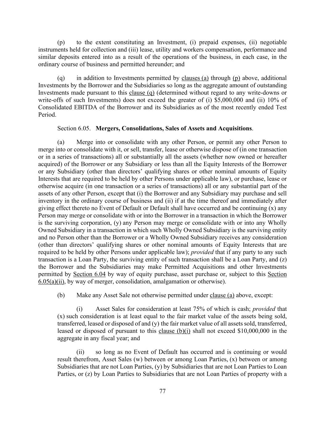 77 (p) to the extent constituting an Investment, (i) prepaid expenses, (ii) negotiable instruments held for collection and (iii) lease, utility and workers compensation, performance and similar deposits entered into as a result of the operations of the business, in each case, in the ordinary course of business and permitted hereunder; and (q) in addition to Investments permitted by clauses (a) through (p) above, additional Investments by the Borrower and the Subsidiaries so long as the aggregate amount of outstanding Investments made pursuant to this clause (q) (determined without regard to any write-downs or write-offs of such Investments) does not exceed the greater of (i) $5,000,000 and (ii) 10% of Consolidated EBITDA of the Borrower and its Subsidiaries as of the most recently ended Test Period. Section 6.05. Mergers, Consolidations, Sales of Assets and Acquisitions. (a) Merge into or consolidate with any other Person, or permit any other Person to merge into or consolidate with it, or sell, transfer, lease or otherwise dispose of (in one transaction or in a series of transactions) all or substantially all the assets (whether now owned or hereafter acquired) of the Borrower or any Subsidiary or less than all the Equity Interests of the Borrower or any Subsidiary (other than directors’ qualifying shares or other nominal amounts of Equity Interests that are required to be held by other Persons under applicable law), or purchase, lease or otherwise acquire (in one transaction or a series of transactions) all or any substantial part of the assets of any other Person, except that (i) the Borrower and any Subsidiary may purchase and sell inventory in the ordinary course of business and (ii) if at the time thereof and immediately after giving effect thereto no Event of Default or Default shall have occurred and be continuing (x) any Person may merge or consolidate with or into the Borrower in a transaction in which the Borrower is the surviving corporation, (y) any Person may merge or consolidate with or into any Wholly Owned Subsidiary in a transaction in which such Wholly Owned Subsidiary is the surviving entity and no Person other than the Borrower or a Wholly Owned Subsidiary receives any consideration (other than directors’ qualifying shares or other nominal amounts of Equity Interests that are required to be held by other Persons under applicable law); provided that if any party to any such transaction is a Loan Party, the surviving entity of such transaction shall be a Loan Party, and (z) the Borrower and the Subsidiaries may make Permitted Acquisitions and other Investments permitted by Section 6.04 by way of equity purchase, asset purchase or, subject to this Section 6.05(a)(ii), by way of merger, consolidation, amalgamation or otherwise). (b) Make any Asset Sale not otherwise permitted under clause (a) above, except: (i) Asset Sales for consideration at least 75% of which is cash; provided that (x) such consideration is at least equal to the fair market value of the assets being sold, transferred, leased or disposed of and (y) the fair market value of all assets sold, transferred, leased or disposed of pursuant to this clause (b)(i) shall not exceed $10,000,000 in the aggregate in any fiscal year; and (ii) so long as no Event of Default has occurred and is continuing or would result therefrom, Asset Sales (w) between or among Loan Parties, (x) between or among Subsidiaries that are not Loan Parties, (y) by Subsidiaries that are not Loan Parties to Loan Parties, or (z) by Loan Parties to Subsidiaries that are not Loan Parties of property with a