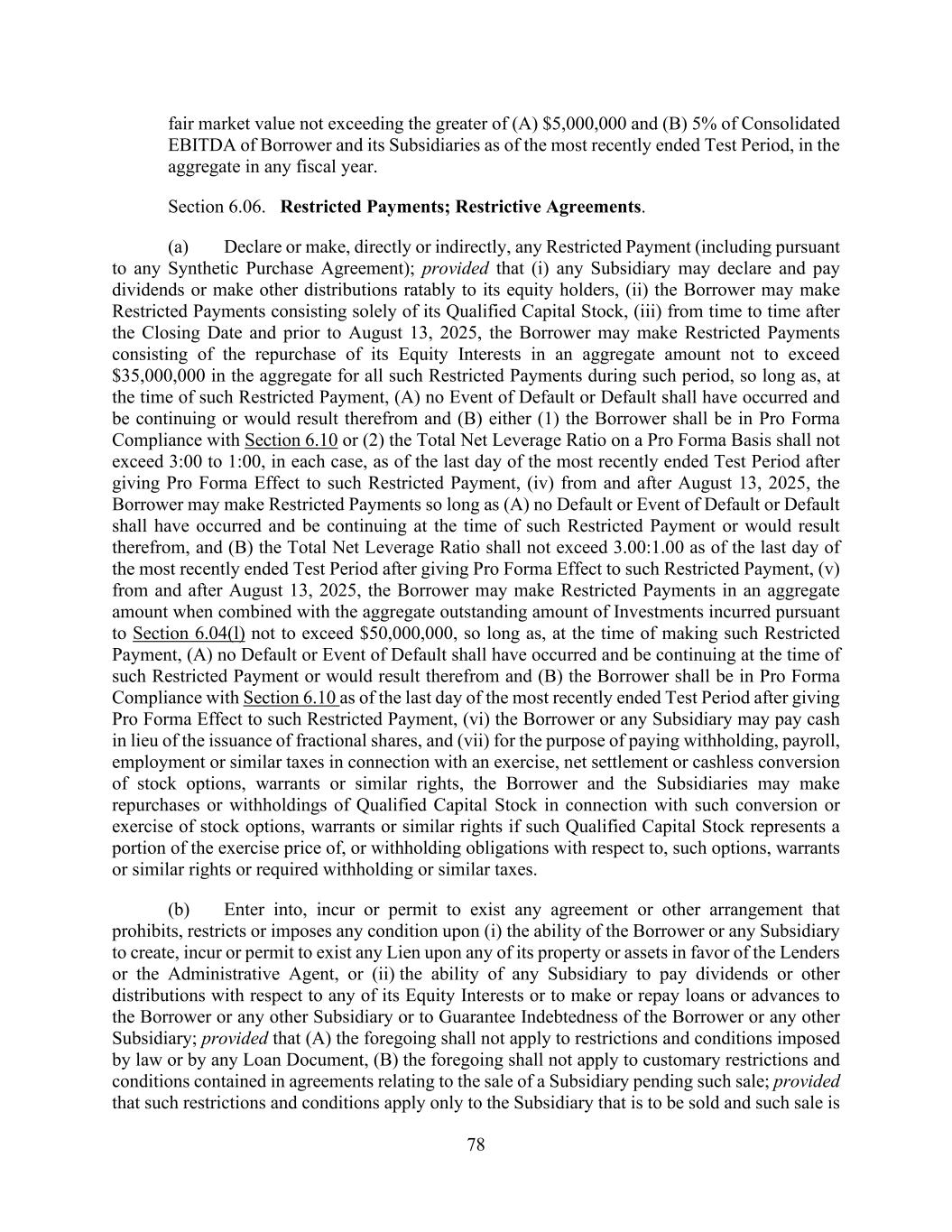 78 fair market value not exceeding the greater of (A) $5,000,000 and (B) 5% of Consolidated EBITDA of Borrower and its Subsidiaries as of the most recently ended Test Period, in the aggregate in any fiscal year. Section 6.06. Restricted Payments; Restrictive Agreements. (a) Declare or make, directly or indirectly, any Restricted Payment (including pursuant to any Synthetic Purchase Agreement); provided that (i) any Subsidiary may declare and pay dividends or make other distributions ratably to its equity holders, (ii) the Borrower may make Restricted Payments consisting solely of its Qualified Capital Stock, (iii) from time to time after the Closing Date and prior to August 13, 2025, the Borrower may make Restricted Payments consisting of the repurchase of its Equity Interests in an aggregate amount not to exceed $35,000,000 in the aggregate for all such Restricted Payments during such period, so long as, at the time of such Restricted Payment, (A) no Event of Default or Default shall have occurred and be continuing or would result therefrom and (B) either (1) the Borrower shall be in Pro Forma Compliance with Section 6.10 or (2) the Total Net Leverage Ratio on a Pro Forma Basis shall not exceed 3:00 to 1:00, in each case, as of the last day of the most recently ended Test Period after giving Pro Forma Effect to such Restricted Payment, (iv) from and after August 13, 2025, the Borrower may make Restricted Payments so long as (A) no Default or Event of Default or Default shall have occurred and be continuing at the time of such Restricted Payment or would result therefrom, and (B) the Total Net Leverage Ratio shall not exceed 3.00:1.00 as of the last day of the most recently ended Test Period after giving Pro Forma Effect to such Restricted Payment, (v) from and after August 13, 2025, the Borrower may make Restricted Payments in an aggregate amount when combined with the aggregate outstanding amount of Investments incurred pursuant to Section 6.04(l) not to exceed $50,000,000, so long as, at the time of making such Restricted Payment, (A) no Default or Event of Default shall have occurred and be continuing at the time of such Restricted Payment or would result therefrom and (B) the Borrower shall be in Pro Forma Compliance with Section 6.10 as of the last day of the most recently ended Test Period after giving Pro Forma Effect to such Restricted Payment, (vi) the Borrower or any Subsidiary may pay cash in lieu of the issuance of fractional shares, and (vii) for the purpose of paying withholding, payroll, employment or similar taxes in connection with an exercise, net settlement or cashless conversion of stock options, warrants or similar rights, the Borrower and the Subsidiaries may make repurchases or withholdings of Qualified Capital Stock in connection with such conversion or exercise of stock options, warrants or similar rights if such Qualified Capital Stock represents a portion of the exercise price of, or withholding obligations with respect to, such options, warrants or similar rights or required withholding or similar taxes. (b) Enter into, incur or permit to exist any agreement or other arrangement that prohibits, restricts or imposes any condition upon (i) the ability of the Borrower or any Subsidiary to create, incur or permit to exist any Lien upon any of its property or assets in favor of the Lenders or the Administrative Agent, or (ii) the ability of any Subsidiary to pay dividends or other distributions with respect to any of its Equity Interests or to make or repay loans or advances to the Borrower or any other Subsidiary or to Guarantee Indebtedness of the Borrower or any other Subsidiary; provided that (A) the foregoing shall not apply to restrictions and conditions imposed by law or by any Loan Document, (B) the foregoing shall not apply to customary restrictions and conditions contained in agreements relating to the sale of a Subsidiary pending such sale; provided that such restrictions and conditions apply only to the Subsidiary that is to be sold and such sale is
