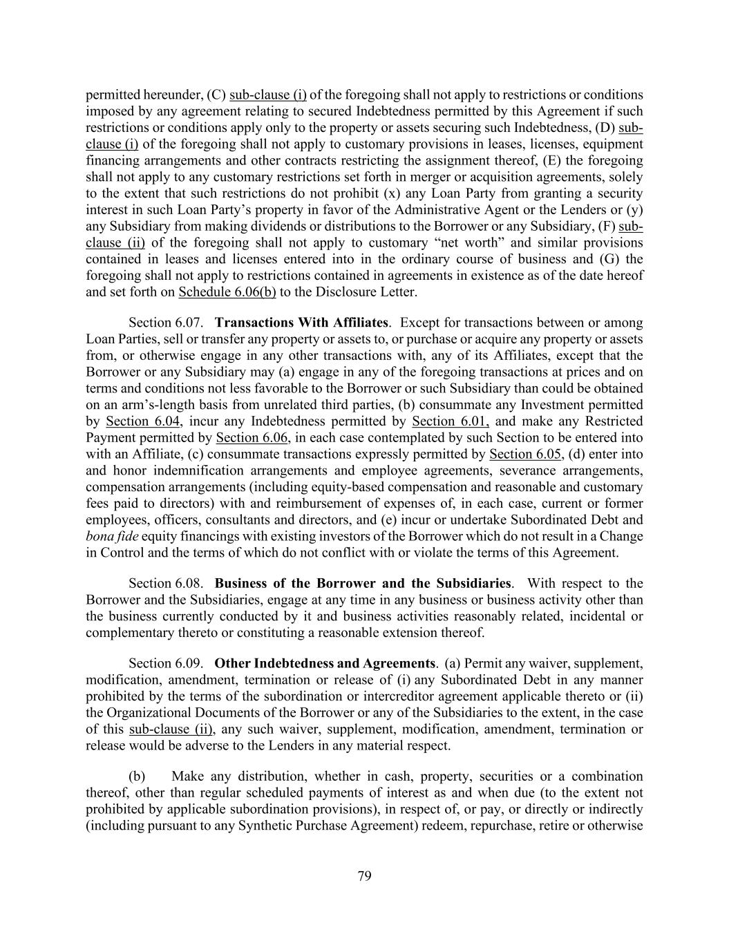 79 permitted hereunder, (C) sub-clause (i) of the foregoing shall not apply to restrictions or conditions imposed by any agreement relating to secured Indebtedness permitted by this Agreement if such restrictions or conditions apply only to the property or assets securing such Indebtedness, (D) sub- clause (i) of the foregoing shall not apply to customary provisions in leases, licenses, equipment financing arrangements and other contracts restricting the assignment thereof, (E) the foregoing shall not apply to any customary restrictions set forth in merger or acquisition agreements, solely to the extent that such restrictions do not prohibit (x) any Loan Party from granting a security interest in such Loan Party’s property in favor of the Administrative Agent or the Lenders or (y) any Subsidiary from making dividends or distributions to the Borrower or any Subsidiary, (F) sub- clause (ii) of the foregoing shall not apply to customary “net worth” and similar provisions contained in leases and licenses entered into in the ordinary course of business and (G) the foregoing shall not apply to restrictions contained in agreements in existence as of the date hereof and set forth on Schedule 6.06(b) to the Disclosure Letter. Section 6.07. Transactions With Affiliates. Except for transactions between or among Loan Parties, sell or transfer any property or assets to, or purchase or acquire any property or assets from, or otherwise engage in any other transactions with, any of its Affiliates, except that the Borrower or any Subsidiary may (a) engage in any of the foregoing transactions at prices and on terms and conditions not less favorable to the Borrower or such Subsidiary than could be obtained on an arm’s-length basis from unrelated third parties, (b) consummate any Investment permitted by Section 6.04, incur any Indebtedness permitted by Section 6.01, and make any Restricted Payment permitted by Section 6.06, in each case contemplated by such Section to be entered into with an Affiliate, (c) consummate transactions expressly permitted by Section 6.05, (d) enter into and honor indemnification arrangements and employee agreements, severance arrangements, compensation arrangements (including equity-based compensation and reasonable and customary fees paid to directors) with and reimbursement of expenses of, in each case, current or former employees, officers, consultants and directors, and (e) incur or undertake Subordinated Debt and bona fide equity financings with existing investors of the Borrower which do not result in a Change in Control and the terms of which do not conflict with or violate the terms of this Agreement. Section 6.08. Business of the Borrower and the Subsidiaries. With respect to the Borrower and the Subsidiaries, engage at any time in any business or business activity other than the business currently conducted by it and business activities reasonably related, incidental or complementary thereto or constituting a reasonable extension thereof. Section 6.09. Other Indebtedness and Agreements. (a) Permit any waiver, supplement, modification, amendment, termination or release of (i) any Subordinated Debt in any manner prohibited by the terms of the subordination or intercreditor agreement applicable thereto or (ii) the Organizational Documents of the Borrower or any of the Subsidiaries to the extent, in the case of this sub-clause (ii), any such waiver, supplement, modification, amendment, termination or release would be adverse to the Lenders in any material respect. (b) Make any distribution, whether in cash, property, securities or a combination thereof, other than regular scheduled payments of interest as and when due (to the extent not prohibited by applicable subordination provisions), in respect of, or pay, or directly or indirectly (including pursuant to any Synthetic Purchase Agreement) redeem, repurchase, retire or otherwise