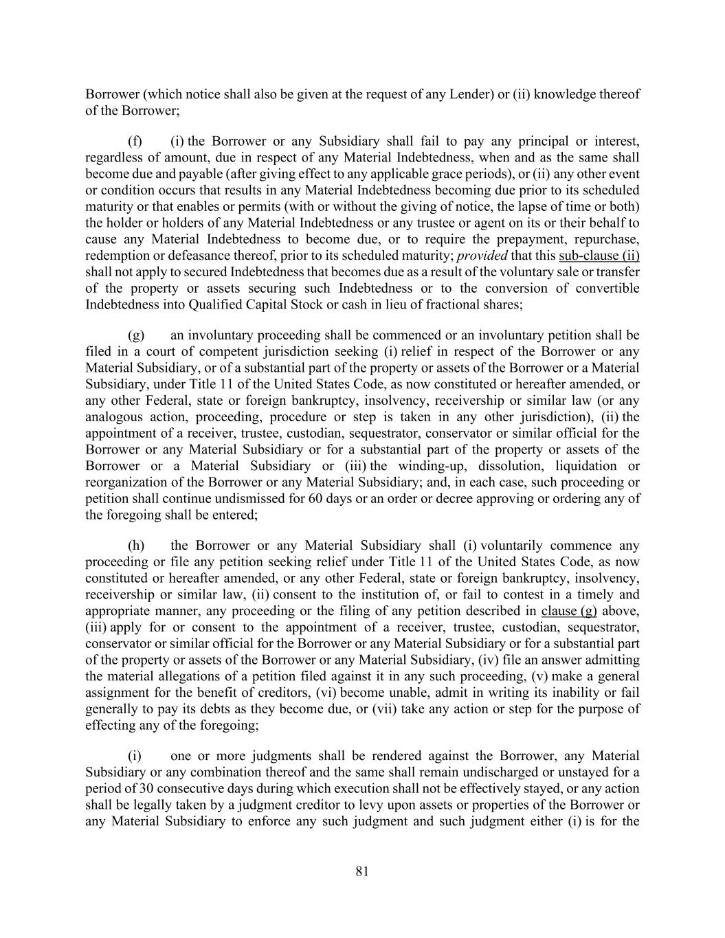 81 Borrower (which notice shall also be given at the request of any Lender) or (ii) knowledge thereof of the Borrower; (f) (i) the Borrower or any Subsidiary shall fail to pay any principal or interest, regardless of amount, due in respect of any Material Indebtedness, when and as the same shall become due and payable (after giving effect to any applicable grace periods), or (ii) any other event or condition occurs that results in any Material Indebtedness becoming due prior to its scheduled maturity or that enables or permits (with or without the giving of notice, the lapse of time or both) the holder or holders of any Material Indebtedness or any trustee or agent on its or their behalf to cause any Material Indebtedness to become due, or to require the prepayment, repurchase, redemption or defeasance thereof, prior to its scheduled maturity; provided that this sub-clause (ii) shall not apply to secured Indebtedness that becomes due as a result of the voluntary sale or transfer of the property or assets securing such Indebtedness or to the conversion of convertible Indebtedness into Qualified Capital Stock or cash in lieu of fractional shares; (g) an involuntary proceeding shall be commenced or an involuntary petition shall be filed in a court of competent jurisdiction seeking (i) relief in respect of the Borrower or any Material Subsidiary, or of a substantial part of the property or assets of the Borrower or a Material Subsidiary, under Title 11 of the United States Code, as now constituted or hereafter amended, or any other Federal, state or foreign bankruptcy, insolvency, receivership or similar law (or any analogous action, proceeding, procedure or step is taken in any other jurisdiction), (ii) the appointment of a receiver, trustee, custodian, sequestrator, conservator or similar official for the Borrower or any Material Subsidiary or for a substantial part of the property or assets of the Borrower or a Material Subsidiary or (iii) the winding-up, dissolution, liquidation or reorganization of the Borrower or any Material Subsidiary; and, in each case, such proceeding or petition shall continue undismissed for 60 days or an order or decree approving or ordering any of the foregoing shall be entered; (h) the Borrower or any Material Subsidiary shall (i) voluntarily commence any proceeding or file any petition seeking relief under Title 11 of the United States Code, as now constituted or hereafter amended, or any other Federal, state or foreign bankruptcy, insolvency, receivership or similar law, (ii) consent to the institution of, or fail to contest in a timely and appropriate manner, any proceeding or the filing of any petition described in clause (g) above, (iii) apply for or consent to the appointment of a receiver, trustee, custodian, sequestrator, conservator or similar official for the Borrower or any Material Subsidiary or for a substantial part of the property or assets of the Borrower or any Material Subsidiary, (iv) file an answer admitting the material allegations of a petition filed against it in any such proceeding, (v) make a general assignment for the benefit of creditors, (vi) become unable, admit in writing its inability or fail generally to pay its debts as they become due, or (vii) take any action or step for the purpose of effecting any of the foregoing; (i) one or more judgments shall be rendered against the Borrower, any Material Subsidiary or any combination thereof and the same shall remain undischarged or unstayed for a period of 30 consecutive days during which execution shall not be effectively stayed, or any action shall be legally taken by a judgment creditor to levy upon assets or properties of the Borrower or any Material Subsidiary to enforce any such judgment and such judgment either (i) is for the