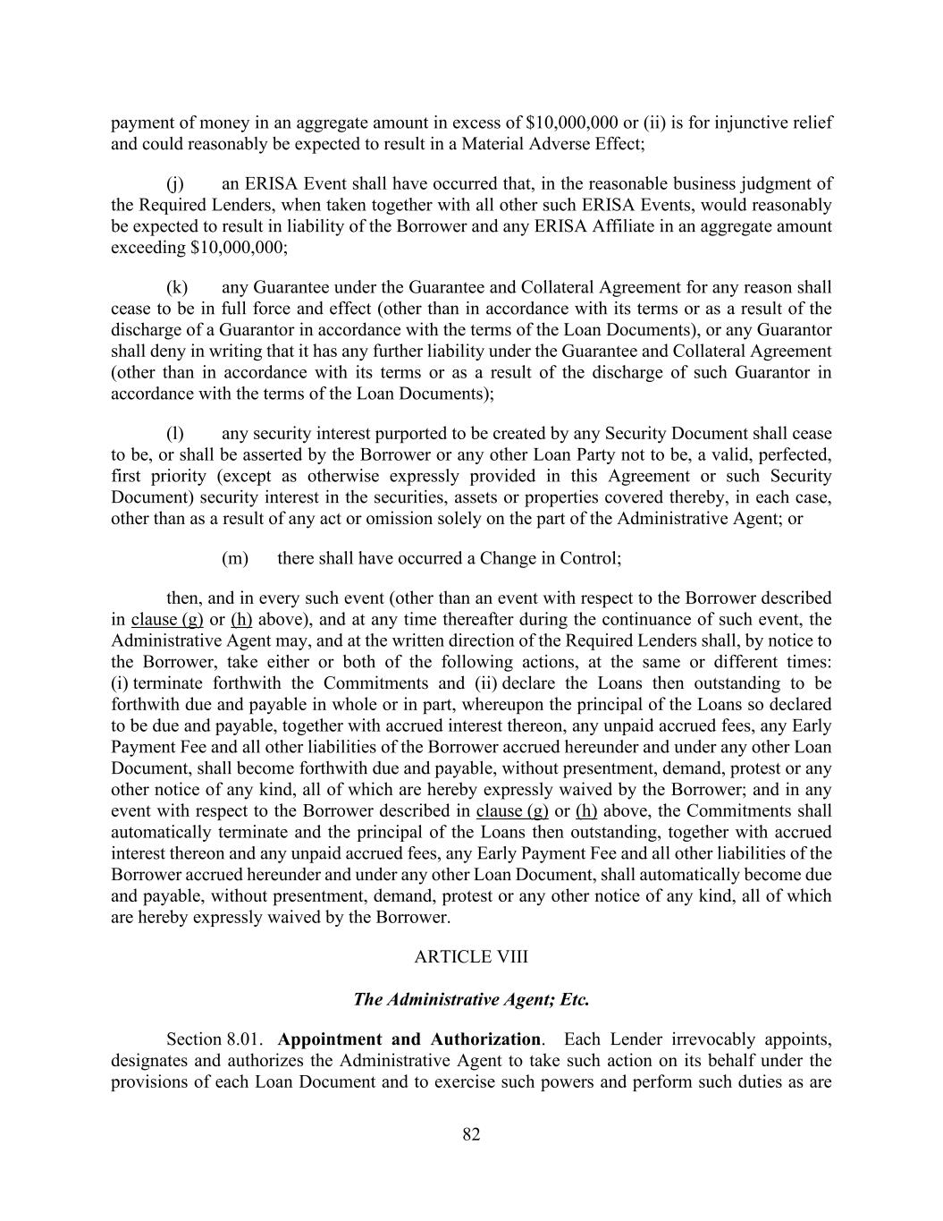 82 payment of money in an aggregate amount in excess of $10,000,000 or (ii) is for injunctive relief and could reasonably be expected to result in a Material Adverse Effect; (j) an ERISA Event shall have occurred that, in the reasonable business judgment of the Required Lenders, when taken together with all other such ERISA Events, would reasonably be expected to result in liability of the Borrower and any ERISA Affiliate in an aggregate amount exceeding $10,000,000; (k) any Guarantee under the Guarantee and Collateral Agreement for any reason shall cease to be in full force and effect (other than in accordance with its terms or as a result of the discharge of a Guarantor in accordance with the terms of the Loan Documents), or any Guarantor shall deny in writing that it has any further liability under the Guarantee and Collateral Agreement (other than in accordance with its terms or as a result of the discharge of such Guarantor in accordance with the terms of the Loan Documents); (l) any security interest purported to be created by any Security Document shall cease to be, or shall be asserted by the Borrower or any other Loan Party not to be, a valid, perfected, first priority (except as otherwise expressly provided in this Agreement or such Security Document) security interest in the securities, assets or properties covered thereby, in each case, other than as a result of any act or omission solely on the part of the Administrative Agent; or (m) there shall have occurred a Change in Control; then, and in every such event (other than an event with respect to the Borrower described in clause (g) or (h) above), and at any time thereafter during the continuance of such event, the Administrative Agent may, and at the written direction of the Required Lenders shall, by notice to the Borrower, take either or both of the following actions, at the same or different times: (i) terminate forthwith the Commitments and (ii) declare the Loans then outstanding to be forthwith due and payable in whole or in part, whereupon the principal of the Loans so declared to be due and payable, together with accrued interest thereon, any unpaid accrued fees, any Early Payment Fee and all other liabilities of the Borrower accrued hereunder and under any other Loan Document, shall become forthwith due and payable, without presentment, demand, protest or any other notice of any kind, all of which are hereby expressly waived by the Borrower; and in any event with respect to the Borrower described in clause (g) or (h) above, the Commitments shall automatically terminate and the principal of the Loans then outstanding, together with accrued interest thereon and any unpaid accrued fees, any Early Payment Fee and all other liabilities of the Borrower accrued hereunder and under any other Loan Document, shall automatically become due and payable, without presentment, demand, protest or any other notice of any kind, all of which are hereby expressly waived by the Borrower. ARTICLE VIII The Administrative Agent; Etc. Section 8.01. Appointment and Authorization. Each Lender irrevocably appoints, designates and authorizes the Administrative Agent to take such action on its behalf under the provisions of each Loan Document and to exercise such powers and perform such duties as are