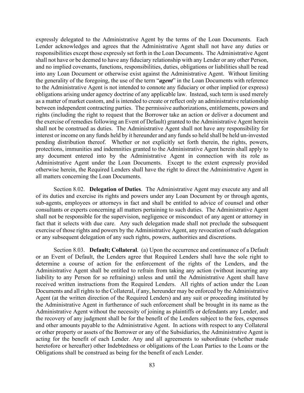 83 expressly delegated to the Administrative Agent by the terms of the Loan Documents. Each Lender acknowledges and agrees that the Administrative Agent shall not have any duties or responsibilities except those expressly set forth in the Loan Documents. The Administrative Agent shall not have or be deemed to have any fiduciary relationship with any Lender or any other Person, and no implied covenants, functions, responsibilities, duties, obligations or liabilities shall be read into any Loan Document or otherwise exist against the Administrative Agent. Without limiting the generality of the foregoing, the use of the term “agent” in the Loan Documents with reference to the Administrative Agent is not intended to connote any fiduciary or other implied (or express) obligations arising under agency doctrine of any applicable law. Instead, such term is used merely as a matter of market custom, and is intended to create or reflect only an administrative relationship between independent contracting parties. The permissive authorizations, entitlements, powers and rights (including the right to request that the Borrower take an action or deliver a document and the exercise of remedies following an Event of Default) granted to the Administrative Agent herein shall not be construed as duties. The Administrative Agent shall not have any responsibility for interest or income on any funds held by it hereunder and any funds so held shall be held un-invested pending distribution thereof. Whether or not explicitly set forth therein, the rights, powers, protections, immunities and indemnities granted to the Administrative Agent herein shall apply to any document entered into by the Administrative Agent in connection with its role as Administrative Agent under the Loan Documents. Except to the extent expressly provided otherwise herein, the Required Lenders shall have the right to direct the Administrative Agent in all matters concerning the Loan Documents. Section 8.02. Delegation of Duties. The Administrative Agent may execute any and all of its duties and exercise its rights and powers under any Loan Document by or through agents, sub-agents, employees or attorneys in fact and shall be entitled to advice of counsel and other consultants or experts concerning all matters pertaining to such duties. The Administrative Agent shall not be responsible for the supervision, negligence or misconduct of any agent or attorney in fact that it selects with due care. Any such delegation made shall not preclude the subsequent exercise of those rights and powers by the Administrative Agent, any revocation of such delegation or any subsequent delegation of any such rights, powers, authorities and discretions. Section 8.03. Default; Collateral. (a) Upon the occurrence and continuance of a Default or an Event of Default, the Lenders agree that Required Lenders shall have the sole right to determine a course of action for the enforcement of the rights of the Lenders, and the Administrative Agent shall be entitled to refrain from taking any action (without incurring any liability to any Person for so refraining) unless and until the Administrative Agent shall have received written instructions from the Required Lenders. All rights of action under the Loan Documents and all rights to the Collateral, if any, hereunder may be enforced by the Administrative Agent (at the written direction of the Required Lenders) and any suit or proceeding instituted by the Administrative Agent in furtherance of such enforcement shall be brought in its name as the Administrative Agent without the necessity of joining as plaintiffs or defendants any Lender, and the recovery of any judgment shall be for the benefit of the Lenders subject to the fees, expenses and other amounts payable to the Administrative Agent. In actions with respect to any Collateral or other property or assets of the Borrower or any of the Subsidiaries, the Administrative Agent is acting for the benefit of each Lender. Any and all agreements to subordinate (whether made heretofore or hereafter) other Indebtedness or obligations of the Loan Parties to the Loans or the Obligations shall be construed as being for the benefit of each Lender.