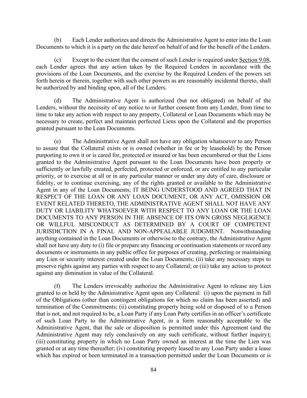 84 (b) Each Lender authorizes and directs the Administrative Agent to enter into the Loan Documents to which it is a party on the date hereof on behalf of and for the benefit of the Lenders. (c) Except to the extent that the consent of such Lender is required under Section 9.08, each Lender agrees that any action taken by the Required Lenders in accordance with the provisions of the Loan Documents, and the exercise by the Required Lenders of the powers set forth herein or therein, together with such other powers as are reasonably incidental thereto, shall be authorized by and binding upon, all of the Lenders. (d) The Administrative Agent is authorized (but not obligated) on behalf of the Lenders, without the necessity of any notice to or further consent from any Lender, from time to time to take any action with respect to any property, Collateral or Loan Documents which may be necessary to create, perfect and maintain perfected Liens upon the Collateral and the properties granted pursuant to the Loan Documents. (e) The Administrative Agent shall not have any obligation whatsoever to any Person to assure that the Collateral exists or is owned (whether in fee or by leasehold) by the Person purporting to own it or is cared for, protected or insured or has been encumbered or that the Liens granted to the Administrative Agent pursuant to the Loan Documents have been properly or sufficiently or lawfully created, perfected, protected or enforced, or are entitled to any particular priority, or to exercise at all or in any particular manner or under any duty of care, disclosure or fidelity, or to continue exercising, any of the rights granted or available to the Administrative Agent in any of the Loan Documents; IT BEING UNDERSTOOD AND AGREED THAT IN RESPECT OF THE LOAN OR ANY LOAN DOCUMENT, OR ANY ACT, OMISSION OR EVENT RELATED THERETO, THE ADMINISTRATIVE AGENT SHALL NOT HAVE ANY DUTY OR LIABILITY WHATSOEVER WITH RESPECT TO ANY LOAN OR THE LOAN DOCUMENTS TO ANY PERSON IN THE ABSENCE OF ITS OWN GROSS NEGLIGENCE OR WILLFUL MISCONDUCT AS DETERMINED BY A COURT OF COMPETENT JURISDICTION IN A FINAL AND NON-APPEALABLE JUDGMENT. Notwithstanding anything contained in the Loan Documents or otherwise to the contrary, the Administrative Agent shall not have any duty to (i) file or prepare any financing or continuation statements or record any documents or instruments in any public office for purposes of creating, perfecting or maintaining any Lien or security interest created under the Loan Documents; (ii) take any necessary steps to preserve rights against any parties with respect to any Collateral; or (iii) take any action to protect against any diminution in value of the Collateral. (f) The Lenders irrevocably authorize the Administrative Agent to release any Lien granted to or held by the Administrative Agent upon any Collateral: (i) upon the payment in full of the Obligations (other than contingent obligations for which no claim has been asserted) and termination of the Commitments; (ii) constituting property being sold or disposed of to a Person that is not, and not required to be, a Loan Party if any Loan Party certifies in an officer’s certificate of such Loan Party to the Administrative Agent, in a form reasonably acceptable to the Administrative Agent, that the sale or disposition is permitted under this Agreement (and the Administrative Agent may rely conclusively on any such certificate, without further inquiry); (iii) constituting property in which no Loan Party owned an interest at the time the Lien was granted or at any time thereafter; (iv) constituting property leased to any Loan Party under a lease which has expired or been terminated in a transaction permitted under the Loan Documents or is