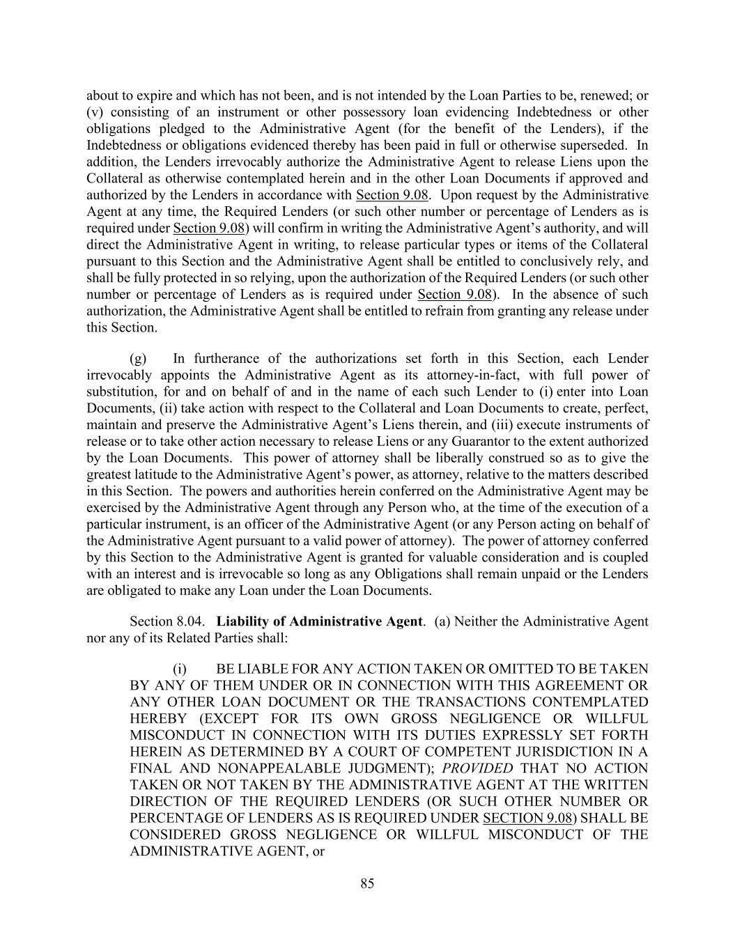 85 about to expire and which has not been, and is not intended by the Loan Parties to be, renewed; or (v) consisting of an instrument or other possessory loan evidencing Indebtedness or other obligations pledged to the Administrative Agent (for the benefit of the Lenders), if the Indebtedness or obligations evidenced thereby has been paid in full or otherwise superseded. In addition, the Lenders irrevocably authorize the Administrative Agent to release Liens upon the Collateral as otherwise contemplated herein and in the other Loan Documents if approved and authorized by the Lenders in accordance with Section 9.08. Upon request by the Administrative Agent at any time, the Required Lenders (or such other number or percentage of Lenders as is required under Section 9.08) will confirm in writing the Administrative Agent’s authority, and will direct the Administrative Agent in writing, to release particular types or items of the Collateral pursuant to this Section and the Administrative Agent shall be entitled to conclusively rely, and shall be fully protected in so relying, upon the authorization of the Required Lenders (or such other number or percentage of Lenders as is required under Section 9.08). In the absence of such authorization, the Administrative Agent shall be entitled to refrain from granting any release under this Section. (g) In furtherance of the authorizations set forth in this Section, each Lender irrevocably appoints the Administrative Agent as its attorney-in-fact, with full power of substitution, for and on behalf of and in the name of each such Lender to (i) enter into Loan Documents, (ii) take action with respect to the Collateral and Loan Documents to create, perfect, maintain and preserve the Administrative Agent’s Liens therein, and (iii) execute instruments of release or to take other action necessary to release Liens or any Guarantor to the extent authorized by the Loan Documents. This power of attorney shall be liberally construed so as to give the greatest latitude to the Administrative Agent’s power, as attorney, relative to the matters described in this Section. The powers and authorities herein conferred on the Administrative Agent may be exercised by the Administrative Agent through any Person who, at the time of the execution of a particular instrument, is an officer of the Administrative Agent (or any Person acting on behalf of the Administrative Agent pursuant to a valid power of attorney). The power of attorney conferred by this Section to the Administrative Agent is granted for valuable consideration and is coupled with an interest and is irrevocable so long as any Obligations shall remain unpaid or the Lenders are obligated to make any Loan under the Loan Documents. Section 8.04. Liability of Administrative Agent. (a) Neither the Administrative Agent nor any of its Related Parties shall: (i) BE LIABLE FOR ANY ACTION TAKEN OR OMITTED TO BE TAKEN BY ANY OF THEM UNDER OR IN CONNECTION WITH THIS AGREEMENT OR ANY OTHER LOAN DOCUMENT OR THE TRANSACTIONS CONTEMPLATED HEREBY (EXCEPT FOR ITS OWN GROSS NEGLIGENCE OR WILLFUL MISCONDUCT IN CONNECTION WITH ITS DUTIES EXPRESSLY SET FORTH HEREIN AS DETERMINED BY A COURT OF COMPETENT JURISDICTION IN A FINAL AND NONAPPEALABLE JUDGMENT); PROVIDED THAT NO ACTION TAKEN OR NOT TAKEN BY THE ADMINISTRATIVE AGENT AT THE WRITTEN DIRECTION OF THE REQUIRED LENDERS (OR SUCH OTHER NUMBER OR PERCENTAGE OF LENDERS AS IS REQUIRED UNDER SECTION 9.08) SHALL BE CONSIDERED GROSS NEGLIGENCE OR WILLFUL MISCONDUCT OF THE ADMINISTRATIVE AGENT, or