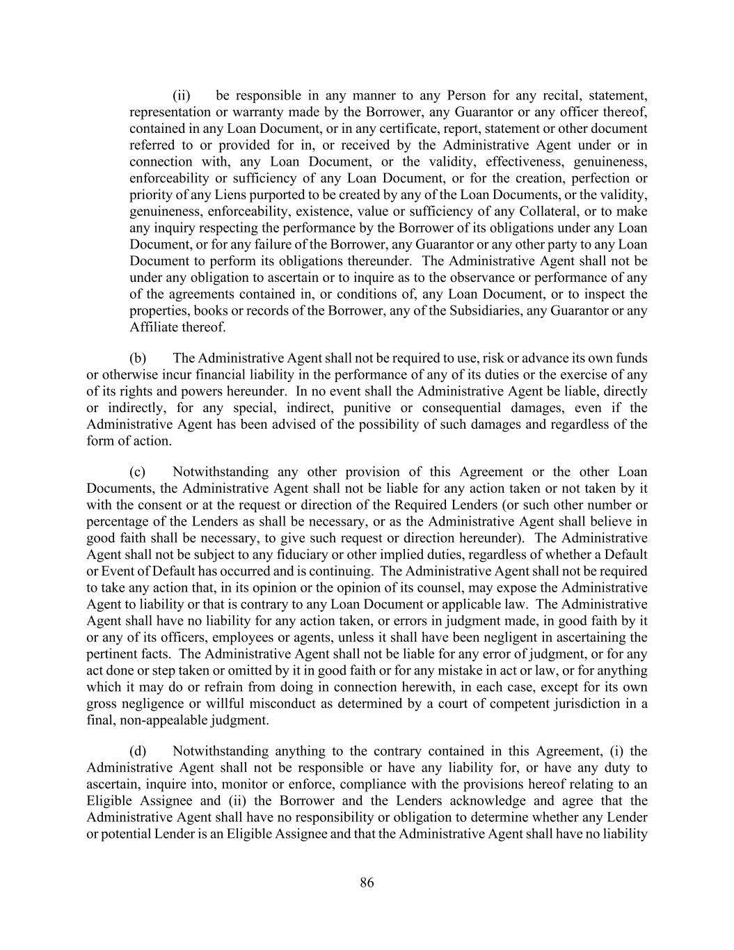 86 (ii) be responsible in any manner to any Person for any recital, statement, representation or warranty made by the Borrower, any Guarantor or any officer thereof, contained in any Loan Document, or in any certificate, report, statement or other document referred to or provided for in, or received by the Administrative Agent under or in connection with, any Loan Document, or the validity, effectiveness, genuineness, enforceability or sufficiency of any Loan Document, or for the creation, perfection or priority of any Liens purported to be created by any of the Loan Documents, or the validity, genuineness, enforceability, existence, value or sufficiency of any Collateral, or to make any inquiry respecting the performance by the Borrower of its obligations under any Loan Document, or for any failure of the Borrower, any Guarantor or any other party to any Loan Document to perform its obligations thereunder. The Administrative Agent shall not be under any obligation to ascertain or to inquire as to the observance or performance of any of the agreements contained in, or conditions of, any Loan Document, or to inspect the properties, books or records of the Borrower, any of the Subsidiaries, any Guarantor or any Affiliate thereof. (b) The Administrative Agent shall not be required to use, risk or advance its own funds or otherwise incur financial liability in the performance of any of its duties or the exercise of any of its rights and powers hereunder. In no event shall the Administrative Agent be liable, directly or indirectly, for any special, indirect, punitive or consequential damages, even if the Administrative Agent has been advised of the possibility of such damages and regardless of the form of action. (c) Notwithstanding any other provision of this Agreement or the other Loan Documents, the Administrative Agent shall not be liable for any action taken or not taken by it with the consent or at the request or direction of the Required Lenders (or such other number or percentage of the Lenders as shall be necessary, or as the Administrative Agent shall believe in good faith shall be necessary, to give such request or direction hereunder). The Administrative Agent shall not be subject to any fiduciary or other implied duties, regardless of whether a Default or Event of Default has occurred and is continuing. The Administrative Agent shall not be required to take any action that, in its opinion or the opinion of its counsel, may expose the Administrative Agent to liability or that is contrary to any Loan Document or applicable law. The Administrative Agent shall have no liability for any action taken, or errors in judgment made, in good faith by it or any of its officers, employees or agents, unless it shall have been negligent in ascertaining the pertinent facts. The Administrative Agent shall not be liable for any error of judgment, or for any act done or step taken or omitted by it in good faith or for any mistake in act or law, or for anything which it may do or refrain from doing in connection herewith, in each case, except for its own gross negligence or willful misconduct as determined by a court of competent jurisdiction in a final, non-appealable judgment. (d) Notwithstanding anything to the contrary contained in this Agreement, (i) the Administrative Agent shall not be responsible or have any liability for, or have any duty to ascertain, inquire into, monitor or enforce, compliance with the provisions hereof relating to an Eligible Assignee and (ii) the Borrower and the Lenders acknowledge and agree that the Administrative Agent shall have no responsibility or obligation to determine whether any Lender or potential Lender is an Eligible Assignee and that the Administrative Agent shall have no liability