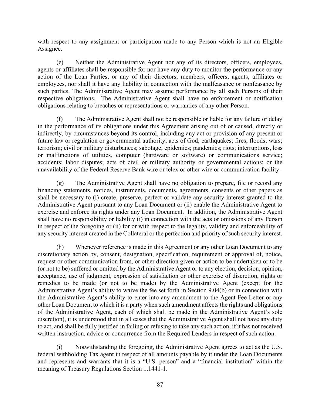 87 with respect to any assignment or participation made to any Person which is not an Eligible Assignee. (e) Neither the Administrative Agent nor any of its directors, officers, employees, agents or affiliates shall be responsible for nor have any duty to monitor the performance or any action of the Loan Parties, or any of their directors, members, officers, agents, affiliates or employees, nor shall it have any liability in connection with the malfeasance or nonfeasance by such parties. The Administrative Agent may assume performance by all such Persons of their respective obligations. The Administrative Agent shall have no enforcement or notification obligations relating to breaches or representations or warranties of any other Person. (f) The Administrative Agent shall not be responsible or liable for any failure or delay in the performance of its obligations under this Agreement arising out of or caused, directly or indirectly, by circumstances beyond its control, including any act or provision of any present or future law or regulation or governmental authority; acts of God; earthquakes; fires; floods; wars; terrorism; civil or military disturbances; sabotage; epidemics; pandemics; riots; interruptions, loss or malfunctions of utilities, computer (hardware or software) or communications service; accidents; labor disputes; acts of civil or military authority or governmental actions; or the unavailability of the Federal Reserve Bank wire or telex or other wire or communication facility. (g) The Administrative Agent shall have no obligation to prepare, file or record any financing statements, notices, instruments, documents, agreements, consents or other papers as shall be necessary to (i) create, preserve, perfect or validate any security interest granted to the Administrative Agent pursuant to any Loan Document or (ii) enable the Administrative Agent to exercise and enforce its rights under any Loan Document. In addition, the Administrative Agent shall have no responsibility or liability (i) in connection with the acts or omissions of any Person in respect of the foregoing or (ii) for or with respect to the legality, validity and enforceability of any security interest created in the Collateral or the perfection and priority of such security interest. (h) Whenever reference is made in this Agreement or any other Loan Document to any discretionary action by, consent, designation, specification, requirement or approval of, notice, request or other communication from, or other direction given or action to be undertaken or to be (or not to be) suffered or omitted by the Administrative Agent or to any election, decision, opinion, acceptance, use of judgment, expression of satisfaction or other exercise of discretion, rights or remedies to be made (or not to be made) by the Administrative Agent (except for the Administrative Agent’s ability to waive the fee set forth in Section 9.04(b) or in connection with the Administrative Agent’s ability to enter into any amendment to the Agent Fee Letter or any other Loan Document to which it is a party when such amendment affects the rights and obligations of the Administrative Agent, each of which shall be made in the Administrative Agent’s sole discretion), it is understood that in all cases that the Administrative Agent shall not have any duty to act, and shall be fully justified in failing or refusing to take any such action, if it has not received written instruction, advice or concurrence from the Required Lenders in respect of such action. (i) Notwithstanding the foregoing, the Administrative Agent agrees to act as the U.S. federal withholding Tax agent in respect of all amounts payable by it under the Loan Documents and represents and warrants that it is a “U.S. person” and a “financial institution” within the meaning of Treasury Regulations Section 1.1441-1.