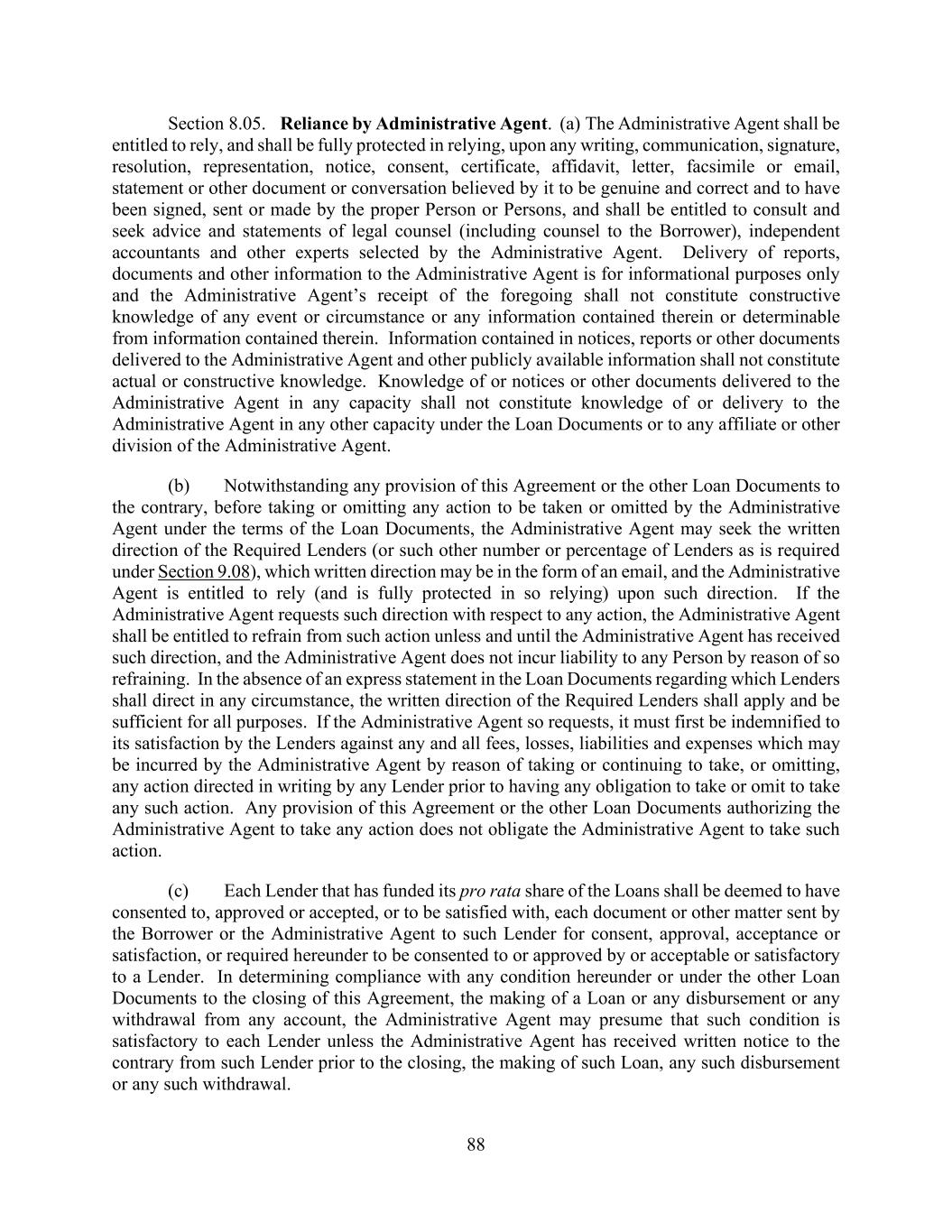 88 Section 8.05. Reliance by Administrative Agent. (a) The Administrative Agent shall be entitled to rely, and shall be fully protected in relying, upon any writing, communication, signature, resolution, representation, notice, consent, certificate, affidavit, letter, facsimile or email, statement or other document or conversation believed by it to be genuine and correct and to have been signed, sent or made by the proper Person or Persons, and shall be entitled to consult and seek advice and statements of legal counsel (including counsel to the Borrower), independent accountants and other experts selected by the Administrative Agent. Delivery of reports, documents and other information to the Administrative Agent is for informational purposes only and the Administrative Agent’s receipt of the foregoing shall not constitute constructive knowledge of any event or circumstance or any information contained therein or determinable from information contained therein. Information contained in notices, reports or other documents delivered to the Administrative Agent and other publicly available information shall not constitute actual or constructive knowledge. Knowledge of or notices or other documents delivered to the Administrative Agent in any capacity shall not constitute knowledge of or delivery to the Administrative Agent in any other capacity under the Loan Documents or to any affiliate or other division of the Administrative Agent. (b) Notwithstanding any provision of this Agreement or the other Loan Documents to the contrary, before taking or omitting any action to be taken or omitted by the Administrative Agent under the terms of the Loan Documents, the Administrative Agent may seek the written direction of the Required Lenders (or such other number or percentage of Lenders as is required under Section 9.08), which written direction may be in the form of an email, and the Administrative Agent is entitled to rely (and is fully protected in so relying) upon such direction. If the Administrative Agent requests such direction with respect to any action, the Administrative Agent shall be entitled to refrain from such action unless and until the Administrative Agent has received such direction, and the Administrative Agent does not incur liability to any Person by reason of so refraining. In the absence of an express statement in the Loan Documents regarding which Lenders shall direct in any circumstance, the written direction of the Required Lenders shall apply and be sufficient for all purposes. If the Administrative Agent so requests, it must first be indemnified to its satisfaction by the Lenders against any and all fees, losses, liabilities and expenses which may be incurred by the Administrative Agent by reason of taking or continuing to take, or omitting, any action directed in writing by any Lender prior to having any obligation to take or omit to take any such action. Any provision of this Agreement or the other Loan Documents authorizing the Administrative Agent to take any action does not obligate the Administrative Agent to take such action. (c) Each Lender that has funded its pro rata share of the Loans shall be deemed to have consented to, approved or accepted, or to be satisfied with, each document or other matter sent by the Borrower or the Administrative Agent to such Lender for consent, approval, acceptance or satisfaction, or required hereunder to be consented to or approved by or acceptable or satisfactory to a Lender. In determining compliance with any condition hereunder or under the other Loan Documents to the closing of this Agreement, the making of a Loan or any disbursement or any withdrawal from any account, the Administrative Agent may presume that such condition is satisfactory to each Lender unless the Administrative Agent has received written notice to the contrary from such Lender prior to the closing, the making of such Loan, any such disbursement or any such withdrawal.
