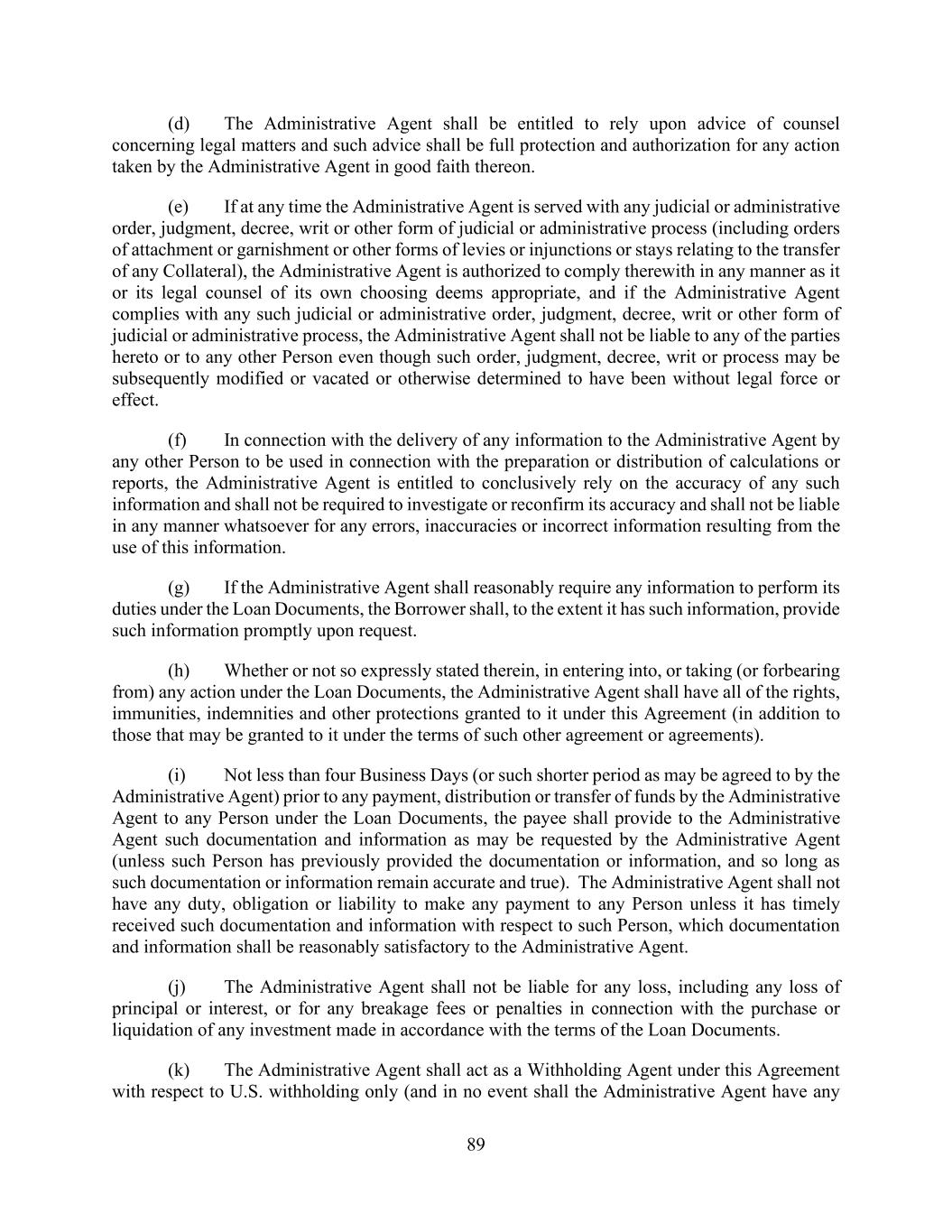 89 (d) The Administrative Agent shall be entitled to rely upon advice of counsel concerning legal matters and such advice shall be full protection and authorization for any action taken by the Administrative Agent in good faith thereon. (e) If at any time the Administrative Agent is served with any judicial or administrative order, judgment, decree, writ or other form of judicial or administrative process (including orders of attachment or garnishment or other forms of levies or injunctions or stays relating to the transfer of any Collateral), the Administrative Agent is authorized to comply therewith in any manner as it or its legal counsel of its own choosing deems appropriate, and if the Administrative Agent complies with any such judicial or administrative order, judgment, decree, writ or other form of judicial or administrative process, the Administrative Agent shall not be liable to any of the parties hereto or to any other Person even though such order, judgment, decree, writ or process may be subsequently modified or vacated or otherwise determined to have been without legal force or effect. (f) In connection with the delivery of any information to the Administrative Agent by any other Person to be used in connection with the preparation or distribution of calculations or reports, the Administrative Agent is entitled to conclusively rely on the accuracy of any such information and shall not be required to investigate or reconfirm its accuracy and shall not be liable in any manner whatsoever for any errors, inaccuracies or incorrect information resulting from the use of this information. (g) If the Administrative Agent shall reasonably require any information to perform its duties under the Loan Documents, the Borrower shall, to the extent it has such information, provide such information promptly upon request. (h) Whether or not so expressly stated therein, in entering into, or taking (or forbearing from) any action under the Loan Documents, the Administrative Agent shall have all of the rights, immunities, indemnities and other protections granted to it under this Agreement (in addition to those that may be granted to it under the terms of such other agreement or agreements). (i) Not less than four Business Days (or such shorter period as may be agreed to by the Administrative Agent) prior to any payment, distribution or transfer of funds by the Administrative Agent to any Person under the Loan Documents, the payee shall provide to the Administrative Agent such documentation and information as may be requested by the Administrative Agent (unless such Person has previously provided the documentation or information, and so long as such documentation or information remain accurate and true). The Administrative Agent shall not have any duty, obligation or liability to make any payment to any Person unless it has timely received such documentation and information with respect to such Person, which documentation and information shall be reasonably satisfactory to the Administrative Agent. (j) The Administrative Agent shall not be liable for any loss, including any loss of principal or interest, or for any breakage fees or penalties in connection with the purchase or liquidation of any investment made in accordance with the terms of the Loan Documents. (k) The Administrative Agent shall act as a Withholding Agent under this Agreement with respect to U.S. withholding only (and in no event shall the Administrative Agent have any