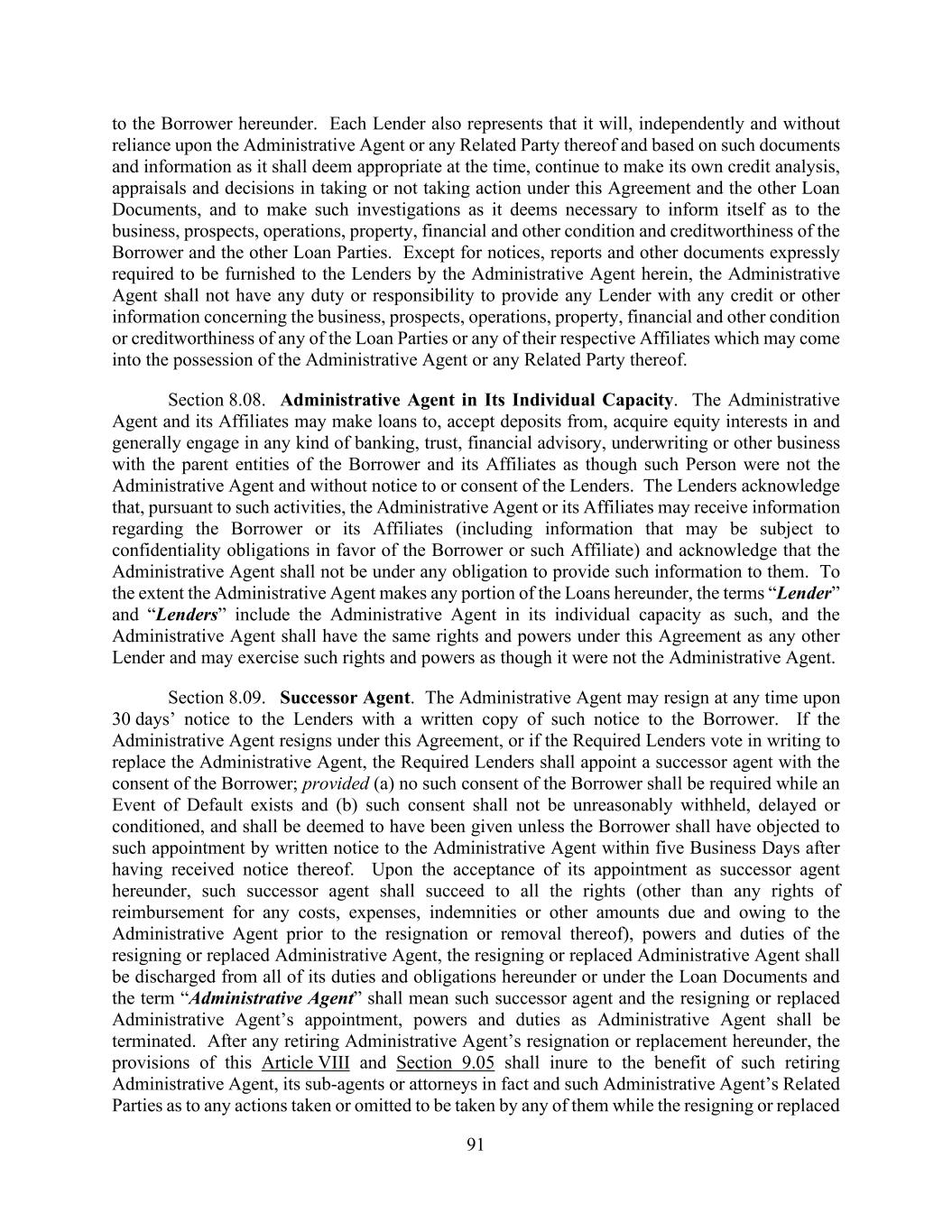 91 to the Borrower hereunder. Each Lender also represents that it will, independently and without reliance upon the Administrative Agent or any Related Party thereof and based on such documents and information as it shall deem appropriate at the time, continue to make its own credit analysis, appraisals and decisions in taking or not taking action under this Agreement and the other Loan Documents, and to make such investigations as it deems necessary to inform itself as to the business, prospects, operations, property, financial and other condition and creditworthiness of the Borrower and the other Loan Parties. Except for notices, reports and other documents expressly required to be furnished to the Lenders by the Administrative Agent herein, the Administrative Agent shall not have any duty or responsibility to provide any Lender with any credit or other information concerning the business, prospects, operations, property, financial and other condition or creditworthiness of any of the Loan Parties or any of their respective Affiliates which may come into the possession of the Administrative Agent or any Related Party thereof. Section 8.08. Administrative Agent in Its Individual Capacity. The Administrative Agent and its Affiliates may make loans to, accept deposits from, acquire equity interests in and generally engage in any kind of banking, trust, financial advisory, underwriting or other business with the parent entities of the Borrower and its Affiliates as though such Person were not the Administrative Agent and without notice to or consent of the Lenders. The Lenders acknowledge that, pursuant to such activities, the Administrative Agent or its Affiliates may receive information regarding the Borrower or its Affiliates (including information that may be subject to confidentiality obligations in favor of the Borrower or such Affiliate) and acknowledge that the Administrative Agent shall not be under any obligation to provide such information to them. To the extent the Administrative Agent makes any portion of the Loans hereunder, the terms “Lender” and “Lenders” include the Administrative Agent in its individual capacity as such, and the Administrative Agent shall have the same rights and powers under this Agreement as any other Lender and may exercise such rights and powers as though it were not the Administrative Agent. Section 8.09. Successor Agent. The Administrative Agent may resign at any time upon 30 days’ notice to the Lenders with a written copy of such notice to the Borrower. If the Administrative Agent resigns under this Agreement, or if the Required Lenders vote in writing to replace the Administrative Agent, the Required Lenders shall appoint a successor agent with the consent of the Borrower; provided (a) no such consent of the Borrower shall be required while an Event of Default exists and (b) such consent shall not be unreasonably withheld, delayed or conditioned, and shall be deemed to have been given unless the Borrower shall have objected to such appointment by written notice to the Administrative Agent within five Business Days after having received notice thereof. Upon the acceptance of its appointment as successor agent hereunder, such successor agent shall succeed to all the rights (other than any rights of reimbursement for any costs, expenses, indemnities or other amounts due and owing to the Administrative Agent prior to the resignation or removal thereof), powers and duties of the resigning or replaced Administrative Agent, the resigning or replaced Administrative Agent shall be discharged from all of its duties and obligations hereunder or under the Loan Documents and the term “Administrative Agent” shall mean such successor agent and the resigning or replaced Administrative Agent’s appointment, powers and duties as Administrative Agent shall be terminated. After any retiring Administrative Agent’s resignation or replacement hereunder, the provisions of this Article VIII and Section 9.05 shall inure to the benefit of such retiring Administrative Agent, its sub-agents or attorneys in fact and such Administrative Agent’s Related Parties as to any actions taken or omitted to be taken by any of them while the resigning or replaced