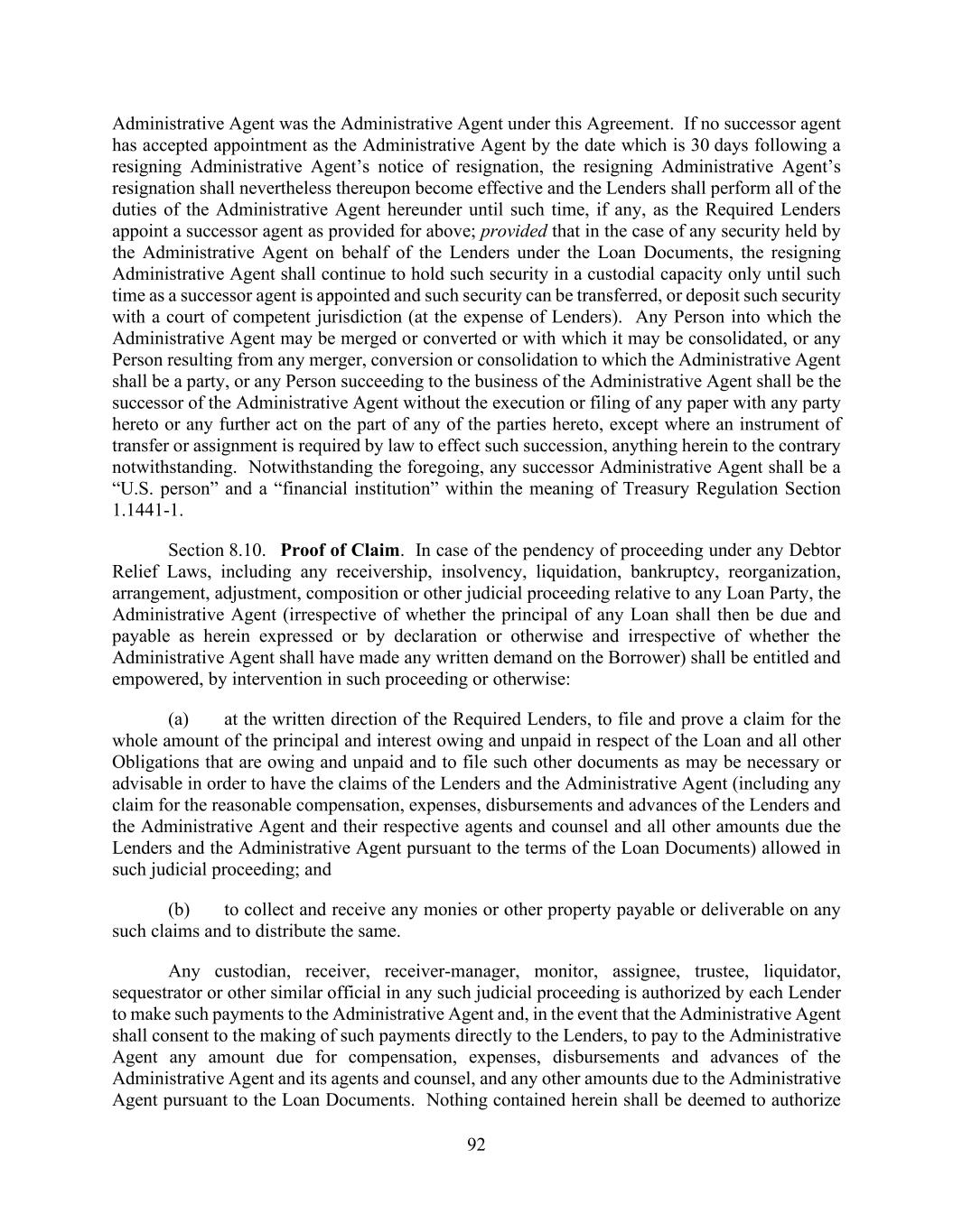 92 Administrative Agent was the Administrative Agent under this Agreement. If no successor agent has accepted appointment as the Administrative Agent by the date which is 30 days following a resigning Administrative Agent’s notice of resignation, the resigning Administrative Agent’s resignation shall nevertheless thereupon become effective and the Lenders shall perform all of the duties of the Administrative Agent hereunder until such time, if any, as the Required Lenders appoint a successor agent as provided for above; provided that in the case of any security held by the Administrative Agent on behalf of the Lenders under the Loan Documents, the resigning Administrative Agent shall continue to hold such security in a custodial capacity only until such time as a successor agent is appointed and such security can be transferred, or deposit such security with a court of competent jurisdiction (at the expense of Lenders). Any Person into which the Administrative Agent may be merged or converted or with which it may be consolidated, or any Person resulting from any merger, conversion or consolidation to which the Administrative Agent shall be a party, or any Person succeeding to the business of the Administrative Agent shall be the successor of the Administrative Agent without the execution or filing of any paper with any party hereto or any further act on the part of any of the parties hereto, except where an instrument of transfer or assignment is required by law to effect such succession, anything herein to the contrary notwithstanding. Notwithstanding the foregoing, any successor Administrative Agent shall be a “U.S. person” and a “financial institution” within the meaning of Treasury Regulation Section 1.1441-1. Section 8.10. Proof of Claim. In case of the pendency of proceeding under any Debtor Relief Laws, including any receivership, insolvency, liquidation, bankruptcy, reorganization, arrangement, adjustment, composition or other judicial proceeding relative to any Loan Party, the Administrative Agent (irrespective of whether the principal of any Loan shall then be due and payable as herein expressed or by declaration or otherwise and irrespective of whether the Administrative Agent shall have made any written demand on the Borrower) shall be entitled and empowered, by intervention in such proceeding or otherwise: (a) at the written direction of the Required Lenders, to file and prove a claim for the whole amount of the principal and interest owing and unpaid in respect of the Loan and all other Obligations that are owing and unpaid and to file such other documents as may be necessary or advisable in order to have the claims of the Lenders and the Administrative Agent (including any claim for the reasonable compensation, expenses, disbursements and advances of the Lenders and the Administrative Agent and their respective agents and counsel and all other amounts due the Lenders and the Administrative Agent pursuant to the terms of the Loan Documents) allowed in such judicial proceeding; and (b) to collect and receive any monies or other property payable or deliverable on any such claims and to distribute the same. Any custodian, receiver, receiver-manager, monitor, assignee, trustee, liquidator, sequestrator or other similar official in any such judicial proceeding is authorized by each Lender to make such payments to the Administrative Agent and, in the event that the Administrative Agent shall consent to the making of such payments directly to the Lenders, to pay to the Administrative Agent any amount due for compensation, expenses, disbursements and advances of the Administrative Agent and its agents and counsel, and any other amounts due to the Administrative Agent pursuant to the Loan Documents. Nothing contained herein shall be deemed to authorize