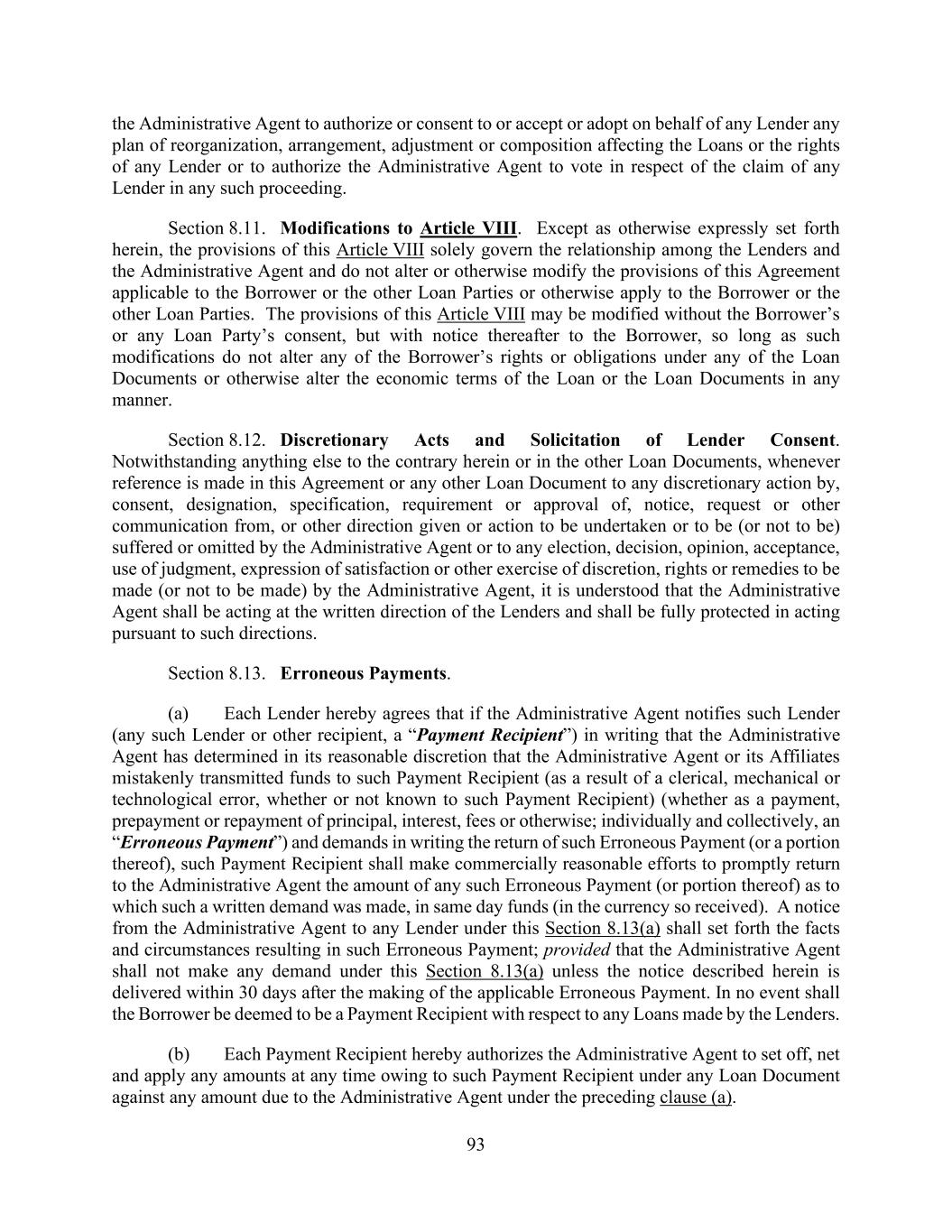 93 the Administrative Agent to authorize or consent to or accept or adopt on behalf of any Lender any plan of reorganization, arrangement, adjustment or composition affecting the Loans or the rights of any Lender or to authorize the Administrative Agent to vote in respect of the claim of any Lender in any such proceeding. Section 8.11. Modifications to Article VIII. Except as otherwise expressly set forth herein, the provisions of this Article VIII solely govern the relationship among the Lenders and the Administrative Agent and do not alter or otherwise modify the provisions of this Agreement applicable to the Borrower or the other Loan Parties or otherwise apply to the Borrower or the other Loan Parties. The provisions of this Article VIII may be modified without the Borrower’s or any Loan Party’s consent, but with notice thereafter to the Borrower, so long as such modifications do not alter any of the Borrower’s rights or obligations under any of the Loan Documents or otherwise alter the economic terms of the Loan or the Loan Documents in any manner. Section 8.12. Discretionary Acts and Solicitation of Lender Consent. Notwithstanding anything else to the contrary herein or in the other Loan Documents, whenever reference is made in this Agreement or any other Loan Document to any discretionary action by, consent, designation, specification, requirement or approval of, notice, request or other communication from, or other direction given or action to be undertaken or to be (or not to be) suffered or omitted by the Administrative Agent or to any election, decision, opinion, acceptance, use of judgment, expression of satisfaction or other exercise of discretion, rights or remedies to be made (or not to be made) by the Administrative Agent, it is understood that the Administrative Agent shall be acting at the written direction of the Lenders and shall be fully protected in acting pursuant to such directions. Section 8.13. Erroneous Payments. (a) Each Lender hereby agrees that if the Administrative Agent notifies such Lender (any such Lender or other recipient, a “Payment Recipient”) in writing that the Administrative Agent has determined in its reasonable discretion that the Administrative Agent or its Affiliates mistakenly transmitted funds to such Payment Recipient (as a result of a clerical, mechanical or technological error, whether or not known to such Payment Recipient) (whether as a payment, prepayment or repayment of principal, interest, fees or otherwise; individually and collectively, an “Erroneous Payment”) and demands in writing the return of such Erroneous Payment (or a portion thereof), such Payment Recipient shall make commercially reasonable efforts to promptly return to the Administrative Agent the amount of any such Erroneous Payment (or portion thereof) as to which such a written demand was made, in same day funds (in the currency so received). A notice from the Administrative Agent to any Lender under this Section 8.13(a) shall set forth the facts and circumstances resulting in such Erroneous Payment; provided that the Administrative Agent shall not make any demand under this Section 8.13(a) unless the notice described herein is delivered within 30 days after the making of the applicable Erroneous Payment. In no event shall the Borrower be deemed to be a Payment Recipient with respect to any Loans made by the Lenders. (b) Each Payment Recipient hereby authorizes the Administrative Agent to set off, net and apply any amounts at any time owing to such Payment Recipient under any Loan Document against any amount due to the Administrative Agent under the preceding clause (a).