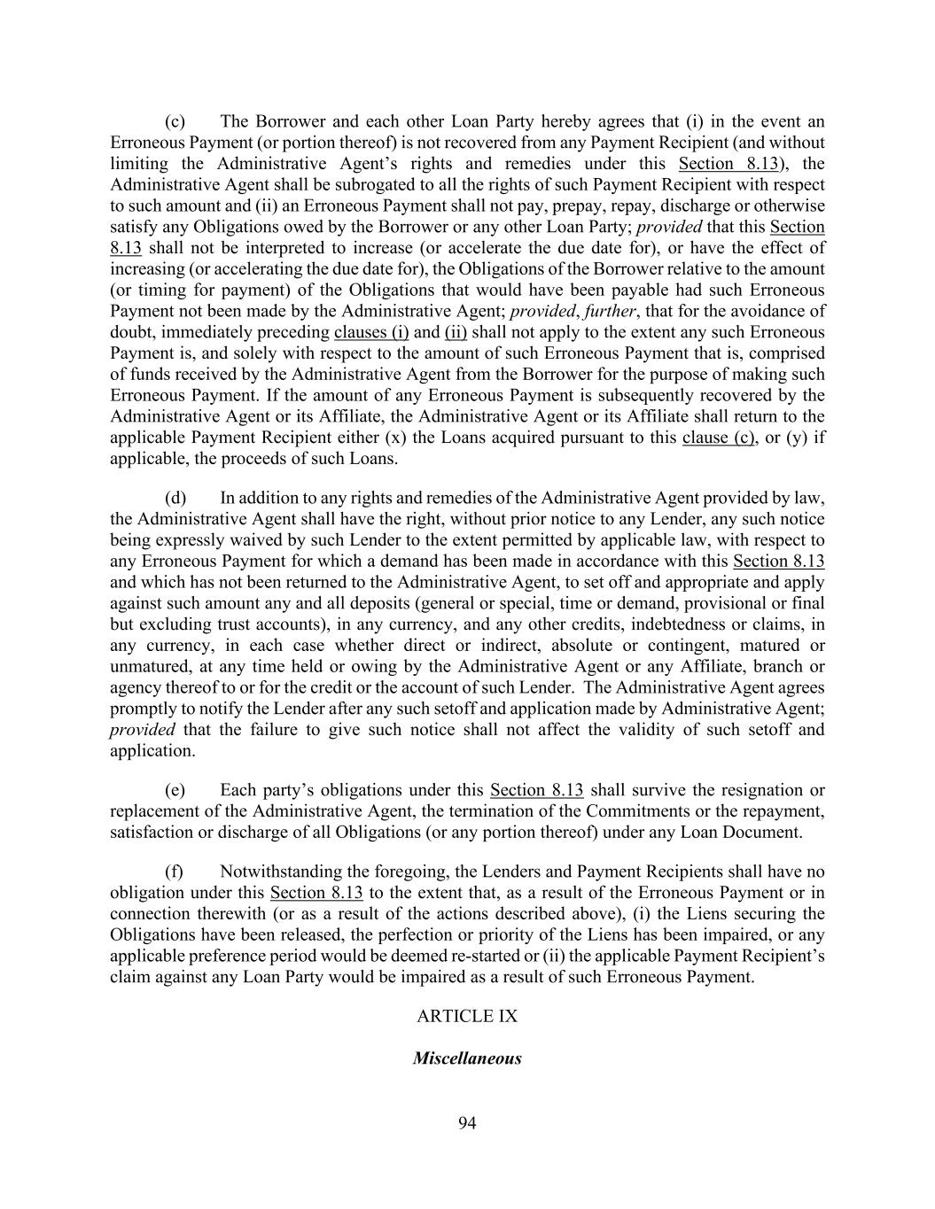 94 (c) The Borrower and each other Loan Party hereby agrees that (i) in the event an Erroneous Payment (or portion thereof) is not recovered from any Payment Recipient (and without limiting the Administrative Agent’s rights and remedies under this Section 8.13), the Administrative Agent shall be subrogated to all the rights of such Payment Recipient with respect to such amount and (ii) an Erroneous Payment shall not pay, prepay, repay, discharge or otherwise satisfy any Obligations owed by the Borrower or any other Loan Party; provided that this Section 8.13 shall not be interpreted to increase (or accelerate the due date for), or have the effect of increasing (or accelerating the due date for), the Obligations of the Borrower relative to the amount (or timing for payment) of the Obligations that would have been payable had such Erroneous Payment not been made by the Administrative Agent; provided, further, that for the avoidance of doubt, immediately preceding clauses (i) and (ii) shall not apply to the extent any such Erroneous Payment is, and solely with respect to the amount of such Erroneous Payment that is, comprised of funds received by the Administrative Agent from the Borrower for the purpose of making such Erroneous Payment. If the amount of any Erroneous Payment is subsequently recovered by the Administrative Agent or its Affiliate, the Administrative Agent or its Affiliate shall return to the applicable Payment Recipient either (x) the Loans acquired pursuant to this clause (c), or (y) if applicable, the proceeds of such Loans. (d) In addition to any rights and remedies of the Administrative Agent provided by law, the Administrative Agent shall have the right, without prior notice to any Lender, any such notice being expressly waived by such Lender to the extent permitted by applicable law, with respect to any Erroneous Payment for which a demand has been made in accordance with this Section 8.13 and which has not been returned to the Administrative Agent, to set off and appropriate and apply against such amount any and all deposits (general or special, time or demand, provisional or final but excluding trust accounts), in any currency, and any other credits, indebtedness or claims, in any currency, in each case whether direct or indirect, absolute or contingent, matured or unmatured, at any time held or owing by the Administrative Agent or any Affiliate, branch or agency thereof to or for the credit or the account of such Lender. The Administrative Agent agrees promptly to notify the Lender after any such setoff and application made by Administrative Agent; provided that the failure to give such notice shall not affect the validity of such setoff and application. (e) Each party’s obligations under this Section 8.13 shall survive the resignation or replacement of the Administrative Agent, the termination of the Commitments or the repayment, satisfaction or discharge of all Obligations (or any portion thereof) under any Loan Document. (f) Notwithstanding the foregoing, the Lenders and Payment Recipients shall have no obligation under this Section 8.13 to the extent that, as a result of the Erroneous Payment or in connection therewith (or as a result of the actions described above), (i) the Liens securing the Obligations have been released, the perfection or priority of the Liens has been impaired, or any applicable preference period would be deemed re-started or (ii) the applicable Payment Recipient’s claim against any Loan Party would be impaired as a result of such Erroneous Payment. ARTICLE IX Miscellaneous