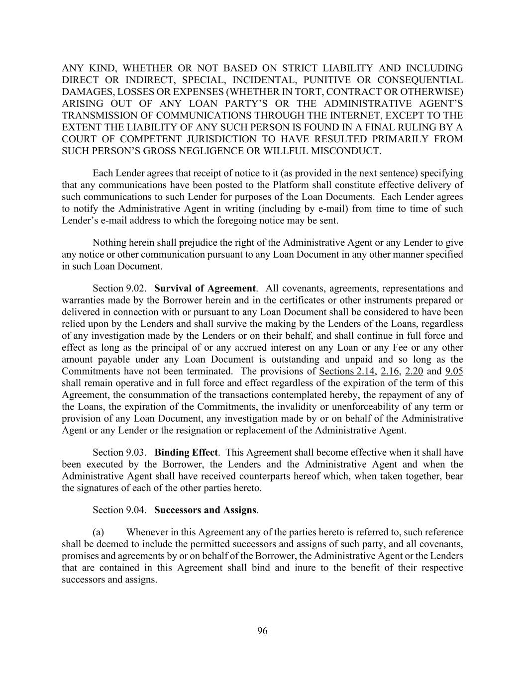 96 ANY KIND, WHETHER OR NOT BASED ON STRICT LIABILITY AND INCLUDING DIRECT OR INDIRECT, SPECIAL, INCIDENTAL, PUNITIVE OR CONSEQUENTIAL DAMAGES, LOSSES OR EXPENSES (WHETHER IN TORT, CONTRACT OR OTHERWISE) ARISING OUT OF ANY LOAN PARTY’S OR THE ADMINISTRATIVE AGENT’S TRANSMISSION OF COMMUNICATIONS THROUGH THE INTERNET, EXCEPT TO THE EXTENT THE LIABILITY OF ANY SUCH PERSON IS FOUND IN A FINAL RULING BY A COURT OF COMPETENT JURISDICTION TO HAVE RESULTED PRIMARILY FROM SUCH PERSON’S GROSS NEGLIGENCE OR WILLFUL MISCONDUCT. Each Lender agrees that receipt of notice to it (as provided in the next sentence) specifying that any communications have been posted to the Platform shall constitute effective delivery of such communications to such Lender for purposes of the Loan Documents. Each Lender agrees to notify the Administrative Agent in writing (including by e-mail) from time to time of such Lender’s e-mail address to which the foregoing notice may be sent. Nothing herein shall prejudice the right of the Administrative Agent or any Lender to give any notice or other communication pursuant to any Loan Document in any other manner specified in such Loan Document. Section 9.02. Survival of Agreement. All covenants, agreements, representations and warranties made by the Borrower herein and in the certificates or other instruments prepared or delivered in connection with or pursuant to any Loan Document shall be considered to have been relied upon by the Lenders and shall survive the making by the Lenders of the Loans, regardless of any investigation made by the Lenders or on their behalf, and shall continue in full force and effect as long as the principal of or any accrued interest on any Loan or any Fee or any other amount payable under any Loan Document is outstanding and unpaid and so long as the Commitments have not been terminated. The provisions of Sections 2.14, 2.16, 2.20 and 9.05 shall remain operative and in full force and effect regardless of the expiration of the term of this Agreement, the consummation of the transactions contemplated hereby, the repayment of any of the Loans, the expiration of the Commitments, the invalidity or unenforceability of any term or provision of any Loan Document, any investigation made by or on behalf of the Administrative Agent or any Lender or the resignation or replacement of the Administrative Agent. Section 9.03. Binding Effect. This Agreement shall become effective when it shall have been executed by the Borrower, the Lenders and the Administrative Agent and when the Administrative Agent shall have received counterparts hereof which, when taken together, bear the signatures of each of the other parties hereto. Section 9.04. Successors and Assigns. (a) Whenever in this Agreement any of the parties hereto is referred to, such reference shall be deemed to include the permitted successors and assigns of such party, and all covenants, promises and agreements by or on behalf of the Borrower, the Administrative Agent or the Lenders that are contained in this Agreement shall bind and inure to the benefit of their respective successors and assigns.