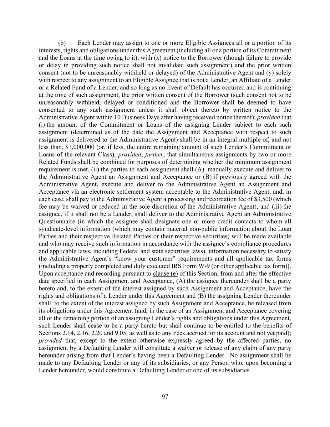 97 (b) Each Lender may assign to one or more Eligible Assignees all or a portion of its interests, rights and obligations under this Agreement (including all or a portion of its Commitment and the Loans at the time owing to it), with (x) notice to the Borrower (though failure to provide or delay in providing such notice shall not invalidate such assignment) and the prior written consent (not to be unreasonably withheld or delayed) of the Administrative Agent and (y) solely with respect to any assignment to an Eligible Assignee that is not a Lender, an Affiliate of a Lender or a Related Fund of a Lender, and so long as no Event of Default has occurred and is continuing at the time of such assignment, the prior written consent of the Borrower (such consent not to be unreasonably withheld, delayed or conditioned and the Borrower shall be deemed to have consented to any such assignment unless it shall object thereto by written notice to the Administrative Agent within 10 Business Days after having received notice thereof); provided that (i) the amount of the Commitment or Loans of the assigning Lender subject to each such assignment (determined as of the date the Assignment and Acceptance with respect to such assignment is delivered to the Administrative Agent) shall be in an integral multiple of, and not less than, $1,000,000 (or, if less, the entire remaining amount of such Lender’s Commitment or Loans of the relevant Class); provided, further, that simultaneous assignments by two or more Related Funds shall be combined for purposes of determining whether the minimum assignment requirement is met, (ii) the parties to each assignment shall (A) manually execute and deliver to the Administrative Agent an Assignment and Acceptance or (B) if previously agreed with the Administrative Agent, execute and deliver to the Administrative Agent an Assignment and Acceptance via an electronic settlement system acceptable to the Administrative Agent, and, in each case, shall pay to the Administrative Agent a processing and recordation fee of $3,500 (which fee may be waived or reduced in the sole discretion of the Administrative Agent), and (iii) the assignee, if it shall not be a Lender, shall deliver to the Administrative Agent an Administrative Questionnaire (in which the assignee shall designate one or more credit contacts to whom all syndicate-level information (which may contain material non-public information about the Loan Parties and their respective Related Parties or their respective securities) will be made available and who may receive such information in accordance with the assignee’s compliance procedures and applicable laws, including Federal and state securities laws), information necessary to satisfy the Administrative Agent’s “know your customer” requirements and all applicable tax forms (including a properly completed and duly executed IRS Form W-9 (or other applicable tax form)). Upon acceptance and recording pursuant to clause (e) of this Section, from and after the effective date specified in each Assignment and Acceptance, (A) the assignee thereunder shall be a party hereto and, to the extent of the interest assigned by such Assignment and Acceptance, have the rights and obligations of a Lender under this Agreement and (B) the assigning Lender thereunder shall, to the extent of the interest assigned by such Assignment and Acceptance, be released from its obligations under this Agreement (and, in the case of an Assignment and Acceptance covering all or the remaining portion of an assigning Lender’s rights and obligations under this Agreement, such Lender shall cease to be a party hereto but shall continue to be entitled to the benefits of Sections 2.14, 2.16, 2.20 and 9.05, as well as to any Fees accrued for its account and not yet paid); provided that, except to the extent otherwise expressly agreed by the affected parties, no assignment by a Defaulting Lender will constitute a waiver or release of any claim of any party hereunder arising from that Lender’s having been a Defaulting Lender. No assignment shall be made to any Defaulting Lender or any of its subsidiaries, or any Person who, upon becoming a Lender hereunder, would constitute a Defaulting Lender or one of its subsidiaries.