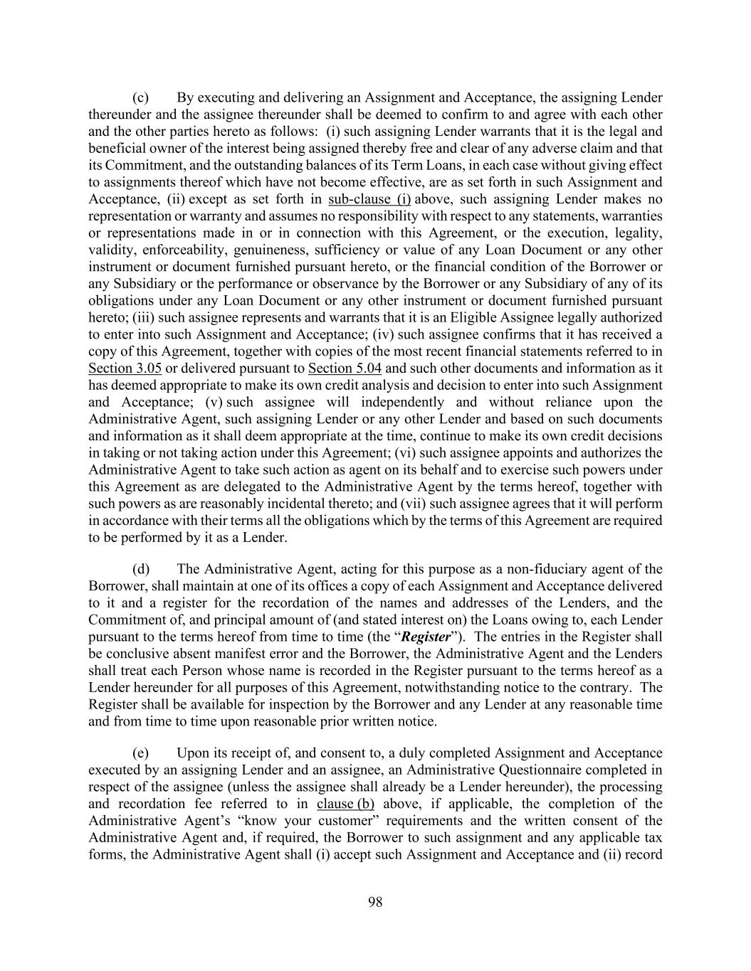 98 (c) By executing and delivering an Assignment and Acceptance, the assigning Lender thereunder and the assignee thereunder shall be deemed to confirm to and agree with each other and the other parties hereto as follows: (i) such assigning Lender warrants that it is the legal and beneficial owner of the interest being assigned thereby free and clear of any adverse claim and that its Commitment, and the outstanding balances of its Term Loans, in each case without giving effect to assignments thereof which have not become effective, are as set forth in such Assignment and Acceptance, (ii) except as set forth in sub-clause (i) above, such assigning Lender makes no representation or warranty and assumes no responsibility with respect to any statements, warranties or representations made in or in connection with this Agreement, or the execution, legality, validity, enforceability, genuineness, sufficiency or value of any Loan Document or any other instrument or document furnished pursuant hereto, or the financial condition of the Borrower or any Subsidiary or the performance or observance by the Borrower or any Subsidiary of any of its obligations under any Loan Document or any other instrument or document furnished pursuant hereto; (iii) such assignee represents and warrants that it is an Eligible Assignee legally authorized to enter into such Assignment and Acceptance; (iv) such assignee confirms that it has received a copy of this Agreement, together with copies of the most recent financial statements referred to in Section 3.05 or delivered pursuant to Section 5.04 and such other documents and information as it has deemed appropriate to make its own credit analysis and decision to enter into such Assignment and Acceptance; (v) such assignee will independently and without reliance upon the Administrative Agent, such assigning Lender or any other Lender and based on such documents and information as it shall deem appropriate at the time, continue to make its own credit decisions in taking or not taking action under this Agreement; (vi) such assignee appoints and authorizes the Administrative Agent to take such action as agent on its behalf and to exercise such powers under this Agreement as are delegated to the Administrative Agent by the terms hereof, together with such powers as are reasonably incidental thereto; and (vii) such assignee agrees that it will perform in accordance with their terms all the obligations which by the terms of this Agreement are required to be performed by it as a Lender. (d) The Administrative Agent, acting for this purpose as a non-fiduciary agent of the Borrower, shall maintain at one of its offices a copy of each Assignment and Acceptance delivered to it and a register for the recordation of the names and addresses of the Lenders, and the Commitment of, and principal amount of (and stated interest on) the Loans owing to, each Lender pursuant to the terms hereof from time to time (the “Register”). The entries in the Register shall be conclusive absent manifest error and the Borrower, the Administrative Agent and the Lenders shall treat each Person whose name is recorded in the Register pursuant to the terms hereof as a Lender hereunder for all purposes of this Agreement, notwithstanding notice to the contrary. The Register shall be available for inspection by the Borrower and any Lender at any reasonable time and from time to time upon reasonable prior written notice. (e) Upon its receipt of, and consent to, a duly completed Assignment and Acceptance executed by an assigning Lender and an assignee, an Administrative Questionnaire completed in respect of the assignee (unless the assignee shall already be a Lender hereunder), the processing and recordation fee referred to in clause (b) above, if applicable, the completion of the Administrative Agent’s “know your customer” requirements and the written consent of the Administrative Agent and, if required, the Borrower to such assignment and any applicable tax forms, the Administrative Agent shall (i) accept such Assignment and Acceptance and (ii) record