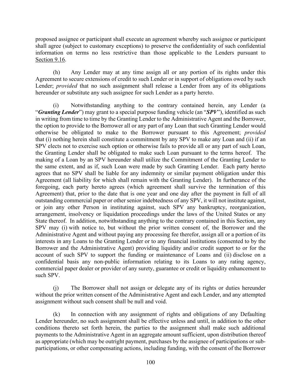 100 proposed assignee or participant shall execute an agreement whereby such assignee or participant shall agree (subject to customary exceptions) to preserve the confidentiality of such confidential information on terms no less restrictive than those applicable to the Lenders pursuant to Section 9.16. (h) Any Lender may at any time assign all or any portion of its rights under this Agreement to secure extensions of credit to such Lender or in support of obligations owed by such Lender; provided that no such assignment shall release a Lender from any of its obligations hereunder or substitute any such assignee for such Lender as a party hereto. (i) Notwithstanding anything to the contrary contained herein, any Lender (a “Granting Lender”) may grant to a special purpose funding vehicle (an “SPV”), identified as such in writing from time to time by the Granting Lender to the Administrative Agent and the Borrower, the option to provide to the Borrower all or any part of any Loan that such Granting Lender would otherwise be obligated to make to the Borrower pursuant to this Agreement; provided that (i) nothing herein shall constitute a commitment by any SPV to make any Loan and (ii) if an SPV elects not to exercise such option or otherwise fails to provide all or any part of such Loan, the Granting Lender shall be obligated to make such Loan pursuant to the terms hereof. The making of a Loan by an SPV hereunder shall utilize the Commitment of the Granting Lender to the same extent, and as if, such Loan were made by such Granting Lender. Each party hereto agrees that no SPV shall be liable for any indemnity or similar payment obligation under this Agreement (all liability for which shall remain with the Granting Lender). In furtherance of the foregoing, each party hereto agrees (which agreement shall survive the termination of this Agreement) that, prior to the date that is one year and one day after the payment in full of all outstanding commercial paper or other senior indebtedness of any SPV, it will not institute against, or join any other Person in instituting against, such SPV any bankruptcy, reorganization, arrangement, insolvency or liquidation proceedings under the laws of the United States or any State thereof. In addition, notwithstanding anything to the contrary contained in this Section, any SPV may (i) with notice to, but without the prior written consent of, the Borrower and the Administrative Agent and without paying any processing fee therefor, assign all or a portion of its interests in any Loans to the Granting Lender or to any financial institutions (consented to by the Borrower and the Administrative Agent) providing liquidity and/or credit support to or for the account of such SPV to support the funding or maintenance of Loans and (ii) disclose on a confidential basis any non-public information relating to its Loans to any rating agency, commercial paper dealer or provider of any surety, guarantee or credit or liquidity enhancement to such SPV. (j) The Borrower shall not assign or delegate any of its rights or duties hereunder without the prior written consent of the Administrative Agent and each Lender, and any attempted assignment without such consent shall be null and void. (k) In connection with any assignment of rights and obligations of any Defaulting Lender hereunder, no such assignment shall be effective unless and until, in addition to the other conditions thereto set forth herein, the parties to the assignment shall make such additional payments to the Administrative Agent in an aggregate amount sufficient, upon distribution thereof as appropriate (which may be outright payment, purchases by the assignee of participations or sub- participations, or other compensating actions, including funding, with the consent of the Borrower