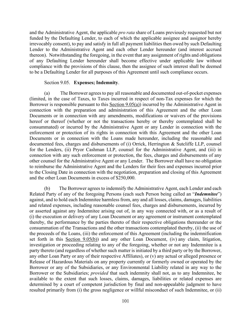 101 and the Administrative Agent, the applicable pro rata share of Loans previously requested but not funded by the Defaulting Lender, to each of which the applicable assignee and assignor hereby irrevocably consent), to pay and satisfy in full all payment liabilities then owed by such Defaulting Lender to the Administrative Agent and each other Lender hereunder (and interest accrued thereon). Notwithstanding the foregoing, in the event that any assignment of rights and obligations of any Defaulting Lender hereunder shall become effective under applicable law without compliance with the provisions of this clause, then the assignee of such interest shall be deemed to be a Defaulting Lender for all purposes of this Agreement until such compliance occurs. Section 9.05. Expenses; Indemnity. (a) The Borrower agrees to pay all reasonable and documented out-of-pocket expenses (limited, in the case of Taxes, to Taxes incurred in respect of non-Tax expenses for which the Borrower is responsible pursuant to this Section 9.05(a)) incurred by the Administrative Agent in connection with the preparation and administration of this Agreement and the other Loan Documents or in connection with any amendments, modifications or waivers of the provisions hereof or thereof (whether or not the transactions hereby or thereby contemplated shall be consummated) or incurred by the Administrative Agent or any Lender in connection with the enforcement or protection of its rights in connection with this Agreement and the other Loan Documents or in connection with the Loans made hereunder, including the reasonable and documented fees, charges and disbursements of (i) Orrick, Herrington & Sutcliffe LLP, counsel for the Lenders, (ii) Pryor Cashman LLP, counsel for the Administrative Agent, and (iii) in connection with any such enforcement or protection, the fees, charges and disbursements of any other counsel for the Administrative Agent or any Lender. The Borrower shall have no obligation to reimburse the Administrative Agent and the Lenders for their fees and expenses incurred prior to the Closing Date in connection with the negotiation, preparation and closing of this Agreement and the other Loan Documents in excess of $250,000. (b) The Borrower agrees to indemnify the Administrative Agent, each Lender and each Related Party of any of the foregoing Persons (each such Person being called an “Indemnitee”) against, and to hold each Indemnitee harmless from, any and all losses, claims, damages, liabilities and related expenses, including reasonable counsel fees, charges and disbursements, incurred by or asserted against any Indemnitee arising out of, in any way connected with, or as a result of (i) the execution or delivery of any Loan Document or any agreement or instrument contemplated thereby, the performance by the parties thereto of their respective obligations thereunder or the consummation of the Transactions and the other transactions contemplated thereby, (ii) the use of the proceeds of the Loans, (iii) the enforcement of this Agreement (including the indemnification set forth in this Section 9.05(b)) and any other Loan Document, (iv) any claim, litigation, investigation or proceeding relating to any of the foregoing, whether or not any Indemnitee is a party thereto (and regardless of whether such matter is initiated by a third party or by the Borrower, any other Loan Party or any of their respective Affiliates), or (v) any actual or alleged presence or Release of Hazardous Materials on any property currently or formerly owned or operated by the Borrower or any of the Subsidiaries, or any Environmental Liability related in any way to the Borrower or the Subsidiaries; provided that such indemnity shall not, as to any Indemnitee, be available to the extent that such losses, claims, damages, liabilities or related expenses are determined by a court of competent jurisdiction by final and non-appealable judgment to have resulted primarily from (i) the gross negligence or willful misconduct of such Indemnitee, or (ii)