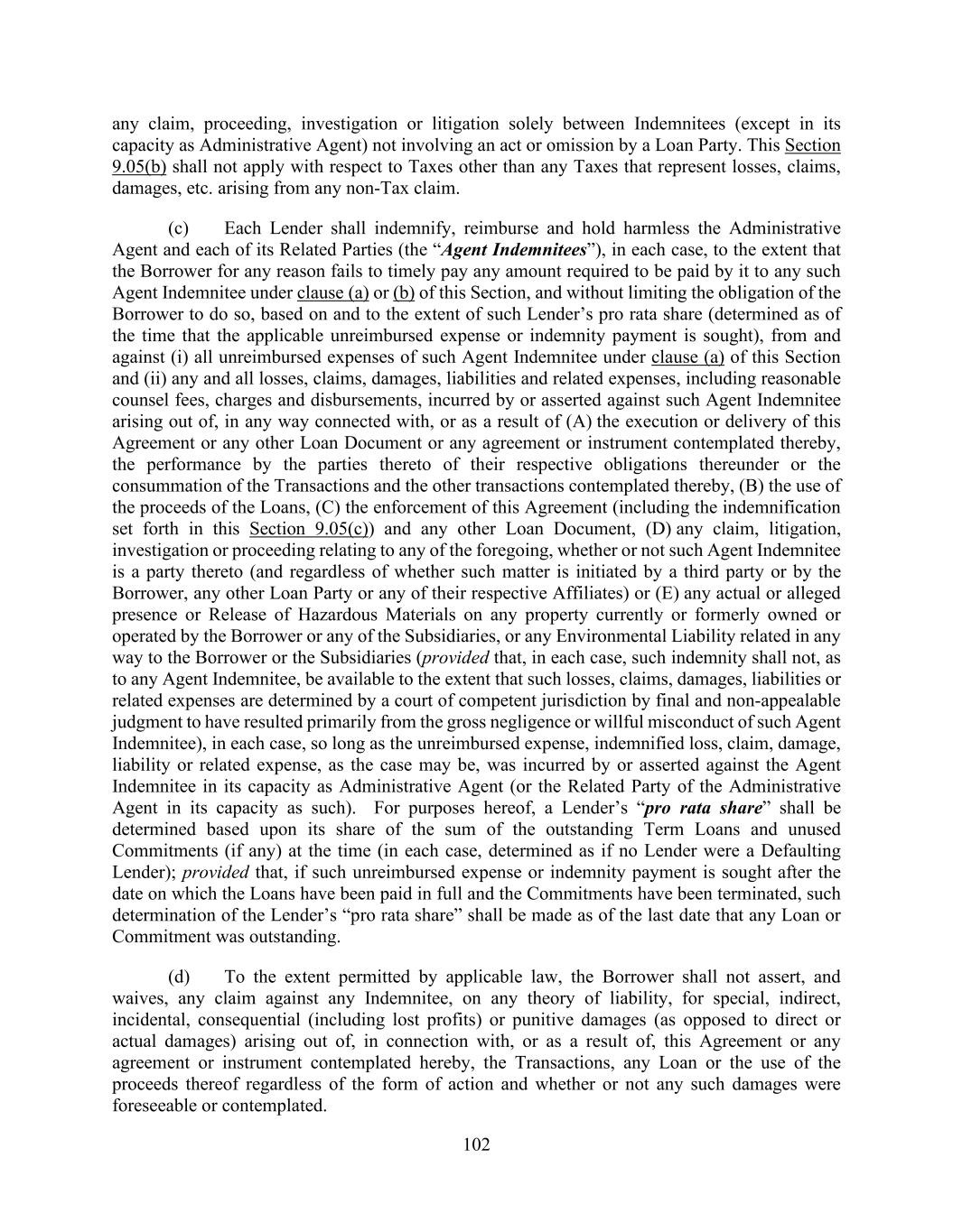 102 any claim, proceeding, investigation or litigation solely between Indemnitees (except in its capacity as Administrative Agent) not involving an act or omission by a Loan Party. This Section 9.05(b) shall not apply with respect to Taxes other than any Taxes that represent losses, claims, damages, etc. arising from any non-Tax claim. (c) Each Lender shall indemnify, reimburse and hold harmless the Administrative Agent and each of its Related Parties (the “Agent Indemnitees”), in each case, to the extent that the Borrower for any reason fails to timely pay any amount required to be paid by it to any such Agent Indemnitee under clause (a) or (b) of this Section, and without limiting the obligation of the Borrower to do so, based on and to the extent of such Lender’s pro rata share (determined as of the time that the applicable unreimbursed expense or indemnity payment is sought), from and against (i) all unreimbursed expenses of such Agent Indemnitee under clause (a) of this Section and (ii) any and all losses, claims, damages, liabilities and related expenses, including reasonable counsel fees, charges and disbursements, incurred by or asserted against such Agent Indemnitee arising out of, in any way connected with, or as a result of (A) the execution or delivery of this Agreement or any other Loan Document or any agreement or instrument contemplated thereby, the performance by the parties thereto of their respective obligations thereunder or the consummation of the Transactions and the other transactions contemplated thereby, (B) the use of the proceeds of the Loans, (C) the enforcement of this Agreement (including the indemnification set forth in this Section 9.05(c)) and any other Loan Document, (D) any claim, litigation, investigation or proceeding relating to any of the foregoing, whether or not such Agent Indemnitee is a party thereto (and regardless of whether such matter is initiated by a third party or by the Borrower, any other Loan Party or any of their respective Affiliates) or (E) any actual or alleged presence or Release of Hazardous Materials on any property currently or formerly owned or operated by the Borrower or any of the Subsidiaries, or any Environmental Liability related in any way to the Borrower or the Subsidiaries (provided that, in each case, such indemnity shall not, as to any Agent Indemnitee, be available to the extent that such losses, claims, damages, liabilities or related expenses are determined by a court of competent jurisdiction by final and non-appealable judgment to have resulted primarily from the gross negligence or willful misconduct of such Agent Indemnitee), in each case, so long as the unreimbursed expense, indemnified loss, claim, damage, liability or related expense, as the case may be, was incurred by or asserted against the Agent Indemnitee in its capacity as Administrative Agent (or the Related Party of the Administrative Agent in its capacity as such). For purposes hereof, a Lender’s “pro rata share” shall be determined based upon its share of the sum of the outstanding Term Loans and unused Commitments (if any) at the time (in each case, determined as if no Lender were a Defaulting Lender); provided that, if such unreimbursed expense or indemnity payment is sought after the date on which the Loans have been paid in full and the Commitments have been terminated, such determination of the Lender’s “pro rata share” shall be made as of the last date that any Loan or Commitment was outstanding. (d) To the extent permitted by applicable law, the Borrower shall not assert, and waives, any claim against any Indemnitee, on any theory of liability, for special, indirect, incidental, consequential (including lost profits) or punitive damages (as opposed to direct or actual damages) arising out of, in connection with, or as a result of, this Agreement or any agreement or instrument contemplated hereby, the Transactions, any Loan or the use of the proceeds thereof regardless of the form of action and whether or not any such damages were foreseeable or contemplated.