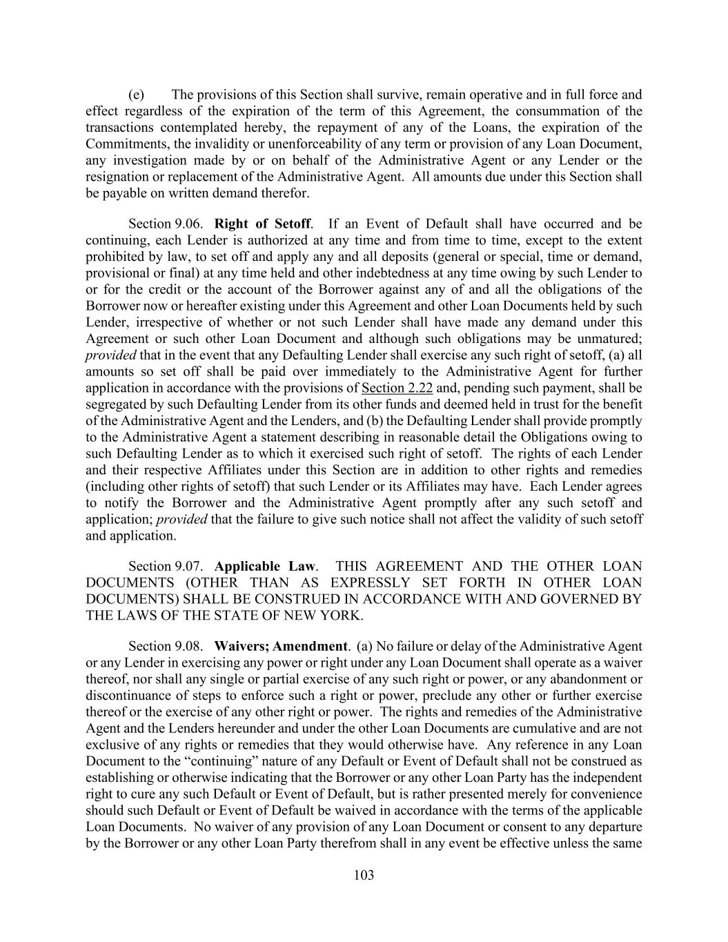 103 (e) The provisions of this Section shall survive, remain operative and in full force and effect regardless of the expiration of the term of this Agreement, the consummation of the transactions contemplated hereby, the repayment of any of the Loans, the expiration of the Commitments, the invalidity or unenforceability of any term or provision of any Loan Document, any investigation made by or on behalf of the Administrative Agent or any Lender or the resignation or replacement of the Administrative Agent. All amounts due under this Section shall be payable on written demand therefor. Section 9.06. Right of Setoff. If an Event of Default shall have occurred and be continuing, each Lender is authorized at any time and from time to time, except to the extent prohibited by law, to set off and apply any and all deposits (general or special, time or demand, provisional or final) at any time held and other indebtedness at any time owing by such Lender to or for the credit or the account of the Borrower against any of and all the obligations of the Borrower now or hereafter existing under this Agreement and other Loan Documents held by such Lender, irrespective of whether or not such Lender shall have made any demand under this Agreement or such other Loan Document and although such obligations may be unmatured; provided that in the event that any Defaulting Lender shall exercise any such right of setoff, (a) all amounts so set off shall be paid over immediately to the Administrative Agent for further application in accordance with the provisions of Section 2.22 and, pending such payment, shall be segregated by such Defaulting Lender from its other funds and deemed held in trust for the benefit of the Administrative Agent and the Lenders, and (b) the Defaulting Lender shall provide promptly to the Administrative Agent a statement describing in reasonable detail the Obligations owing to such Defaulting Lender as to which it exercised such right of setoff. The rights of each Lender and their respective Affiliates under this Section are in addition to other rights and remedies (including other rights of setoff) that such Lender or its Affiliates may have. Each Lender agrees to notify the Borrower and the Administrative Agent promptly after any such setoff and application; provided that the failure to give such notice shall not affect the validity of such setoff and application. Section 9.07. Applicable Law. THIS AGREEMENT AND THE OTHER LOAN DOCUMENTS (OTHER THAN AS EXPRESSLY SET FORTH IN OTHER LOAN DOCUMENTS) SHALL BE CONSTRUED IN ACCORDANCE WITH AND GOVERNED BY THE LAWS OF THE STATE OF NEW YORK. Section 9.08. Waivers; Amendment. (a) No failure or delay of the Administrative Agent or any Lender in exercising any power or right under any Loan Document shall operate as a waiver thereof, nor shall any single or partial exercise of any such right or power, or any abandonment or discontinuance of steps to enforce such a right or power, preclude any other or further exercise thereof or the exercise of any other right or power. The rights and remedies of the Administrative Agent and the Lenders hereunder and under the other Loan Documents are cumulative and are not exclusive of any rights or remedies that they would otherwise have. Any reference in any Loan Document to the “continuing” nature of any Default or Event of Default shall not be construed as establishing or otherwise indicating that the Borrower or any other Loan Party has the independent right to cure any such Default or Event of Default, but is rather presented merely for convenience should such Default or Event of Default be waived in accordance with the terms of the applicable Loan Documents. No waiver of any provision of any Loan Document or consent to any departure by the Borrower or any other Loan Party therefrom shall in any event be effective unless the same