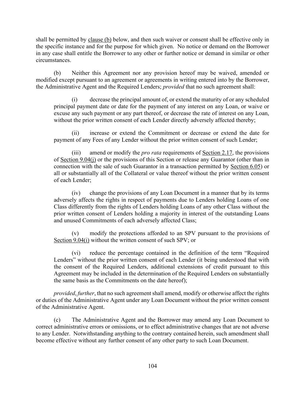 104 shall be permitted by clause (b) below, and then such waiver or consent shall be effective only in the specific instance and for the purpose for which given. No notice or demand on the Borrower in any case shall entitle the Borrower to any other or further notice or demand in similar or other circumstances. (b) Neither this Agreement nor any provision hereof may be waived, amended or modified except pursuant to an agreement or agreements in writing entered into by the Borrower, the Administrative Agent and the Required Lenders; provided that no such agreement shall: (i) decrease the principal amount of, or extend the maturity of or any scheduled principal payment date or date for the payment of any interest on any Loan, or waive or excuse any such payment or any part thereof, or decrease the rate of interest on any Loan, without the prior written consent of each Lender directly adversely affected thereby; (ii) increase or extend the Commitment or decrease or extend the date for payment of any Fees of any Lender without the prior written consent of such Lender; (iii) amend or modify the pro rata requirements of Section 2.17, the provisions of Section 9.04(j) or the provisions of this Section or release any Guarantor (other than in connection with the sale of such Guarantor in a transaction permitted by Section 6.05) or all or substantially all of the Collateral or value thereof without the prior written consent of each Lender; (iv) change the provisions of any Loan Document in a manner that by its terms adversely affects the rights in respect of payments due to Lenders holding Loans of one Class differently from the rights of Lenders holding Loans of any other Class without the prior written consent of Lenders holding a majority in interest of the outstanding Loans and unused Commitments of each adversely affected Class; (v) modify the protections afforded to an SPV pursuant to the provisions of Section 9.04(i) without the written consent of such SPV; or (vi) reduce the percentage contained in the definition of the term “Required Lenders” without the prior written consent of each Lender (it being understood that with the consent of the Required Lenders, additional extensions of credit pursuant to this Agreement may be included in the determination of the Required Lenders on substantially the same basis as the Commitments on the date hereof); provided, further, that no such agreement shall amend, modify or otherwise affect the rights or duties of the Administrative Agent under any Loan Document without the prior written consent of the Administrative Agent. (c) The Administrative Agent and the Borrower may amend any Loan Document to correct administrative errors or omissions, or to effect administrative changes that are not adverse to any Lender. Notwithstanding anything to the contrary contained herein, such amendment shall become effective without any further consent of any other party to such Loan Document.
