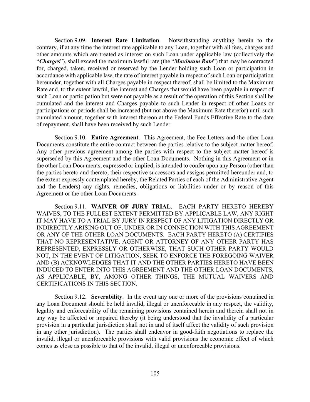 105 Section 9.09. Interest Rate Limitation. Notwithstanding anything herein to the contrary, if at any time the interest rate applicable to any Loan, together with all fees, charges and other amounts which are treated as interest on such Loan under applicable law (collectively the “Charges”), shall exceed the maximum lawful rate (the “Maximum Rate”) that may be contracted for, charged, taken, received or reserved by the Lender holding such Loan or participation in accordance with applicable law, the rate of interest payable in respect of such Loan or participation hereunder, together with all Charges payable in respect thereof, shall be limited to the Maximum Rate and, to the extent lawful, the interest and Charges that would have been payable in respect of such Loan or participation but were not payable as a result of the operation of this Section shall be cumulated and the interest and Charges payable to such Lender in respect of other Loans or participations or periods shall be increased (but not above the Maximum Rate therefor) until such cumulated amount, together with interest thereon at the Federal Funds Effective Rate to the date of repayment, shall have been received by such Lender. Section 9.10. Entire Agreement. This Agreement, the Fee Letters and the other Loan Documents constitute the entire contract between the parties relative to the subject matter hereof. Any other previous agreement among the parties with respect to the subject matter hereof is superseded by this Agreement and the other Loan Documents. Nothing in this Agreement or in the other Loan Documents, expressed or implied, is intended to confer upon any Person (other than the parties hereto and thereto, their respective successors and assigns permitted hereunder and, to the extent expressly contemplated hereby, the Related Parties of each of the Administrative Agent and the Lenders) any rights, remedies, obligations or liabilities under or by reason of this Agreement or the other Loan Documents. Section 9.11. WAIVER OF JURY TRIAL. EACH PARTY HERETO HEREBY WAIVES, TO THE FULLEST EXTENT PERMITTED BY APPLICABLE LAW, ANY RIGHT IT MAY HAVE TO A TRIAL BY JURY IN RESPECT OF ANY LITIGATION DIRECTLY OR INDIRECTLY ARISING OUT OF, UNDER OR IN CONNECTION WITH THIS AGREEMENT OR ANY OF THE OTHER LOAN DOCUMENTS. EACH PARTY HERETO (A) CERTIFIES THAT NO REPRESENTATIVE, AGENT OR ATTORNEY OF ANY OTHER PARTY HAS REPRESENTED, EXPRESSLY OR OTHERWISE, THAT SUCH OTHER PARTY WOULD NOT, IN THE EVENT OF LITIGATION, SEEK TO ENFORCE THE FOREGOING WAIVER AND (B) ACKNOWLEDGES THAT IT AND THE OTHER PARTIES HERETO HAVE BEEN INDUCED TO ENTER INTO THIS AGREEMENT AND THE OTHER LOAN DOCUMENTS, AS APPLICABLE, BY, AMONG OTHER THINGS, THE MUTUAL WAIVERS AND CERTIFICATIONS IN THIS SECTION. Section 9.12. Severability. In the event any one or more of the provisions contained in any Loan Document should be held invalid, illegal or unenforceable in any respect, the validity, legality and enforceability of the remaining provisions contained herein and therein shall not in any way be affected or impaired thereby (it being understood that the invalidity of a particular provision in a particular jurisdiction shall not in and of itself affect the validity of such provision in any other jurisdiction). The parties shall endeavor in good-faith negotiations to replace the invalid, illegal or unenforceable provisions with valid provisions the economic effect of which comes as close as possible to that of the invalid, illegal or unenforceable provisions.