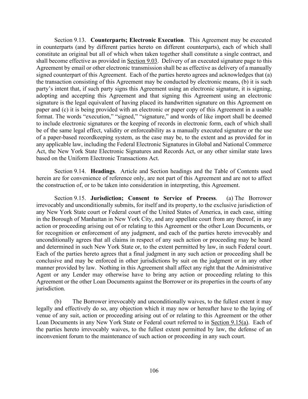 106 Section 9.13. Counterparts; Electronic Execution. This Agreement may be executed in counterparts (and by different parties hereto on different counterparts), each of which shall constitute an original but all of which when taken together shall constitute a single contract, and shall become effective as provided in Section 9.03. Delivery of an executed signature page to this Agreement by email or other electronic transmission shall be as effective as delivery of a manually signed counterpart of this Agreement. Each of the parties hereto agrees and acknowledges that (a) the transaction consisting of this Agreement may be conducted by electronic means, (b) it is such party’s intent that, if such party signs this Agreement using an electronic signature, it is signing, adopting and accepting this Agreement and that signing this Agreement using an electronic signature is the legal equivalent of having placed its handwritten signature on this Agreement on paper and (c) it is being provided with an electronic or paper copy of this Agreement in a usable format. The words “execution,” “signed,” “signature,” and words of like import shall be deemed to include electronic signatures or the keeping of records in electronic form, each of which shall be of the same legal effect, validity or enforceability as a manually executed signature or the use of a paper-based recordkeeping system, as the case may be, to the extent and as provided for in any applicable law, including the Federal Electronic Signatures in Global and National Commerce Act, the New York State Electronic Signatures and Records Act, or any other similar state laws based on the Uniform Electronic Transactions Act. Section 9.14. Headings. Article and Section headings and the Table of Contents used herein are for convenience of reference only, are not part of this Agreement and are not to affect the construction of, or to be taken into consideration in interpreting, this Agreement. Section 9.15. Jurisdiction; Consent to Service of Process. (a) The Borrower irrevocably and unconditionally submits, for itself and its property, to the exclusive jurisdiction of any New York State court or Federal court of the United States of America, in each case, sitting in the Borough of Manhattan in New York City, and any appellate court from any thereof, in any action or proceeding arising out of or relating to this Agreement or the other Loan Documents, or for recognition or enforcement of any judgment, and each of the parties hereto irrevocably and unconditionally agrees that all claims in respect of any such action or proceeding may be heard and determined in such New York State or, to the extent permitted by law, in such Federal court. Each of the parties hereto agrees that a final judgment in any such action or proceeding shall be conclusive and may be enforced in other jurisdictions by suit on the judgment or in any other manner provided by law. Nothing in this Agreement shall affect any right that the Administrative Agent or any Lender may otherwise have to bring any action or proceeding relating to this Agreement or the other Loan Documents against the Borrower or its properties in the courts of any jurisdiction. (b) The Borrower irrevocably and unconditionally waives, to the fullest extent it may legally and effectively do so, any objection which it may now or hereafter have to the laying of venue of any suit, action or proceeding arising out of or relating to this Agreement or the other Loan Documents in any New York State or Federal court referred to in Section 9.15(a). Each of the parties hereto irrevocably waives, to the fullest extent permitted by law, the defense of an inconvenient forum to the maintenance of such action or proceeding in any such court.