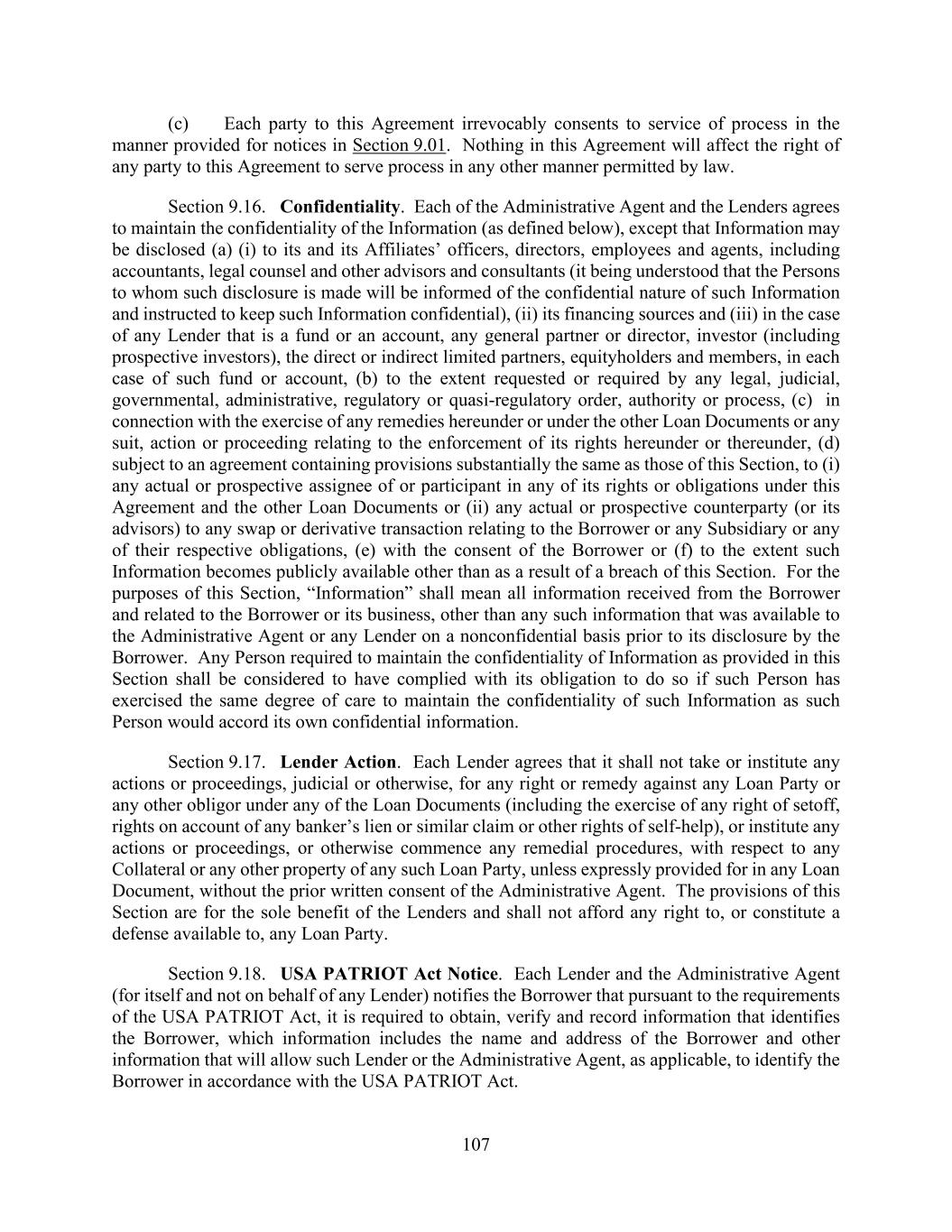 107 (c) Each party to this Agreement irrevocably consents to service of process in the manner provided for notices in Section 9.01. Nothing in this Agreement will affect the right of any party to this Agreement to serve process in any other manner permitted by law. Section 9.16. Confidentiality. Each of the Administrative Agent and the Lenders agrees to maintain the confidentiality of the Information (as defined below), except that Information may be disclosed (a) (i) to its and its Affiliates’ officers, directors, employees and agents, including accountants, legal counsel and other advisors and consultants (it being understood that the Persons to whom such disclosure is made will be informed of the confidential nature of such Information and instructed to keep such Information confidential), (ii) its financing sources and (iii) in the case of any Lender that is a fund or an account, any general partner or director, investor (including prospective investors), the direct or indirect limited partners, equityholders and members, in each case of such fund or account, (b) to the extent requested or required by any legal, judicial, governmental, administrative, regulatory or quasi-regulatory order, authority or process, (c) in connection with the exercise of any remedies hereunder or under the other Loan Documents or any suit, action or proceeding relating to the enforcement of its rights hereunder or thereunder, (d) subject to an agreement containing provisions substantially the same as those of this Section, to (i) any actual or prospective assignee of or participant in any of its rights or obligations under this Agreement and the other Loan Documents or (ii) any actual or prospective counterparty (or its advisors) to any swap or derivative transaction relating to the Borrower or any Subsidiary or any of their respective obligations, (e) with the consent of the Borrower or (f) to the extent such Information becomes publicly available other than as a result of a breach of this Section. For the purposes of this Section, “Information” shall mean all information received from the Borrower and related to the Borrower or its business, other than any such information that was available to the Administrative Agent or any Lender on a nonconfidential basis prior to its disclosure by the Borrower. Any Person required to maintain the confidentiality of Information as provided in this Section shall be considered to have complied with its obligation to do so if such Person has exercised the same degree of care to maintain the confidentiality of such Information as such Person would accord its own confidential information. Section 9.17. Lender Action. Each Lender agrees that it shall not take or institute any actions or proceedings, judicial or otherwise, for any right or remedy against any Loan Party or any other obligor under any of the Loan Documents (including the exercise of any right of setoff, rights on account of any banker’s lien or similar claim or other rights of self-help), or institute any actions or proceedings, or otherwise commence any remedial procedures, with respect to any Collateral or any other property of any such Loan Party, unless expressly provided for in any Loan Document, without the prior written consent of the Administrative Agent. The provisions of this Section are for the sole benefit of the Lenders and shall not afford any right to, or constitute a defense available to, any Loan Party. Section 9.18. USA PATRIOT Act Notice. Each Lender and the Administrative Agent (for itself and not on behalf of any Lender) notifies the Borrower that pursuant to the requirements of the USA PATRIOT Act, it is required to obtain, verify and record information that identifies the Borrower, which information includes the name and address of the Borrower and other information that will allow such Lender or the Administrative Agent, as applicable, to identify the Borrower in accordance with the USA PATRIOT Act.