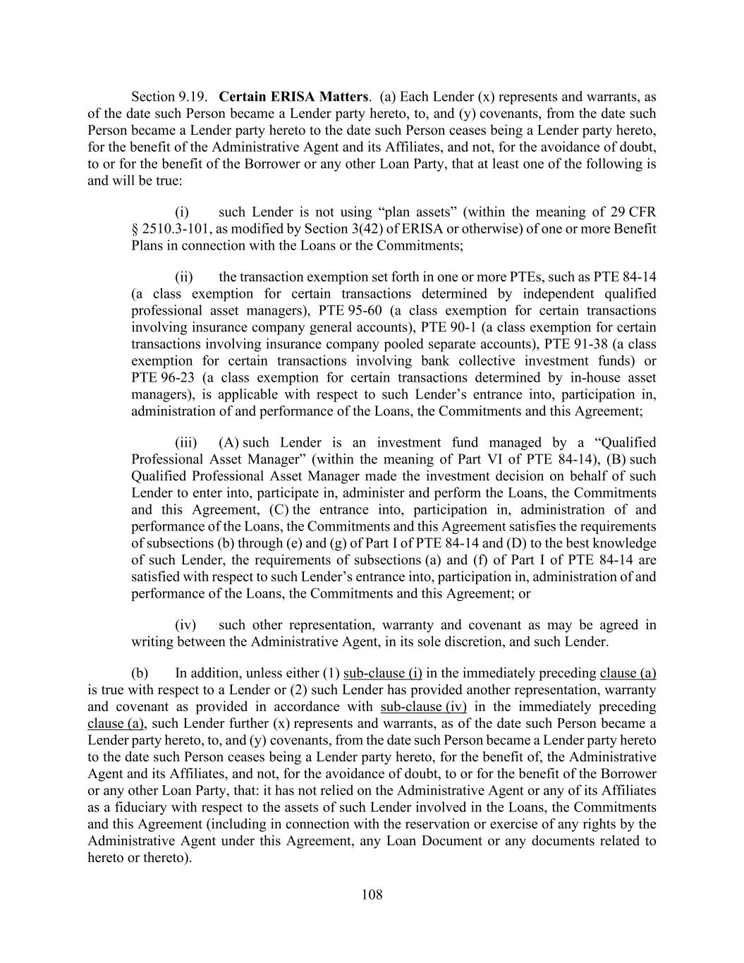 108 Section 9.19. Certain ERISA Matters. (a) Each Lender (x) represents and warrants, as of the date such Person became a Lender party hereto, to, and (y) covenants, from the date such Person became a Lender party hereto to the date such Person ceases being a Lender party hereto, for the benefit of the Administrative Agent and its Affiliates, and not, for the avoidance of doubt, to or for the benefit of the Borrower or any other Loan Party, that at least one of the following is and will be true: (i) such Lender is not using “plan assets” (within the meaning of 29 CFR § 2510.3-101, as modified by Section 3(42) of ERISA or otherwise) of one or more Benefit Plans in connection with the Loans or the Commitments; (ii) the transaction exemption set forth in one or more PTEs, such as PTE 84-14 (a class exemption for certain transactions determined by independent qualified professional asset managers), PTE 95-60 (a class exemption for certain transactions involving insurance company general accounts), PTE 90-1 (a class exemption for certain transactions involving insurance company pooled separate accounts), PTE 91-38 (a class exemption for certain transactions involving bank collective investment funds) or PTE 96-23 (a class exemption for certain transactions determined by in-house asset managers), is applicable with respect to such Lender’s entrance into, participation in, administration of and performance of the Loans, the Commitments and this Agreement; (iii) (A) such Lender is an investment fund managed by a “Qualified Professional Asset Manager” (within the meaning of Part VI of PTE 84-14), (B) such Qualified Professional Asset Manager made the investment decision on behalf of such Lender to enter into, participate in, administer and perform the Loans, the Commitments and this Agreement, (C) the entrance into, participation in, administration of and performance of the Loans, the Commitments and this Agreement satisfies the requirements of subsections (b) through (e) and (g) of Part I of PTE 84-14 and (D) to the best knowledge of such Lender, the requirements of subsections (a) and (f) of Part I of PTE 84-14 are satisfied with respect to such Lender’s entrance into, participation in, administration of and performance of the Loans, the Commitments and this Agreement; or (iv) such other representation, warranty and covenant as may be agreed in writing between the Administrative Agent, in its sole discretion, and such Lender. (b) In addition, unless either (1) sub-clause (i) in the immediately preceding clause (a) is true with respect to a Lender or (2) such Lender has provided another representation, warranty and covenant as provided in accordance with sub-clause (iv) in the immediately preceding clause (a), such Lender further (x) represents and warrants, as of the date such Person became a Lender party hereto, to, and (y) covenants, from the date such Person became a Lender party hereto to the date such Person ceases being a Lender party hereto, for the benefit of, the Administrative Agent and its Affiliates, and not, for the avoidance of doubt, to or for the benefit of the Borrower or any other Loan Party, that: it has not relied on the Administrative Agent or any of its Affiliates as a fiduciary with respect to the assets of such Lender involved in the Loans, the Commitments and this Agreement (including in connection with the reservation or exercise of any rights by the Administrative Agent under this Agreement, any Loan Document or any documents related to hereto or thereto).