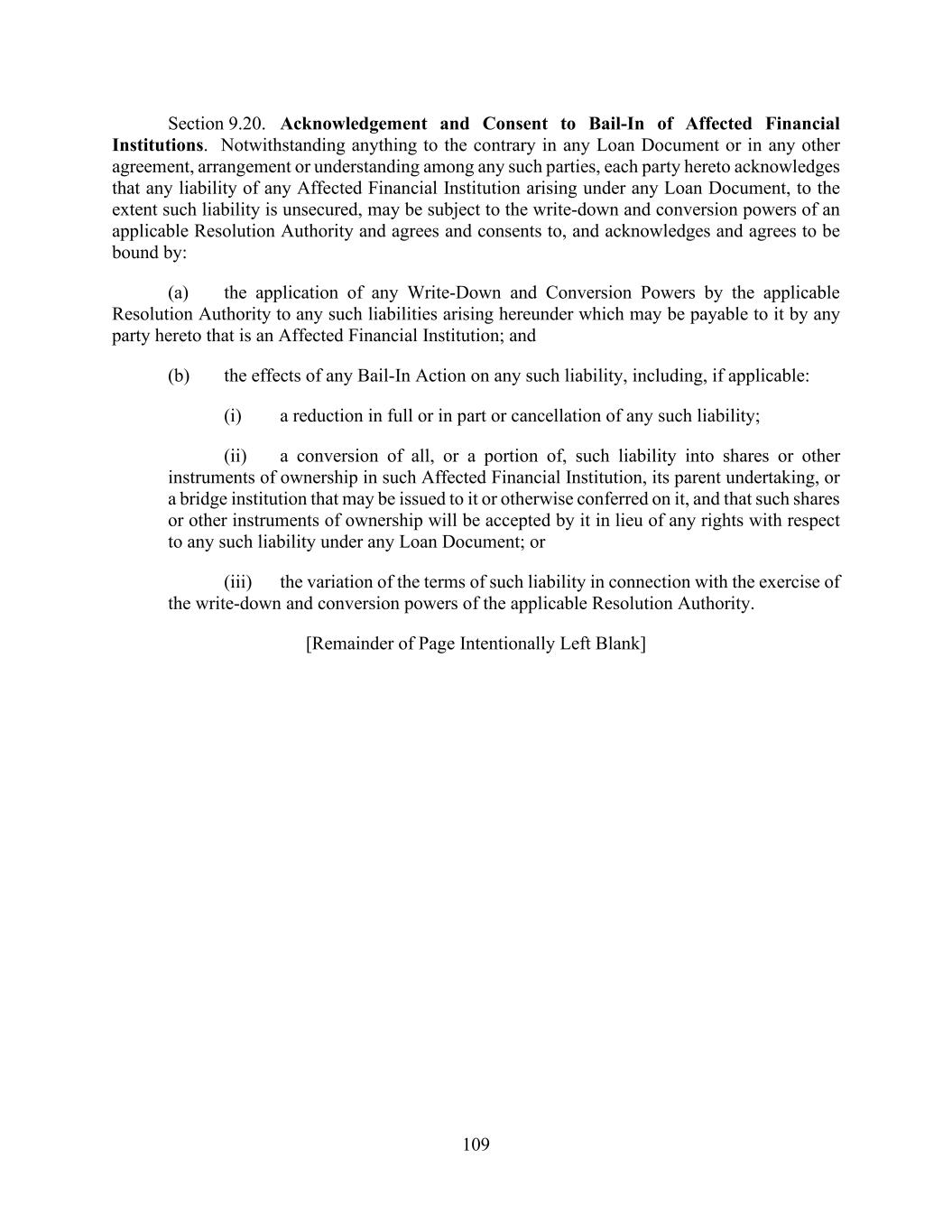 109 Section 9.20. Acknowledgement and Consent to Bail-In of Affected Financial Institutions. Notwithstanding anything to the contrary in any Loan Document or in any other agreement, arrangement or understanding among any such parties, each party hereto acknowledges that any liability of any Affected Financial Institution arising under any Loan Document, to the extent such liability is unsecured, may be subject to the write-down and conversion powers of an applicable Resolution Authority and agrees and consents to, and acknowledges and agrees to be bound by: (a) the application of any Write-Down and Conversion Powers by the applicable Resolution Authority to any such liabilities arising hereunder which may be payable to it by any party hereto that is an Affected Financial Institution; and (b) the effects of any Bail-In Action on any such liability, including, if applicable: (i) a reduction in full or in part or cancellation of any such liability; (ii) a conversion of all, or a portion of, such liability into shares or other instruments of ownership in such Affected Financial Institution, its parent undertaking, or a bridge institution that may be issued to it or otherwise conferred on it, and that such shares or other instruments of ownership will be accepted by it in lieu of any rights with respect to any such liability under any Loan Document; or (iii) the variation of the terms of such liability in connection with the exercise of the write-down and conversion powers of the applicable Resolution Authority. [Remainder of Page Intentionally Left Blank]