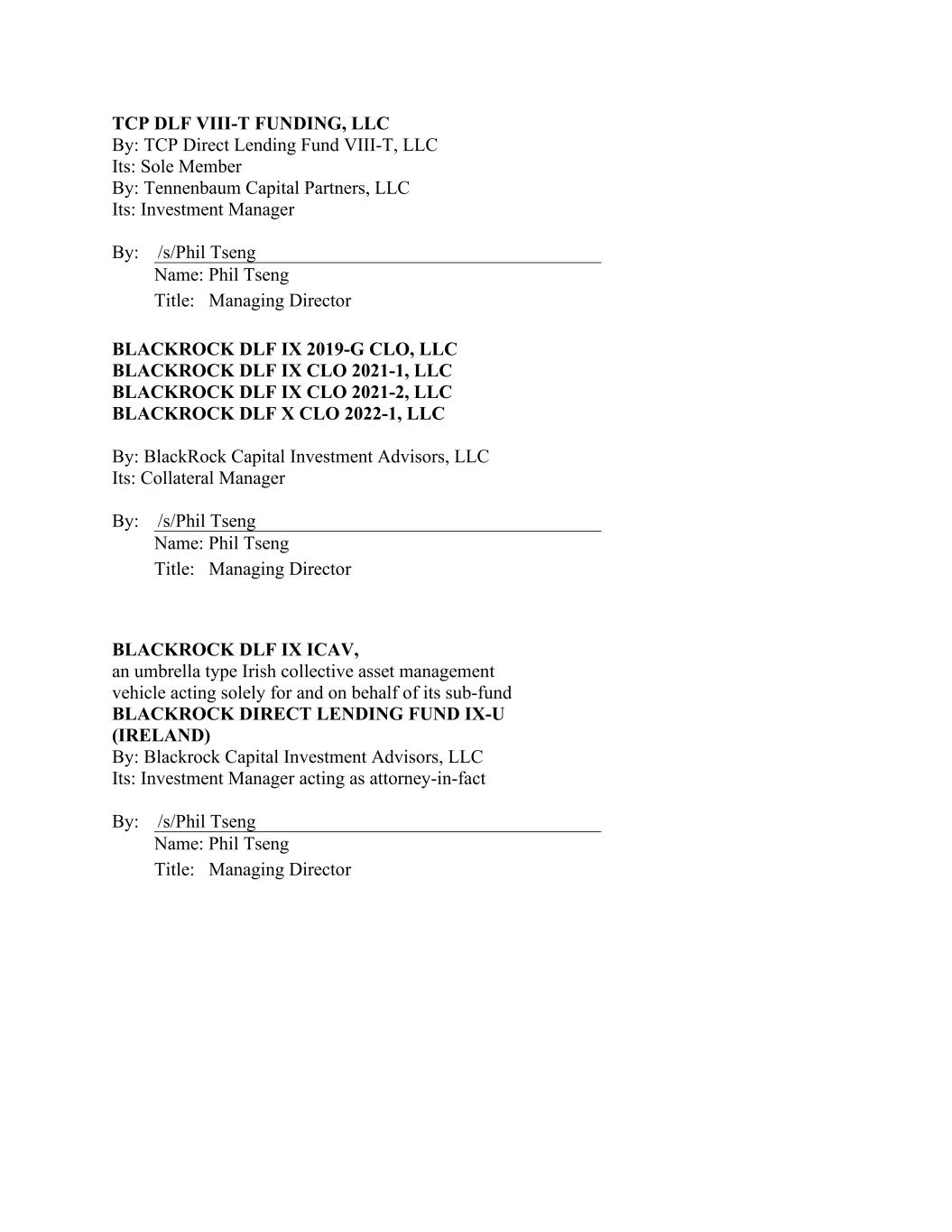TCP DLF VIII-T FUNDING, LLC By: TCP Direct Lending Fund VIII-T, LLC Its: Sole Member By: Tennenbaum Capital Partners, LLC Its: Investment Manager BLACKROCK DLF IX 2019-G CLO, LLC BLACKROCK DLF IX CLO 2021-1, LLC BLACKROCK DLF IX CLO 2021-2, LLC BLACKROCK DLF X CLO 2022-1, LLC By: BlackRock Capital Investment Advisors, LLC Its: Collateral Manager BLACKROCK DLF IX ICAV, an umbrella type Irish collective asset management vehicle acting solely for and on behalf of its sub-fund BLACKROCK DIRECT LENDING FUND IX-U (IRELAND) By: Blackrock Capital Investment Advisors, LLC Its: Investment Manager acting as attorney-in-fact By: /s/Phil Tseng Name: Phil Tseng Title: Managing Director By: /s/Phil Tseng Name: Phil Tseng Title: Managing Director By: /s/Phil Tseng Name: Phil Tseng Title: Managing Director