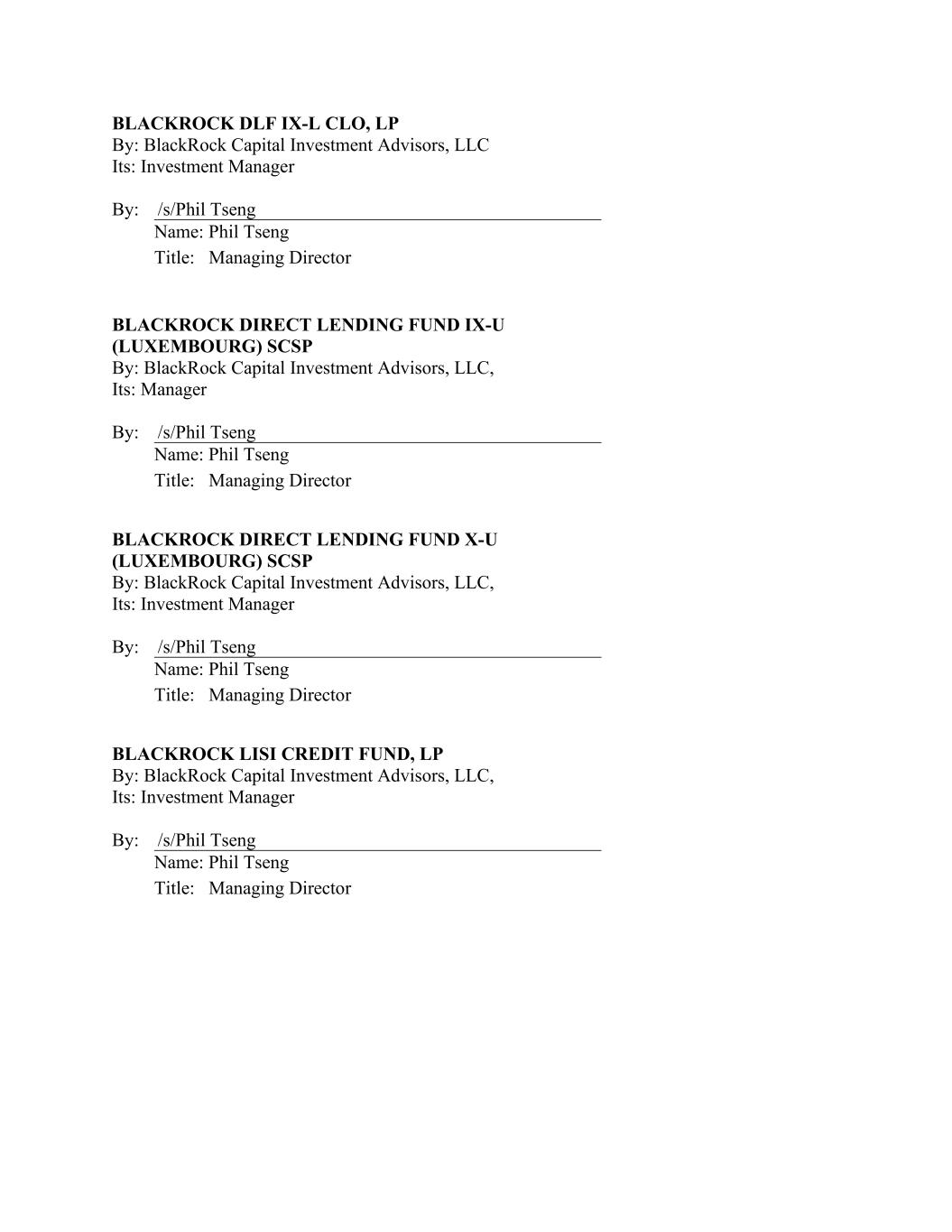 BLACKROCK DLF IX-L CLO, LP By: BlackRock Capital Investment Advisors, LLC Its: Investment Manager BLACKROCK DIRECT LENDING FUND IX-U (LUXEMBOURG) SCSP By: BlackRock Capital Investment Advisors, LLC, Its: Manager BLACKROCK DIRECT LENDING FUND X-U (LUXEMBOURG) SCSP By: BlackRock Capital Investment Advisors, LLC, Its: Investment Manager BLACKROCK LISI CREDIT FUND, LP By: BlackRock Capital Investment Advisors, LLC, Its: Investment Manager By: /s/Phil Tseng Name: Phil Tseng Title: Managing Director By: /s/Phil Tseng Name: Phil Tseng Title: Managing Director By: /s/Phil Tseng Name: Phil Tseng Title: Managing Director By: /s/Phil Tseng Name: Phil Tseng Title: Managing Director